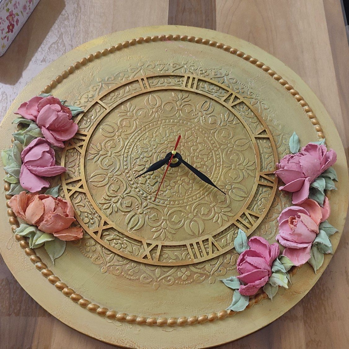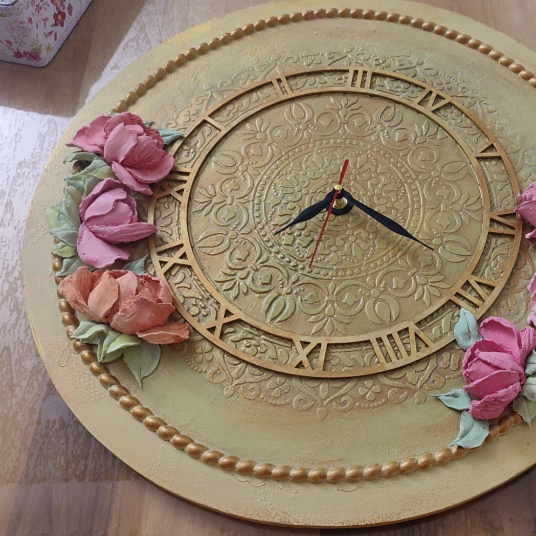 ساعت دیواری ترکیب استاکو و پتینه خاص و متفاوت مناسب برای عروس خانمهای گل قابل سفارش در رنگ دلخواه شما مناسب با دکوراسیون منزلتون قابل سفارش جاکلیدی جادستمال کاغذی و... بصورت ست