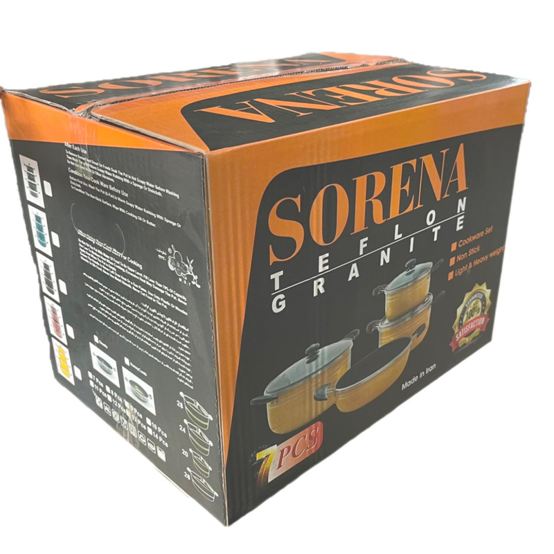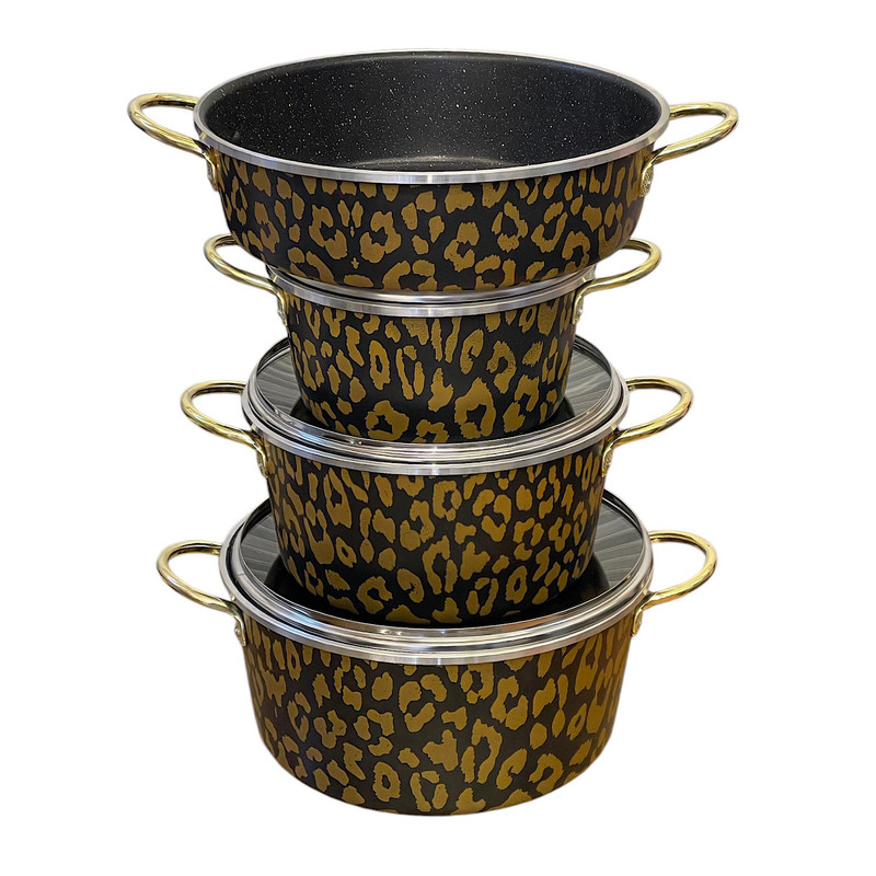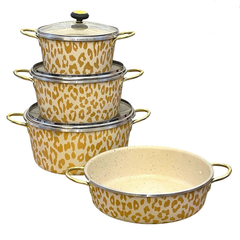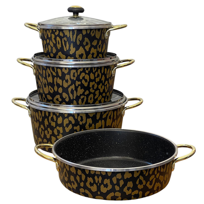 سرویس ۷ پارچه پلنگی شامل سه قابلمه در سایز های ۲۰ و ۲۴ و ۲۸ و یک ماهیتابه در سایز ۲۸ به همراه سه درب می باشد و تمامی قسمت های داخلی و بیرونی ظروف با گرانیت سه لایه پوشش داده شده است دسته های فلزی طلایی رنگ و قپه طلایی به زیبایی این سرویس اضافه میکند