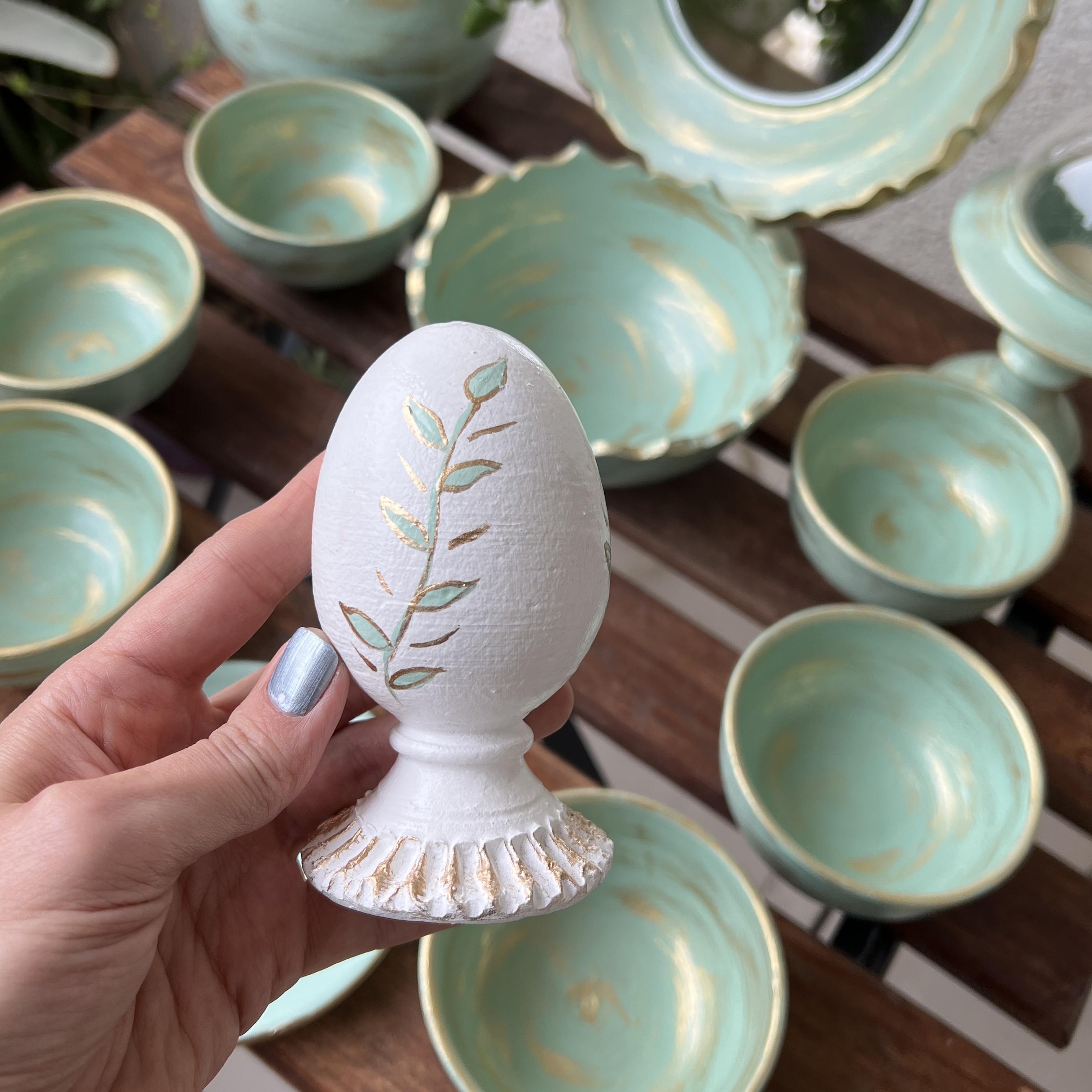 قطر دهانه 6 تا کاسه دهانه 10سانتیمتر،یک عدد کاسه دهانه 14سانتیمتر،قطر آینه 20سانتیمتر،یک عدد شمعدان پایه دار،یک گلدان ارتفاع 15سانتیمتر و یک عدد تخم مرغ 12سانتی
