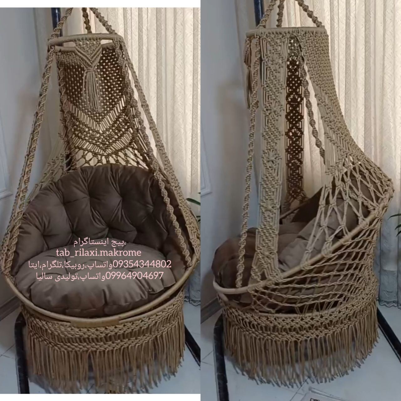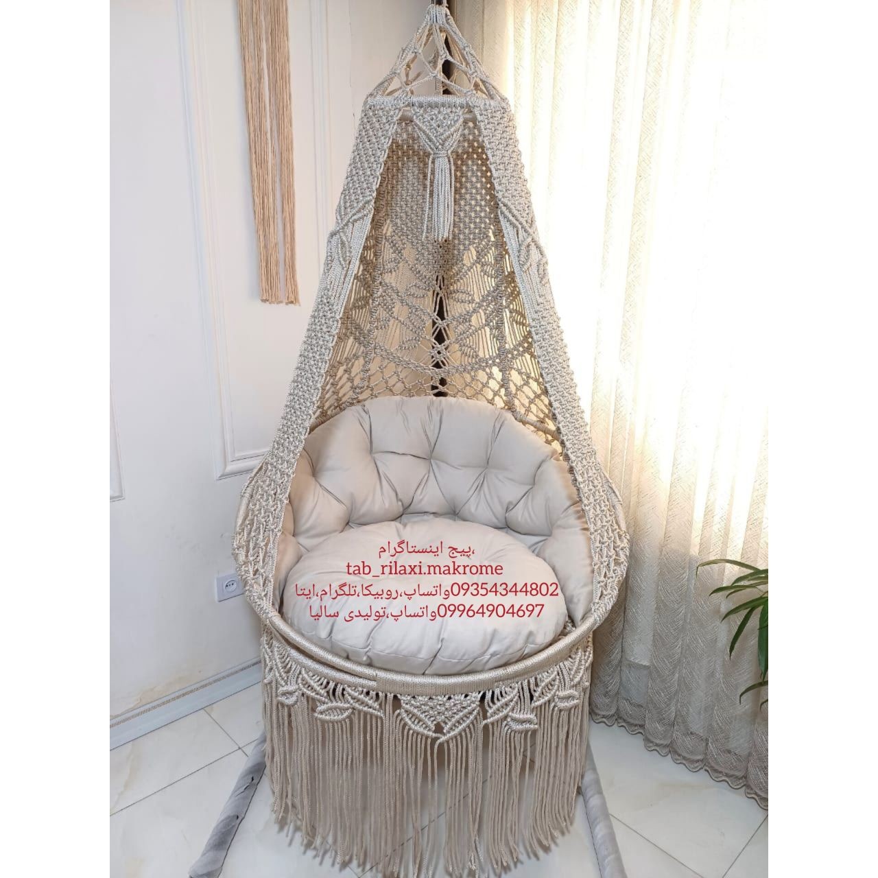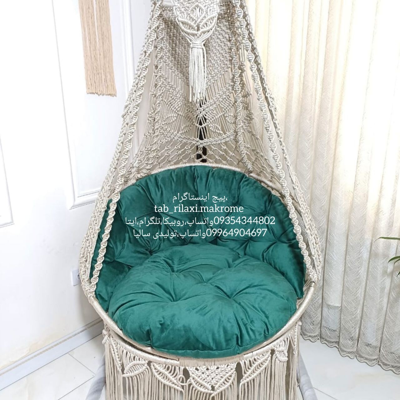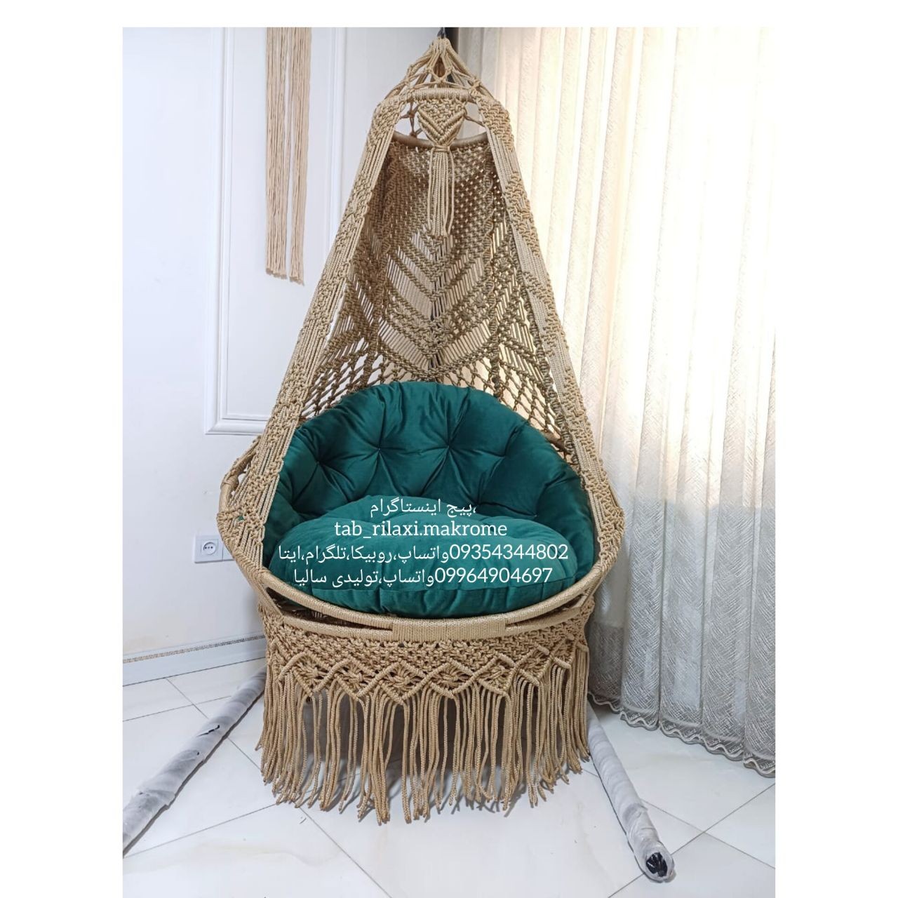 قبل از هر چیز لازم میدونم اول محصول خودمون رو به شما معرفی کنم ،تاب های مکرومه با مشخصات : ارتفاع تاب 230 قطر کف تاب 100 نخ پلیسترمغزدار5 میل پارچه مبلی درجه یک و صادراتی برند مازراتی جنس الیاف شرکتی جهان آسا تاب 4 تا زنجیر داره که واسه تحمل وزن بیشتر هستش مجموعه تولیدی ما ، با بکار گرفتن بانوان هنرمند و با تجربه و از همه مهمتر استفاده از بهترین متریال موجود در بازار جهت تولید تاب های مکرومه نامی آشنا در بازارهای مبل تهران و شهرستان میباشد و اینکه حضور در تمامی نمایشگاهای داخلی تولیدی ما رو به اولین تولید کننده تاب مکرومه با کیفیت صادراتی تبدیل کرده است ، مجموعه تولیدی سالی با بیش از 15 سال سابقه همواره مورد اعتماد مشتریان عزیز بوده و هست ، و گرفتن درجه امتیاز عالی از بزرگترین فروشگاه اینترنتی ایران باسلام ،ترب،دیجی کالا گویای کیفیت کار ماست