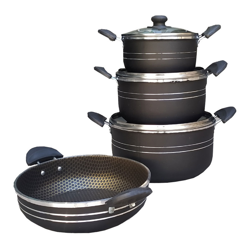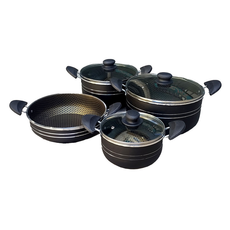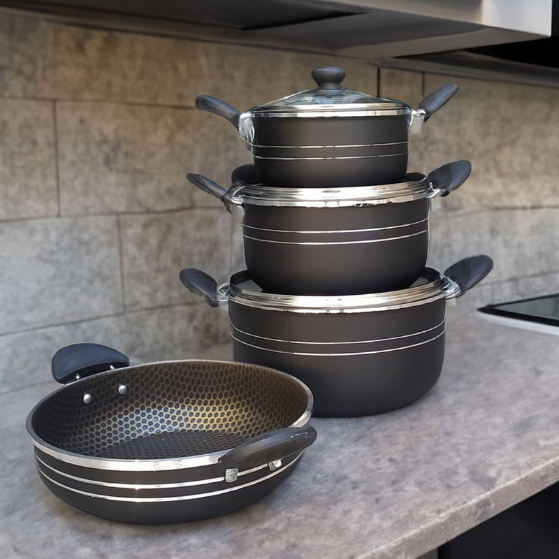 سرویس قابلمه 7 پارچه با توجه به جنس ضخیم آلومینیوم بکار برده شده در این سرویس ، حرارت به صورت یکسان در سطح قابلمه ها پخش می شود. رنگ به کار برده برای بیرون قابلمه ها ، نسوز و کوره ای می باشد که در شستشو بسیار راحت عمل می کند .