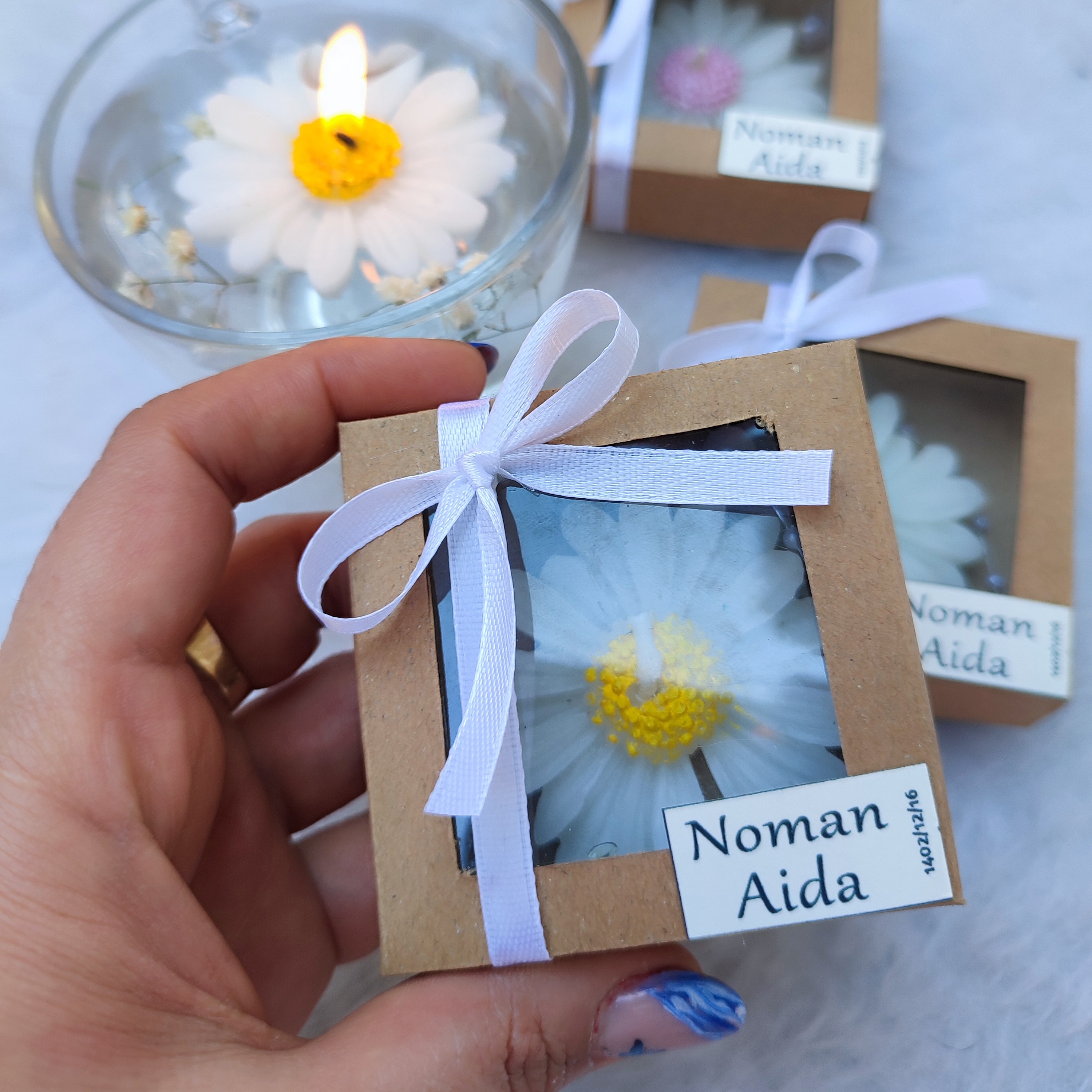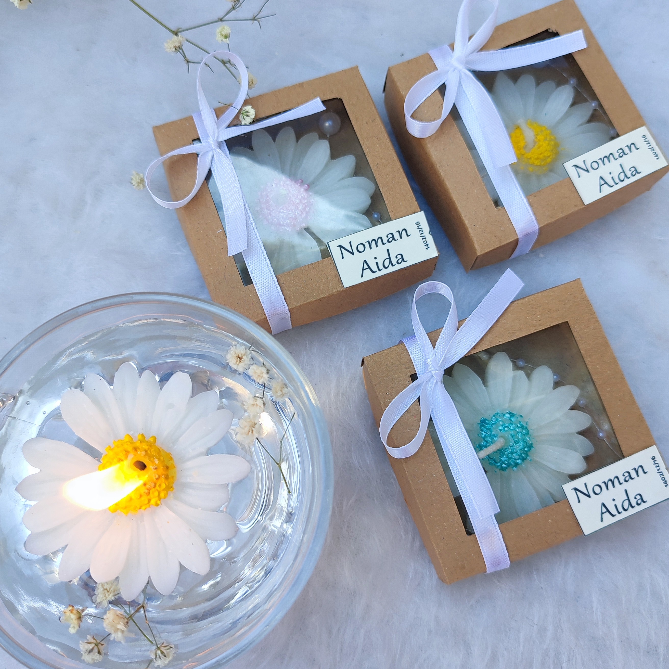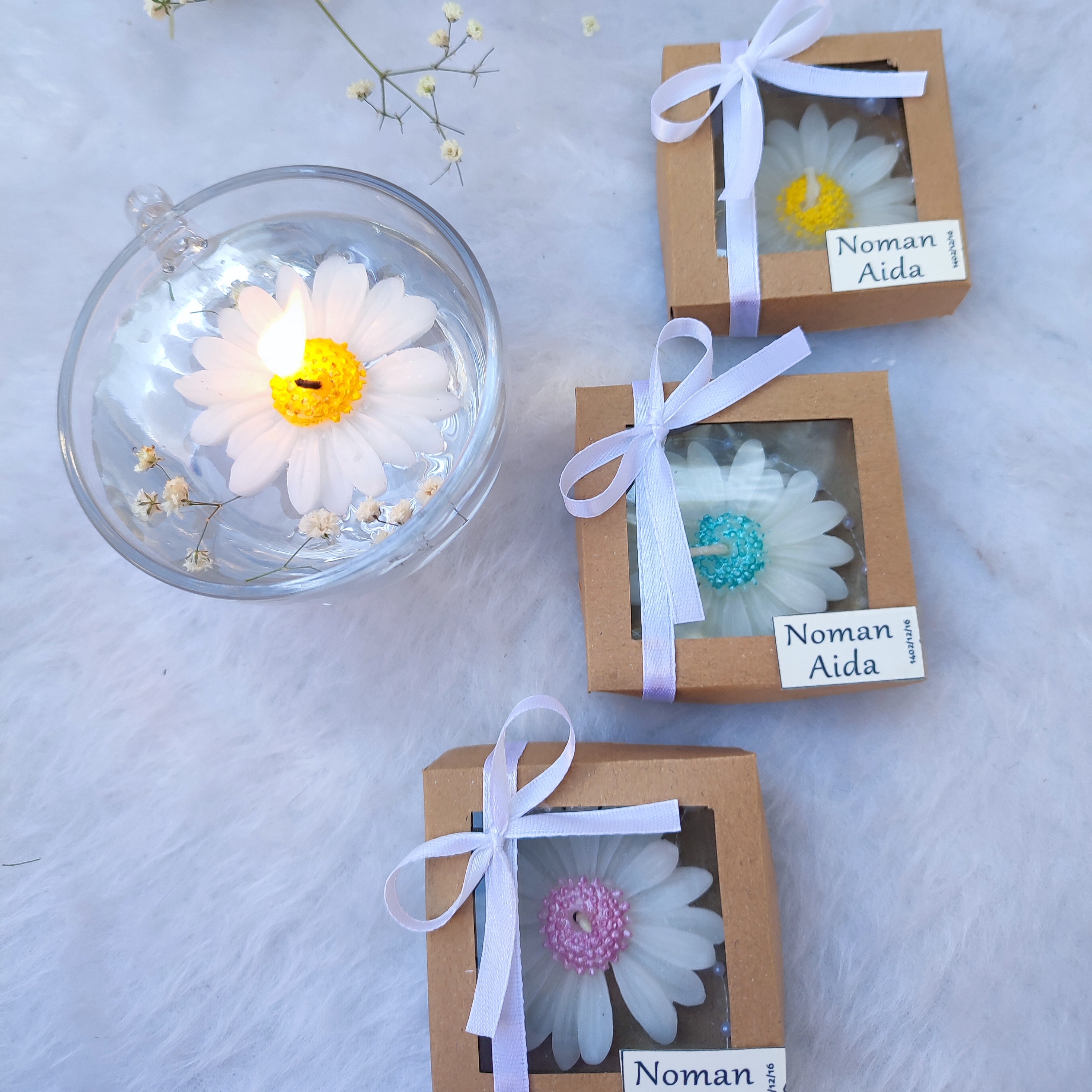 گیفت شمع بابونه همراه با جعبه این شمع شناور رو اب هست و مدت یکساعت روشنایی دارد همراه با لیبل اختصاصی طراحی شده ب نام شما عزیزان