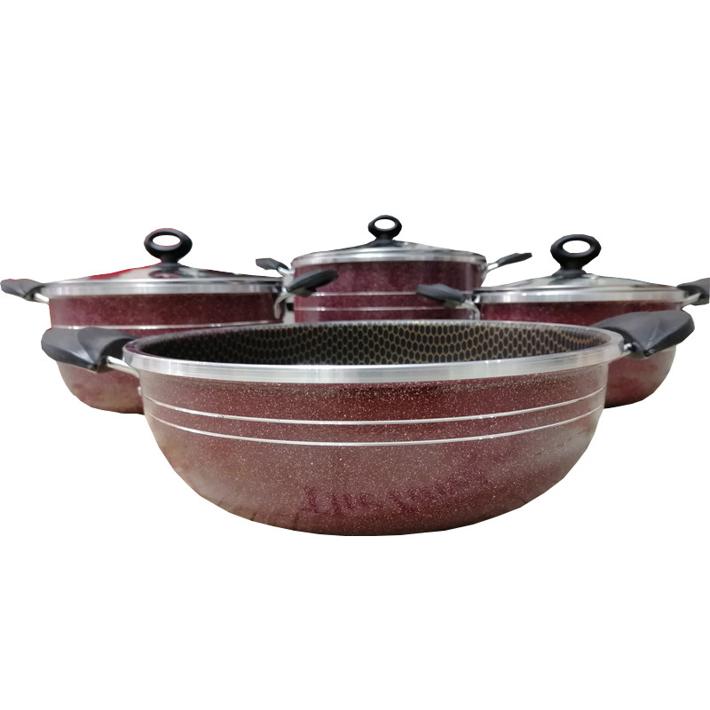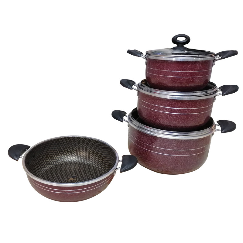 سرویس پخت و پز 7 پارچه مدل لانه زنبوری این محصول دارای سه قابلمه با سایز های 28 سانتی متر، 24 سانتی متر و 20 سانتی متر؛ و ماهیتابه با سایز 28 سانتی متر می باشد. همچنین دارای سه درب با سایز های 28 و 24 و 20 سانتی متر می باشد. لبه های این محصول دارای تسمه می باشد که از باعث جلوگیری از تاب برداشتن می شود.