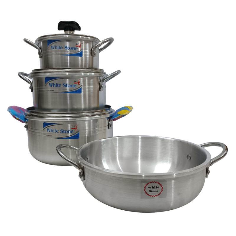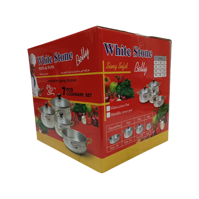 سرویس پخت و پز وایت استون مدل Belly شامل سه قابلمه به سایز های 20 22 24 و ماهیتابه به سایز 24 می باشد. این سرویس با آلمینیوم با کیفیت و ضخامت بالا ساخته شده است که مناسب استفاده روزمره می باشد .