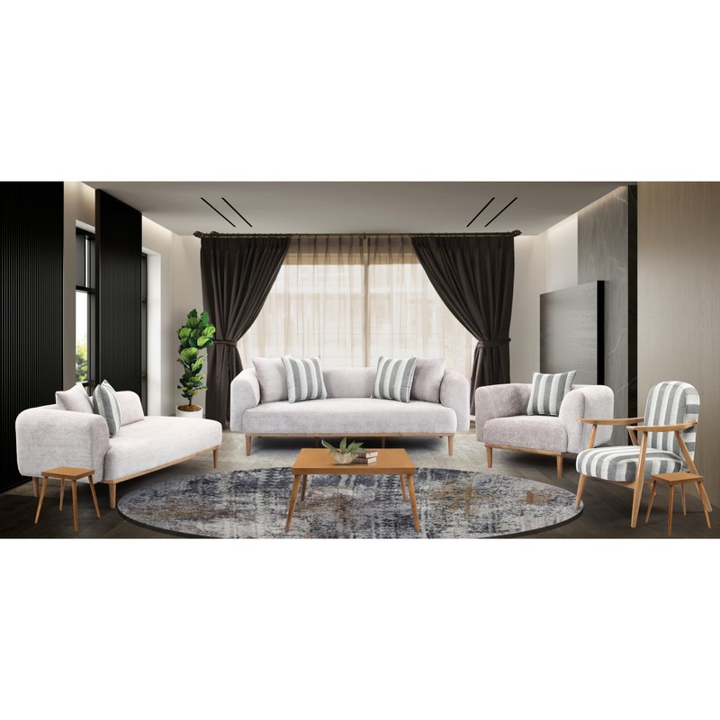 پارچه خارجی در جه یک بسیار لطیف و در رنگبندی متعدد از روشن تا تیره. هفت نفره شامل سه نفره و دو نفره و دو تا تک نفره که در صورت تمایل میتوان تعداد نفرات رو اضافه کرد.