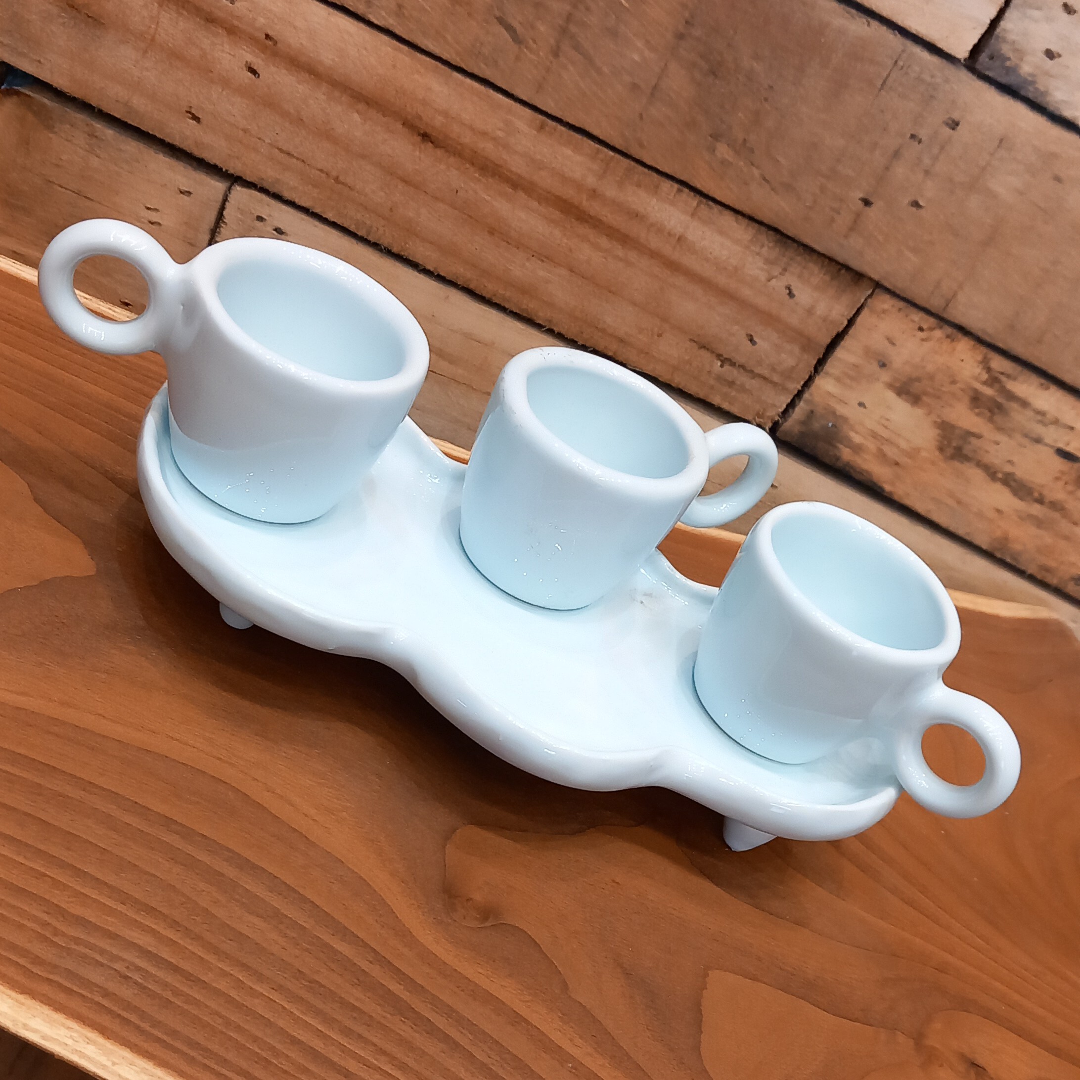 ست فنجان 3 تایی سرامیکی دستساز، به همراه سینی پایه دار ،دارای ظاهری فانتزی و جذاب و رنگ آبی روشن مناسب برای سرو نوشیدنی های گرم،که لذت دور همی و وقت گذراندن با عزیزانتون رو دو چندان میکنه. این کار سرامیکی،کاملا دستساز و تک نسخه هست