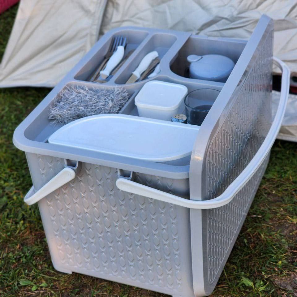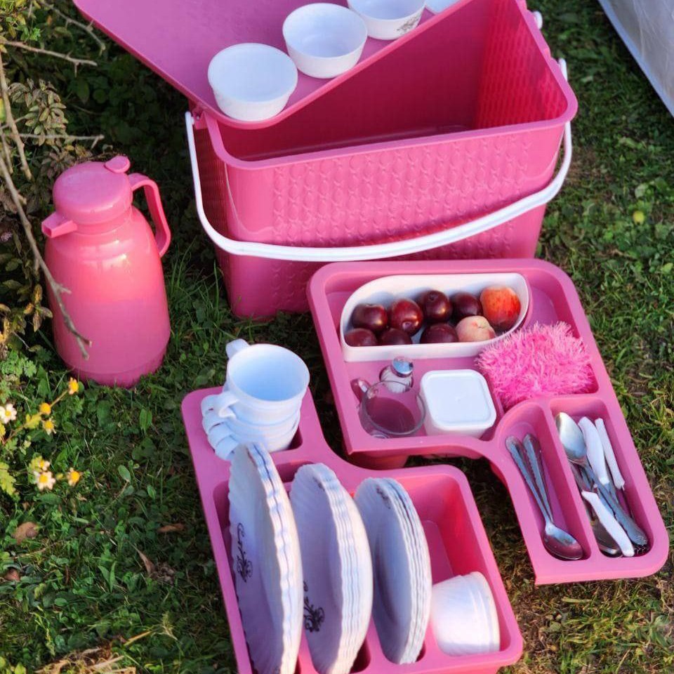 پک مسافرتی شامل:پلو خوری. خورشت خوری. میابه. پیش دستی. لیوان دسته دار.. قاشق چنگال استیل از هرکدام 6 عدد....کارد استیل 3 عدد..درب باز کن..قندان. نمکدان.ظرف میوه دردار. اسکاج..درب جداشونده . سبد آبکشی. فلاسک.. رنگهای طوسی. کرپ. سرخابی