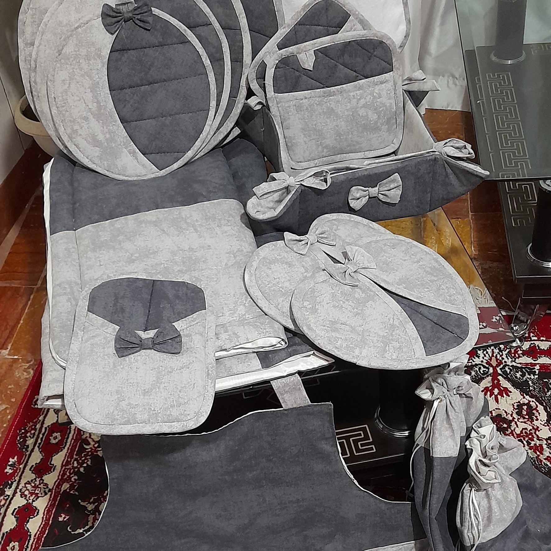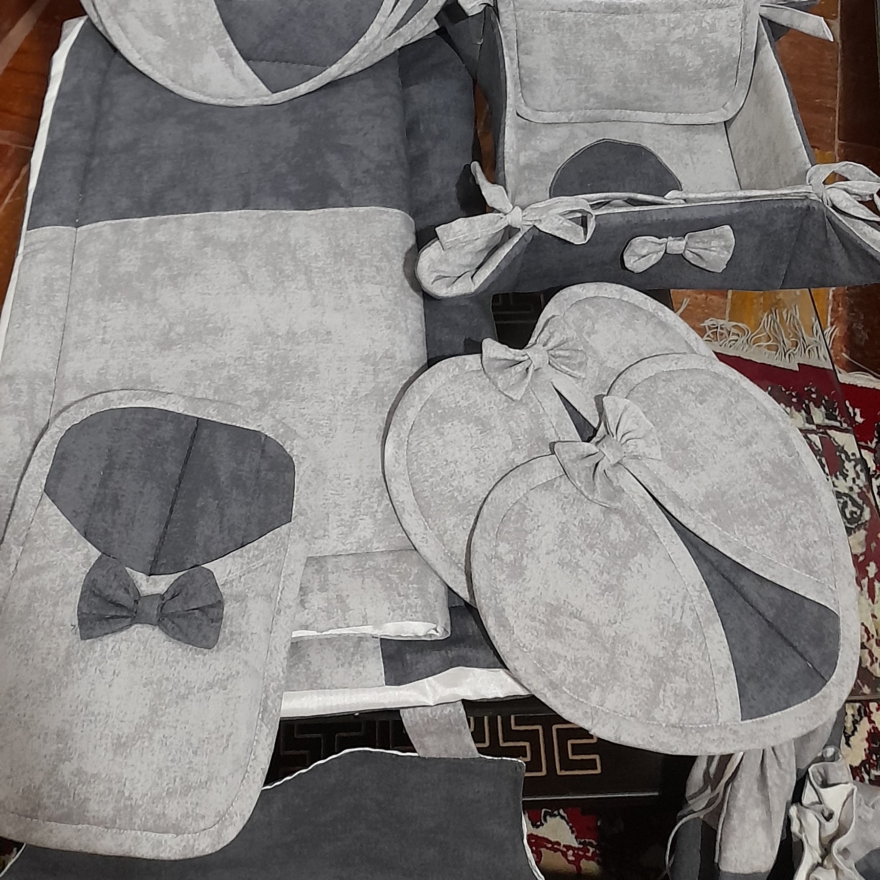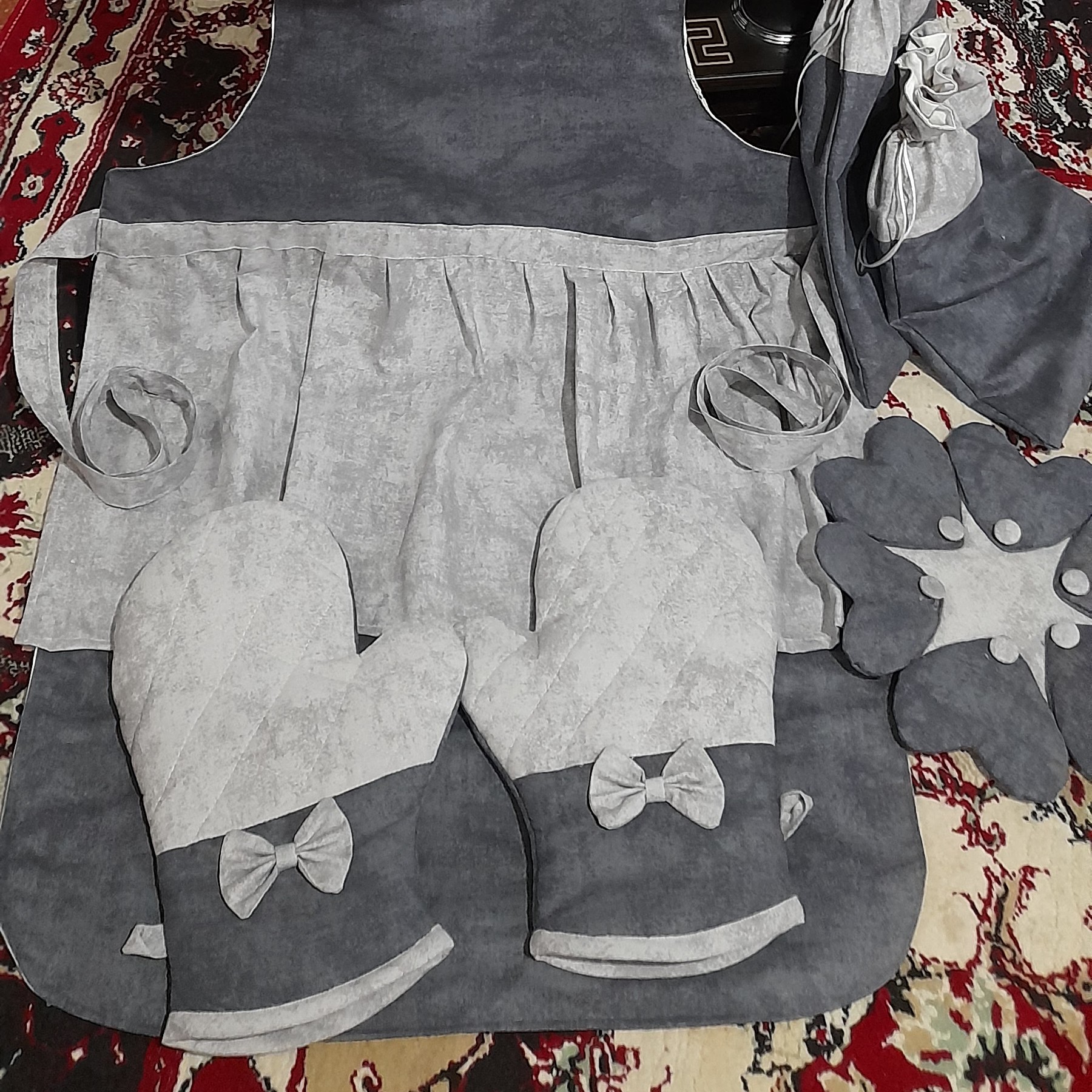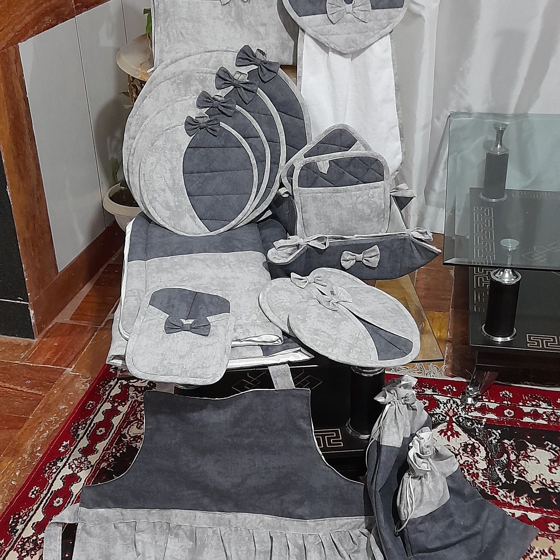 سرویس اشپزخانه 20 تکه با پارچه کتان نخ و متریال درجه یک ارسال با تیپاکس این سرویس شامل: چهار دمکنی هلال یک جفت دستکش فر یک جفت دستگیره قلب یک جفت دستگیره مربع جیب دار دو سایز نمگیر سفره پاک کن باکس نان پیشبند ساده جلو چین دار حوله اشپزخونه کیف نان یخچالی دو سایز کیسه سبزی زیر قابلمه