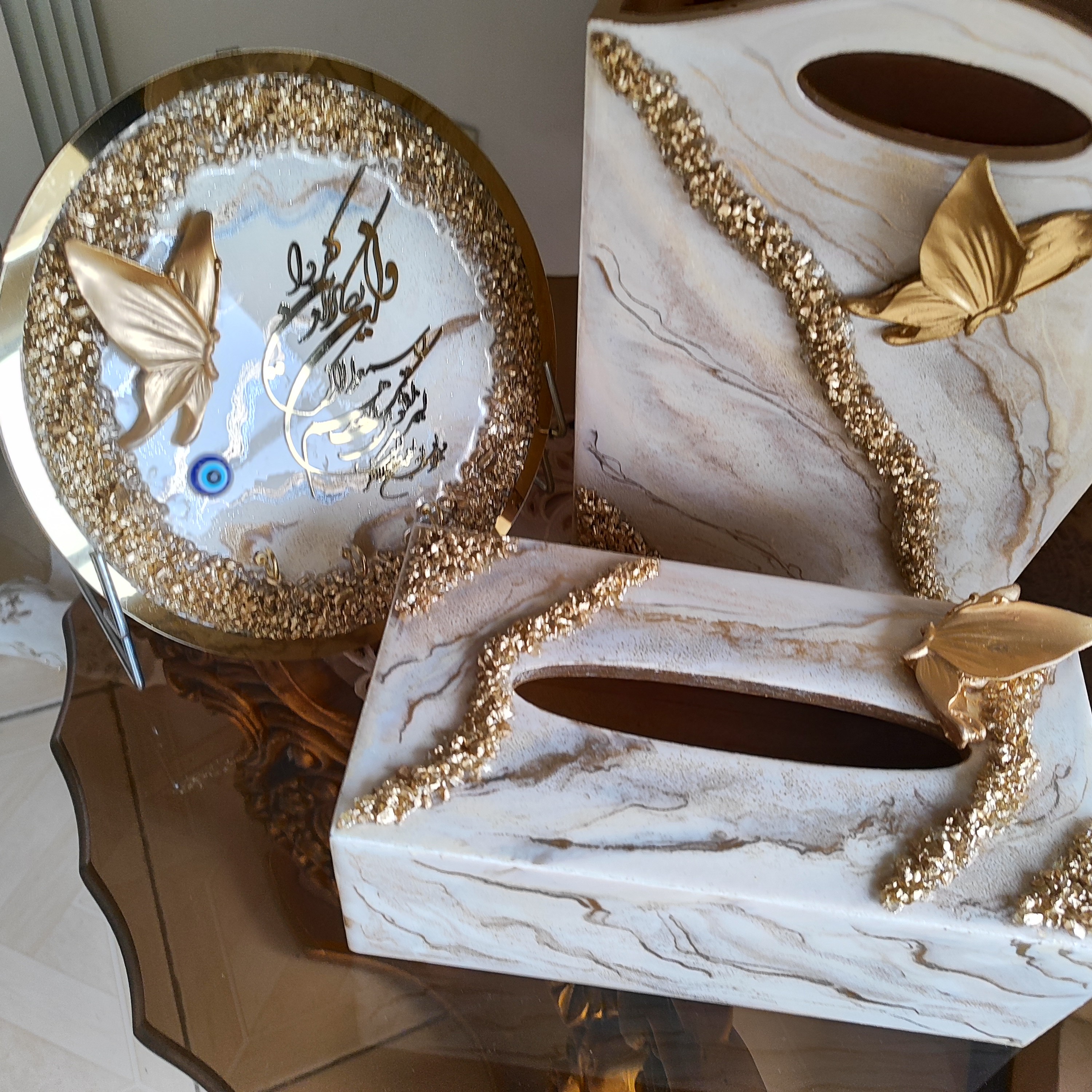 ✅ساعت دیواری رزینی دست ساز لوکس با ست کامل جهیزیه جعبه دستمال کاغذی و سطل زباله وجاکلیدی ساعت قطر 60 میباشد ✅اجرا شده بر روی چوب 16 میل ورزین درجه یک کرهای مولتی استایل اعداد از ورق خارجی استفاده میشود طرح دلخواه شما هم قابل سفارش میباشد 🙏 ✅قابل سفارش به صورت تکی هم میباشد