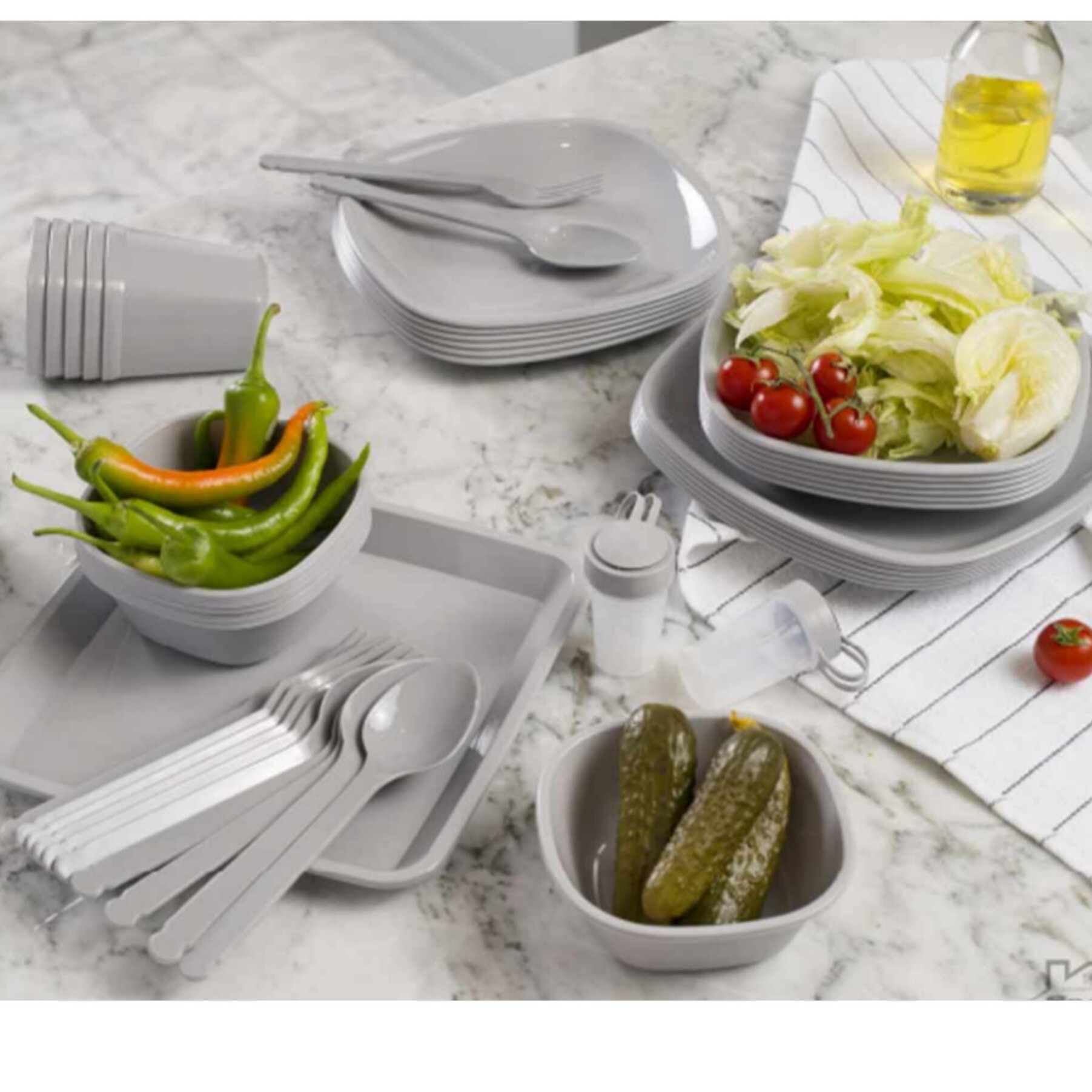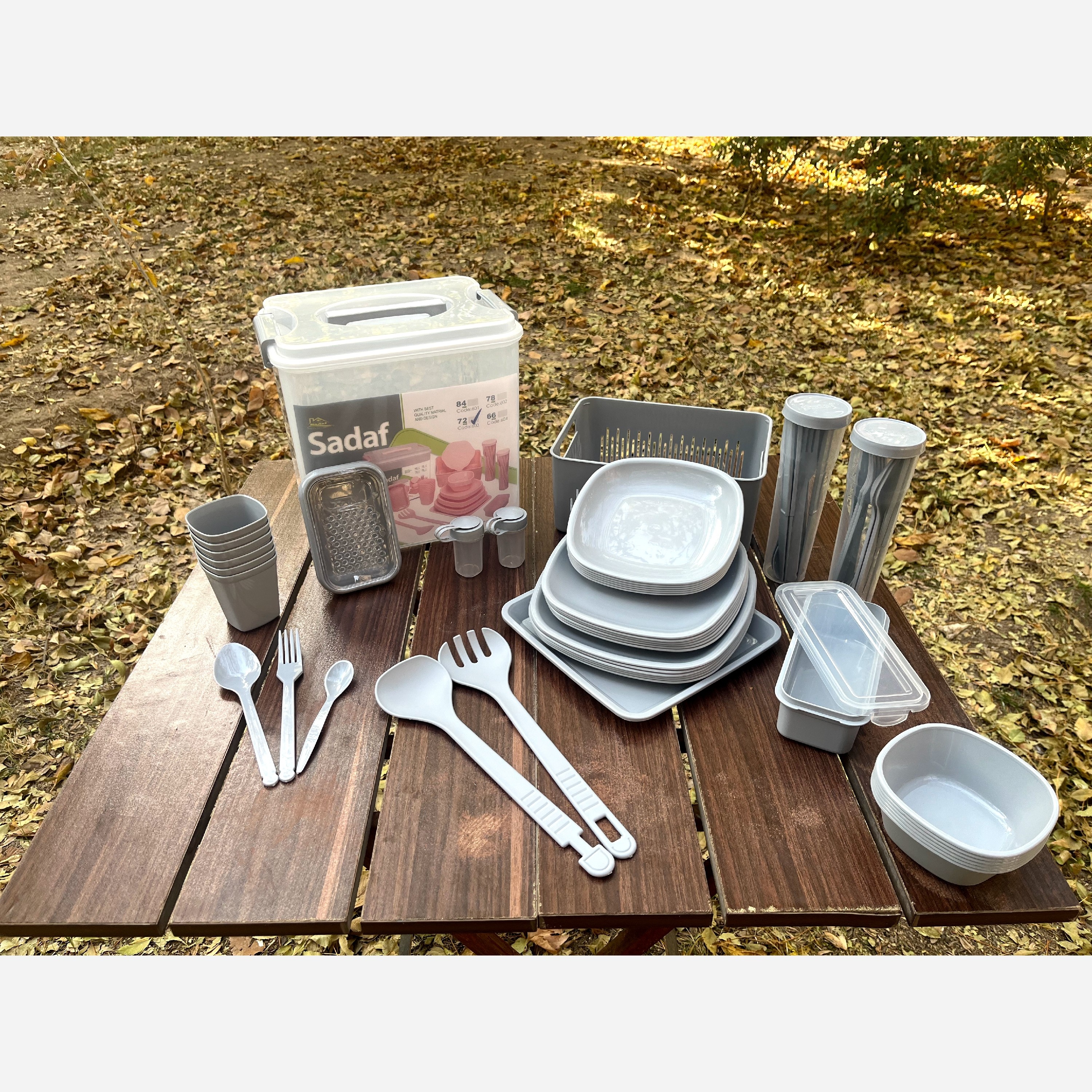 6عدد بشقاب بزرگ 6عدد بشفاب متوسط 6عدد بشقاب کوچک 6عدد لیوان 6عدد کاسه 6عدد قاشق.چنگال.چاقو.قاشق چایخوری 1عدد جا قاشق چنگال 2عدد انبر سالاد 2عدد نمک پاش 1عدد رنده 1عدد تخته گوشت 1سبد آبکش 1عدد ظرف مستطیل درب دار 1عدد سینی چهارگوش 1عدد باکس درب دار