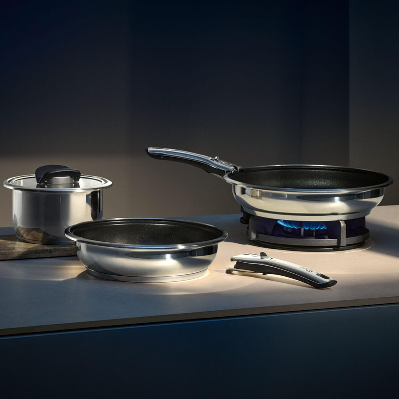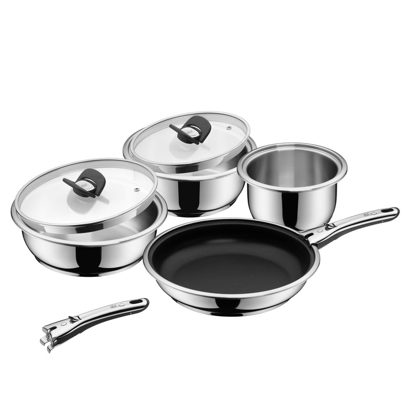 سرویس قابلمه 7 پارچه دبلیو ام اف مدل WMF Click & Serve Kochgeschirr Vorteils راه حل بهینه برای آشپزخانه با فضای ذخیره سازی کم و در عین حال چند منظوره است . این مجموعه قابل استفاده در فر می باشد . دسته قابل جدا شدن که با تمام ظروف پخت و پز این سری سازگار است و همیشه باعث صرفه جویی در فضا می شود . دسته آن تحمل حمل با ظرفیت بار 10 کیلوگرمی دارد و به راحتی و سریع و ایمن به هر نقطه دلخواه روی ظروف مربوطه متصل می شود . همچنین به لطف دستگیره های ای از جنس استیل ضد زنگ می توان درب های شیشه ای با کیفیت بالا را بدون هیچ مشکلی روی هم قرار داد . این ظروف ساخته شده از فولاد Cromargan® است که به هم ظریف و هم سخت است . فولاد ضد زنگ 18/10 ظروف پخت و پز و همچنین با رینگ های پهن برای ریختن مایعات بدون چکه و پایه جهانی TransTherm® که صرفه جویی برای انرژی است شما را تحت تأثیر قرار می دهد . همچنین برای اجاق های القایی ( برقی ) مناسب است . به استثنای ظرف نچسب و دسته ، تمامی قطعات را می توان برای تمیز کردن آسان در ماشین ظرفشویی قرار داد . وی ام اف شاپ به شما پیشنهاد می کند که یک عدد دسته یدکی این محصول که در سایت قرار داده شده تهیه کنید تا در آینده با مشکلی مواجه نشوید . این مجموعه شامل ماهیتابه 28 سانتی متر نچسب و قابلمه با درب 20 سانتی متر و قابلمه 16 سانتی متر و تابه با درب 24 سانتی متری است و دو عدد دسته می باشد .
