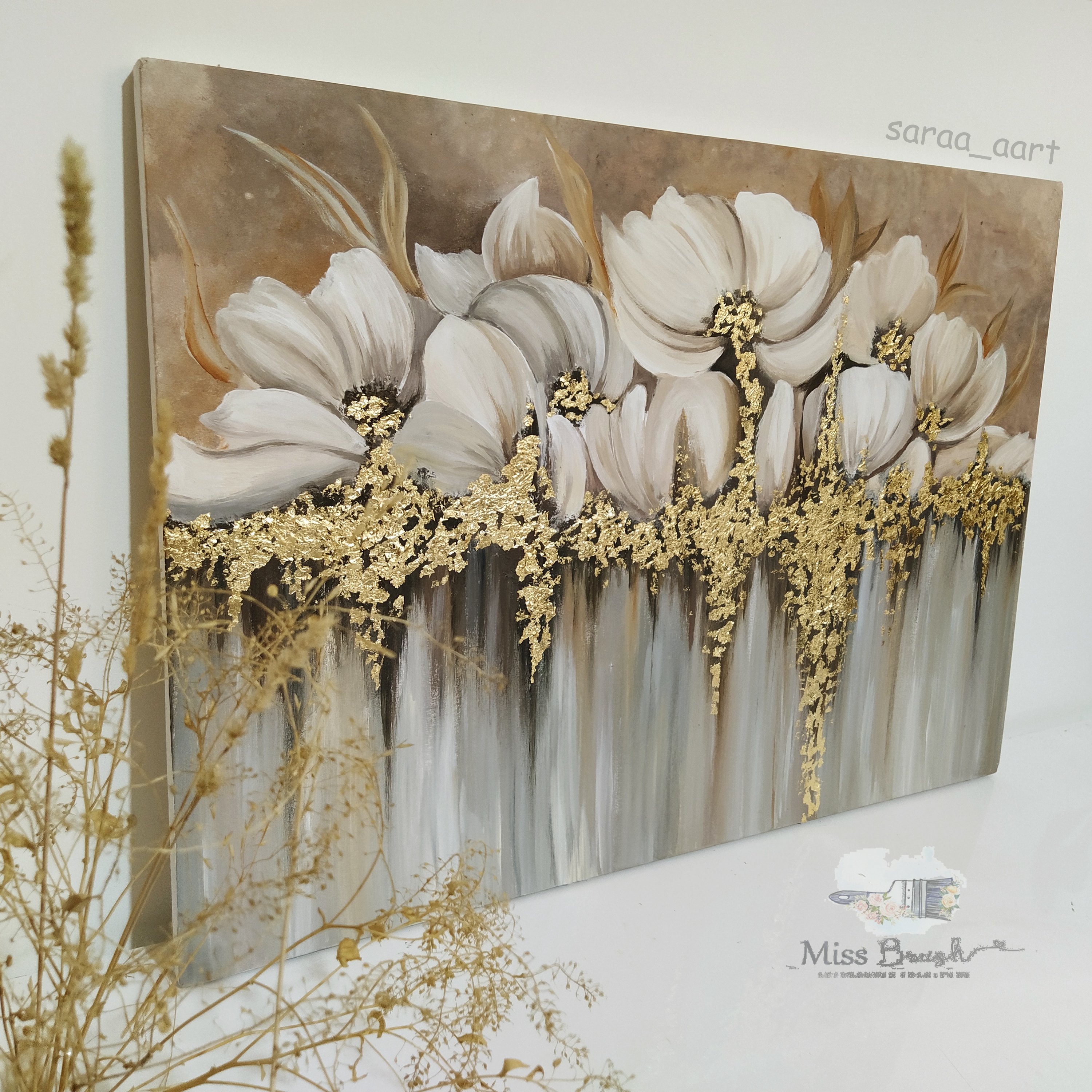 تابلو مدرن گل آبشاری کار شده با ورق طلا مبلمونسرا مدل 267440