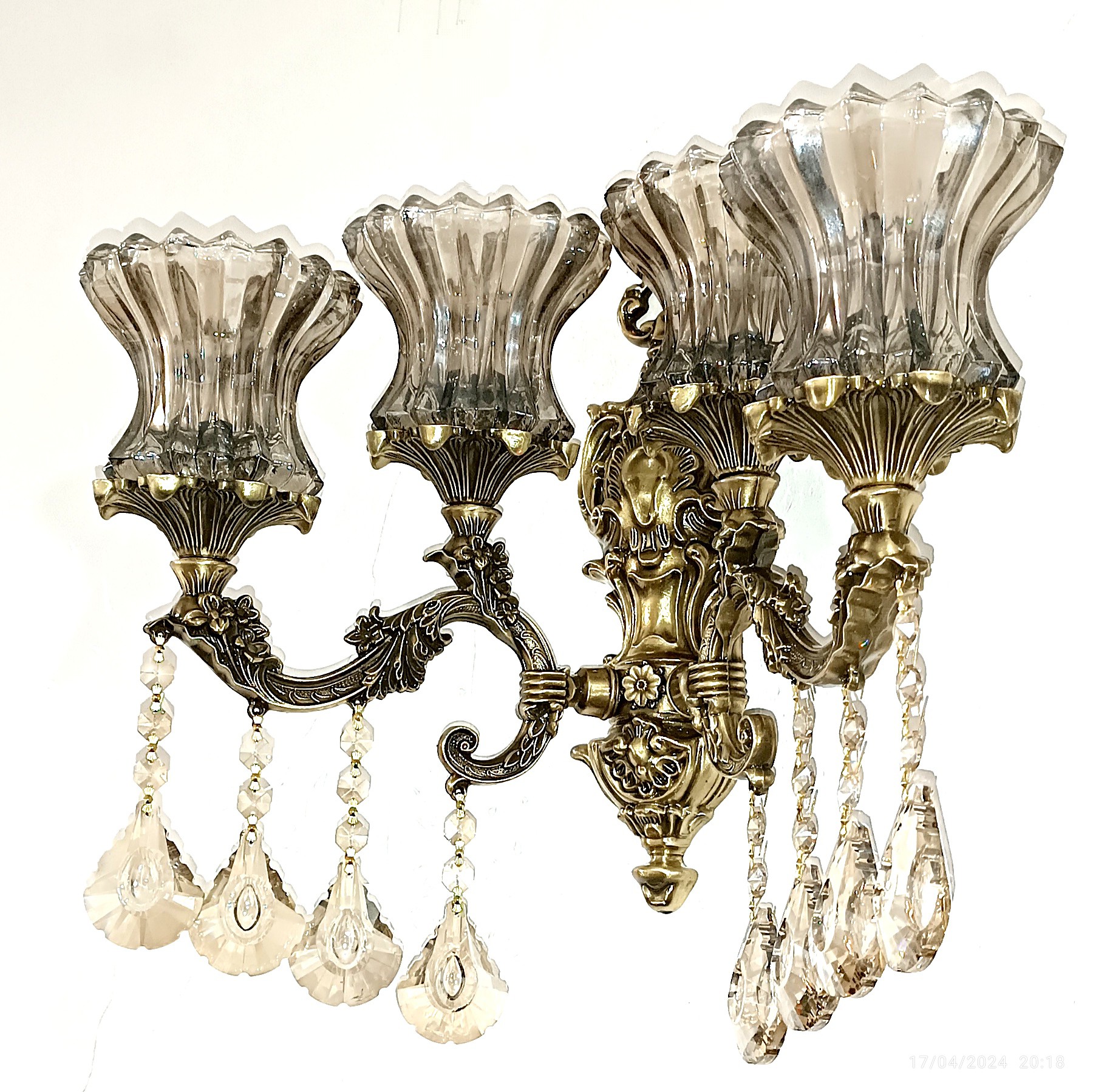 دیوارکوب مدل یاس دو شاخه هر شاخه دو شعله جمعا 4 شعله رنگ آنتیک با ضمانت لاله و کریستال درجه یک شامپاین لیزری ارسال رایگان به سراسر ایران