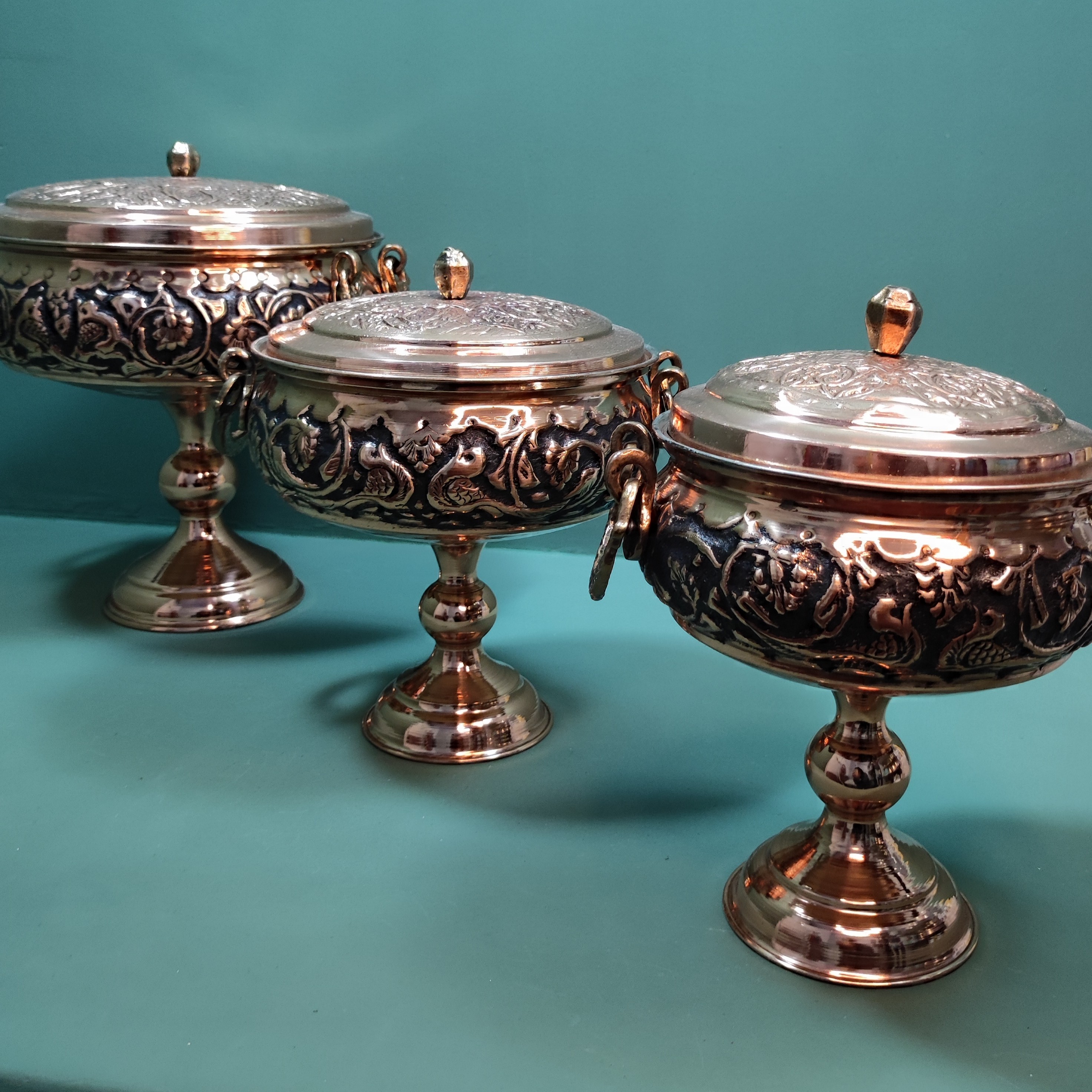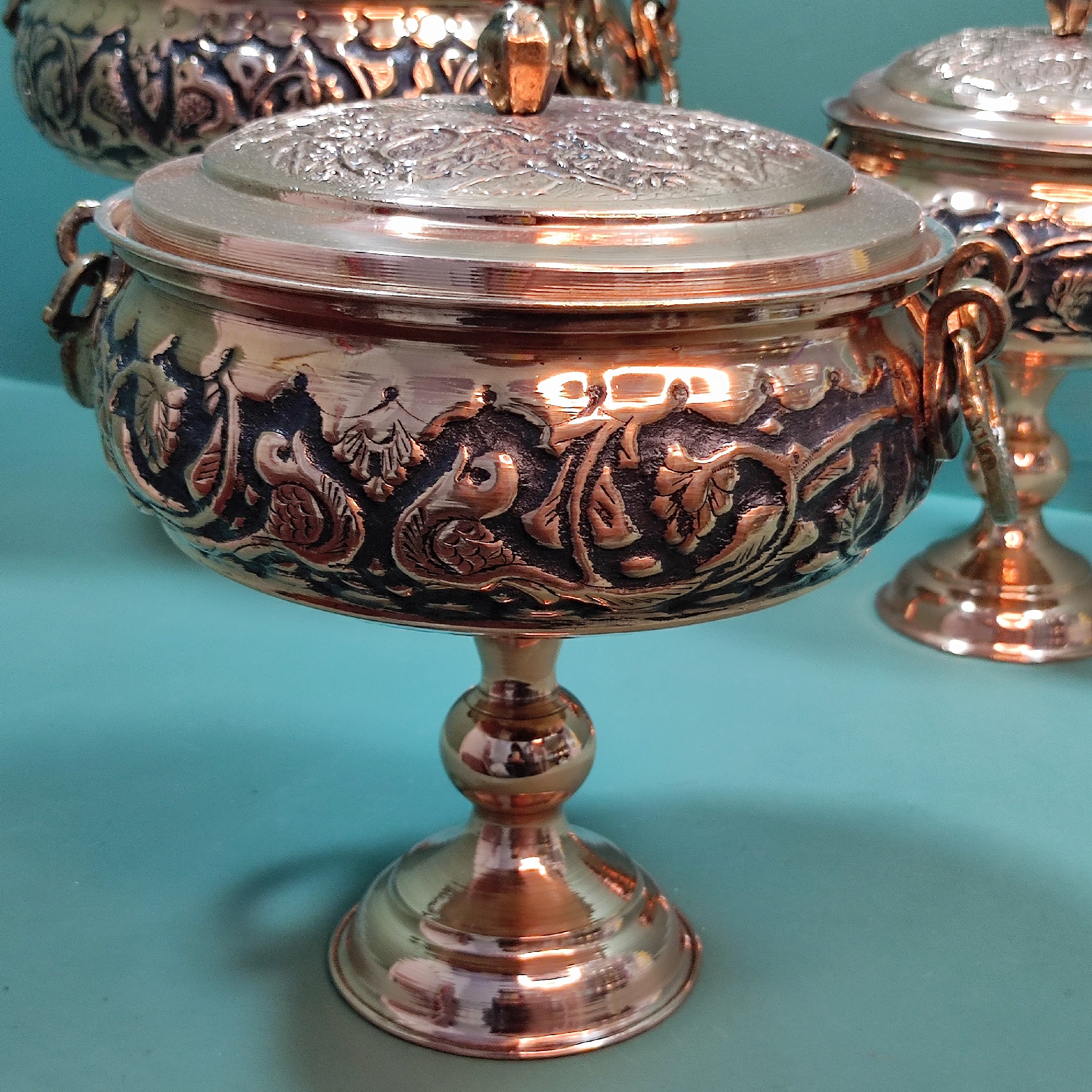 این محصول بسیار زیبا قابل استفاده در دکوراسیون منزل شما و هم بسیار کاربردی برای پذیرایی که به دلیل در دار بودن و داشتن قلع در داخل آن علاوه بر استفاده بعنوان گز خوری میتوان از آن برای استفاده از مواد غذایی داغ مثل سوپ و آش نیز استفاده کرد در دار بودن ظرف به شما کمک میکنه که از مواد غذایی خود بصورت بهداشتی و گرم محافظت کنید و دیگر مزیت ظروف مسی میکروب زدایی آن هست که امروز توجه مصرف کنندگان رو به جلب کرده است و خرید ظروف مسی علاوه بر استفاده مفید دارای ارزش افزوده نیز هست