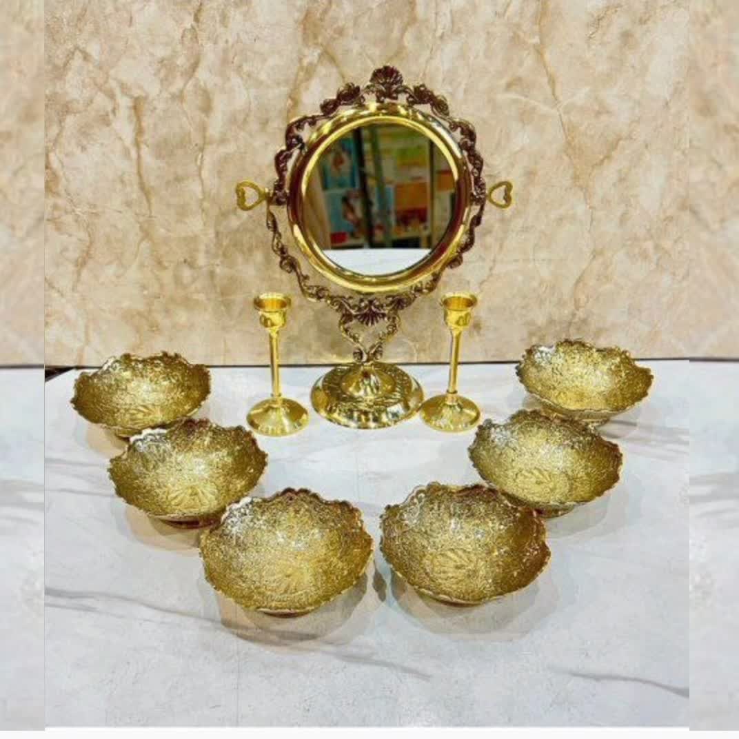 ست هفت سین تمام برنجی ساخت هندوستان با 6 عدد پیاله قطر 10 سانتیمتر و دو عدد شعمدان و اینه تمام قلم دست پر کار با طرح طاووس و سطح کیفیتی درجه یک و سنگین مناسب استفاده دائم و پذیرایی و قابل شستشو بدون تغییر رنگ