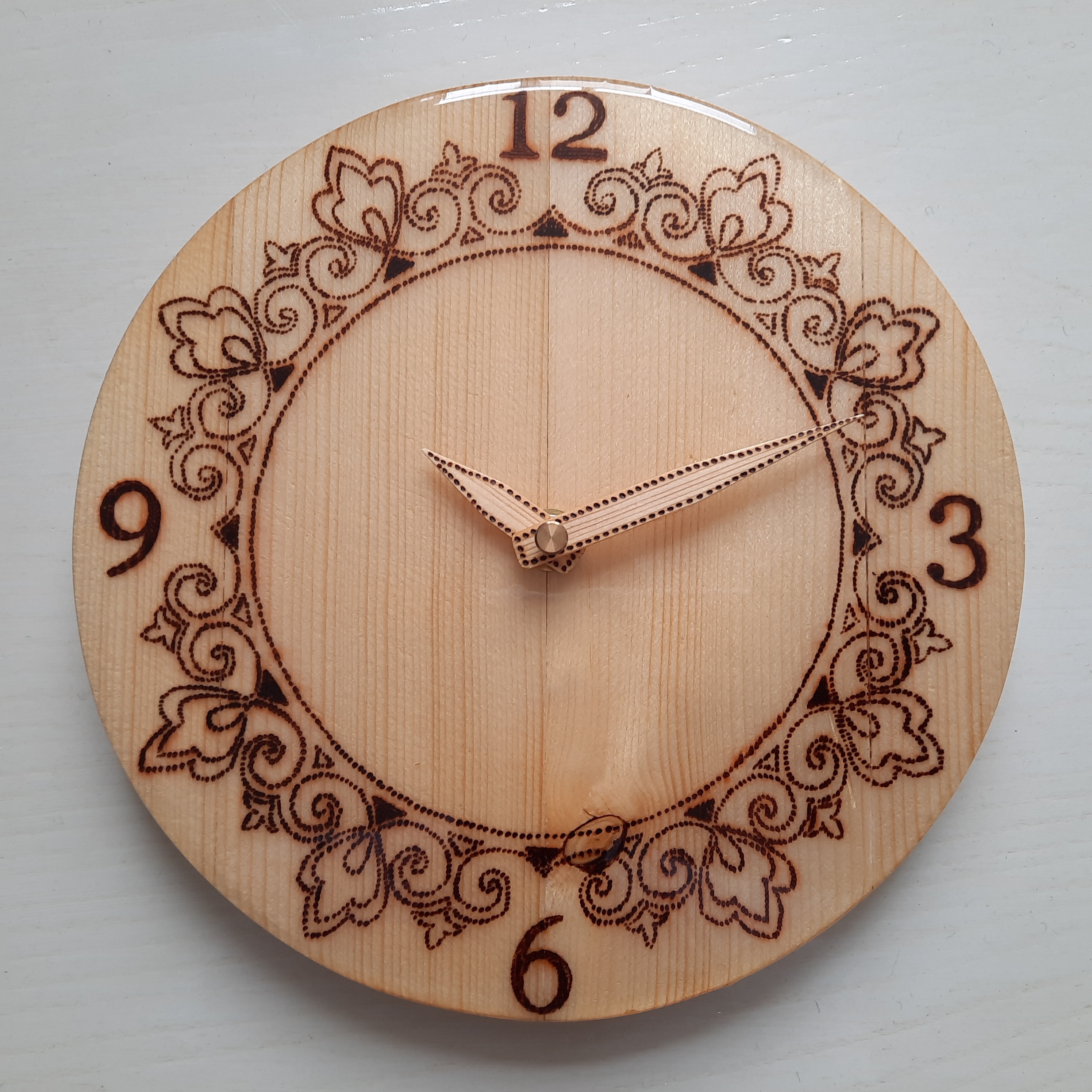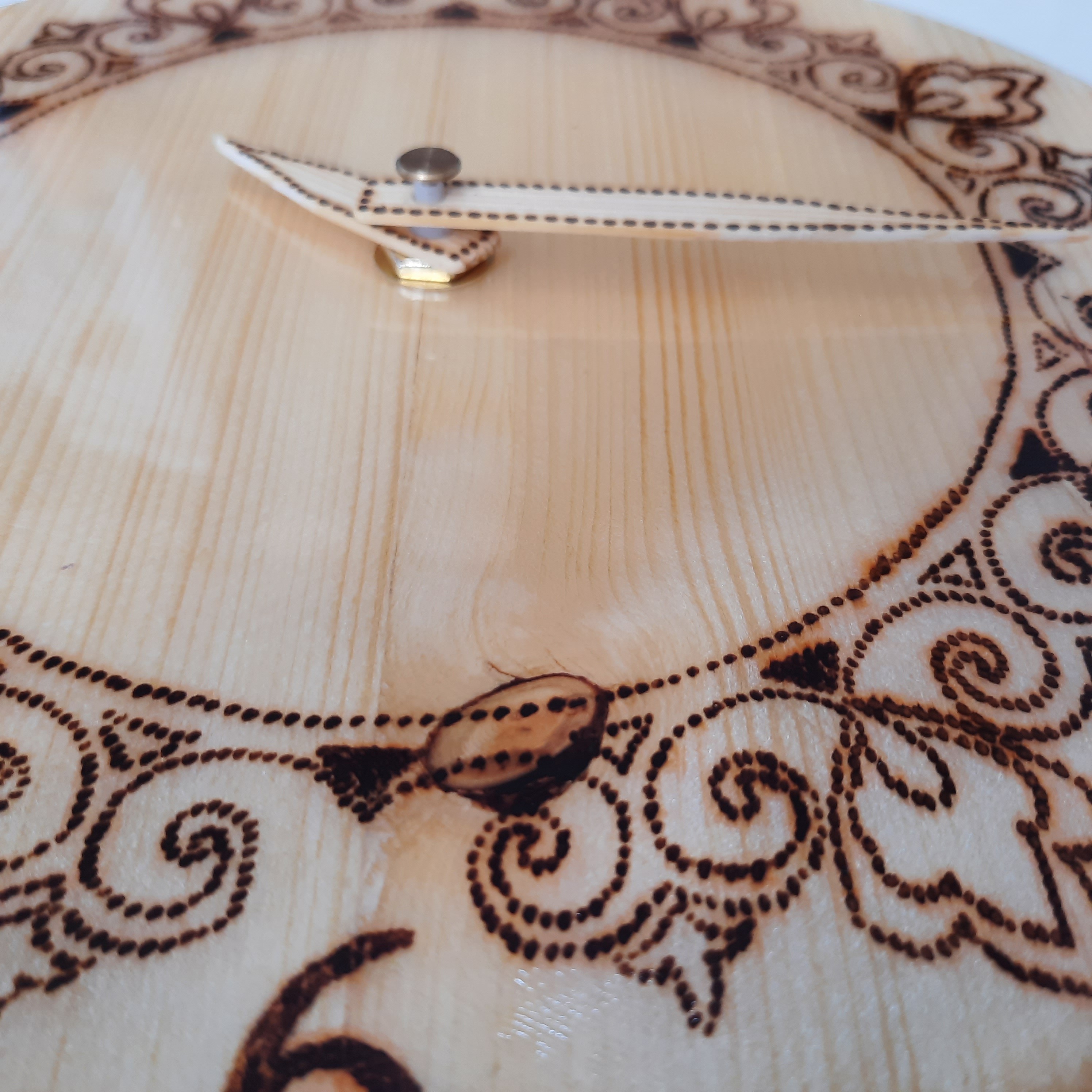 ساعت دیواری سوخته کاری شده از جنس چوب روسی دارای عقربه های چوبی موتور آرامگرد و بی صدا قطر 25 سانتی متر دارای روکش رزینی براق و شفاف