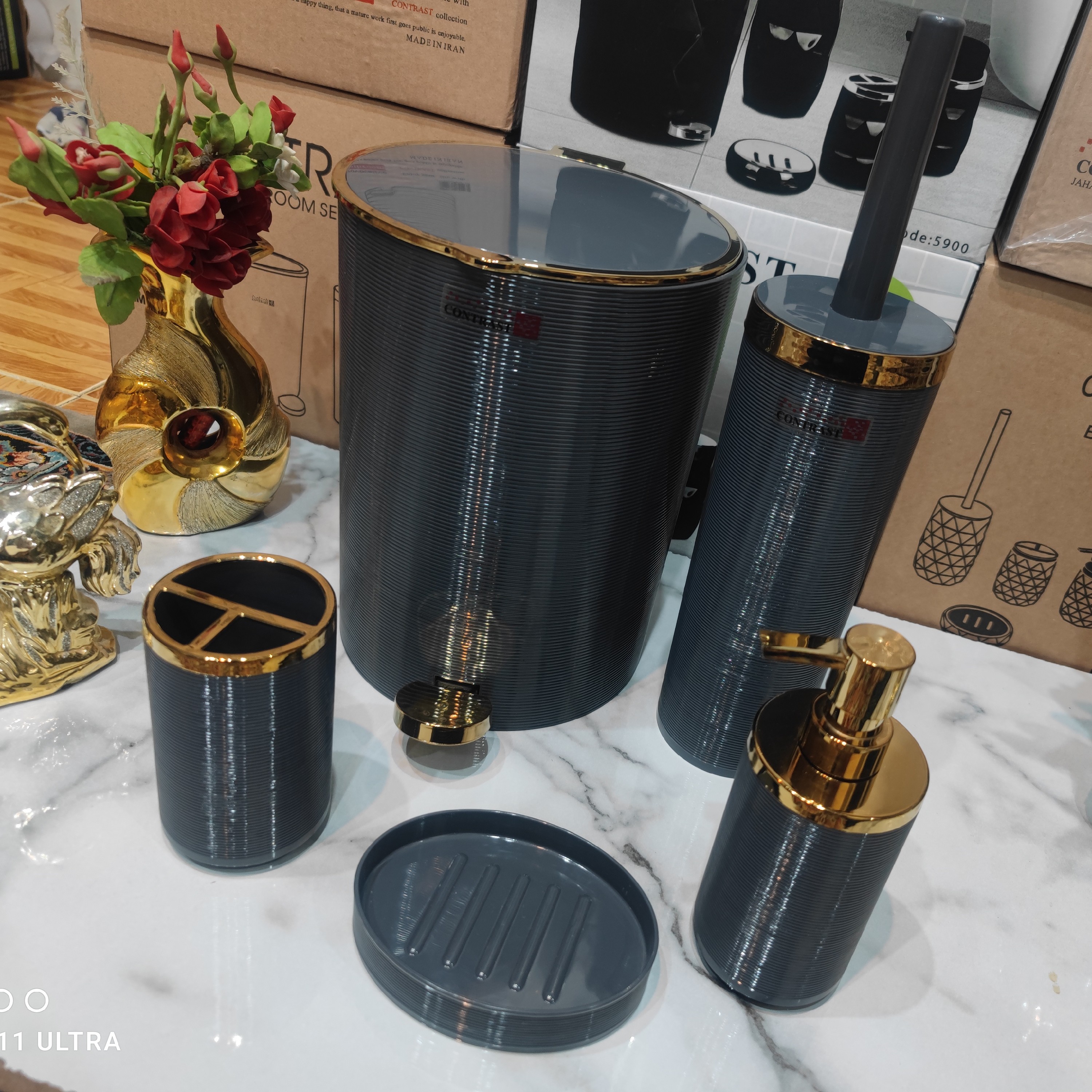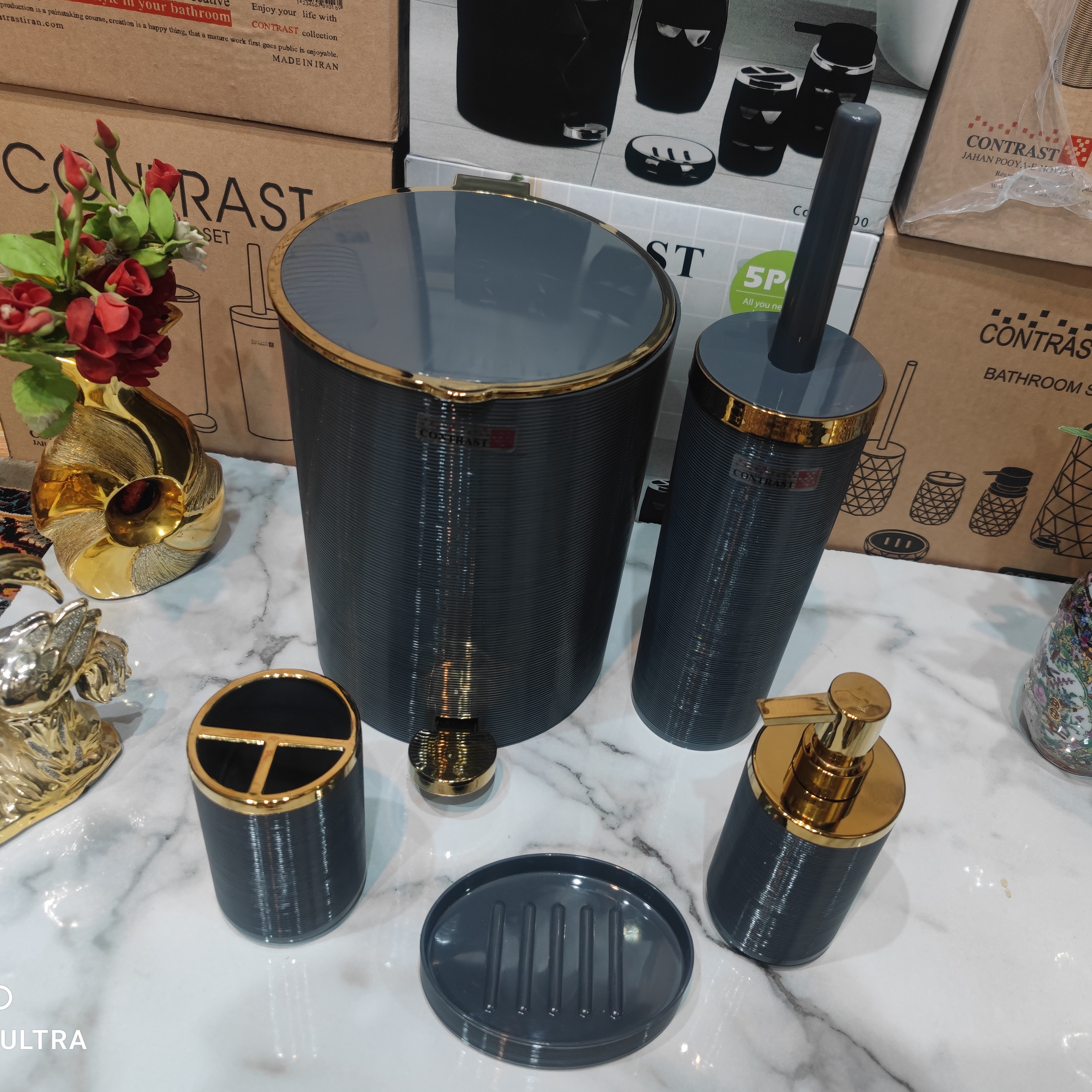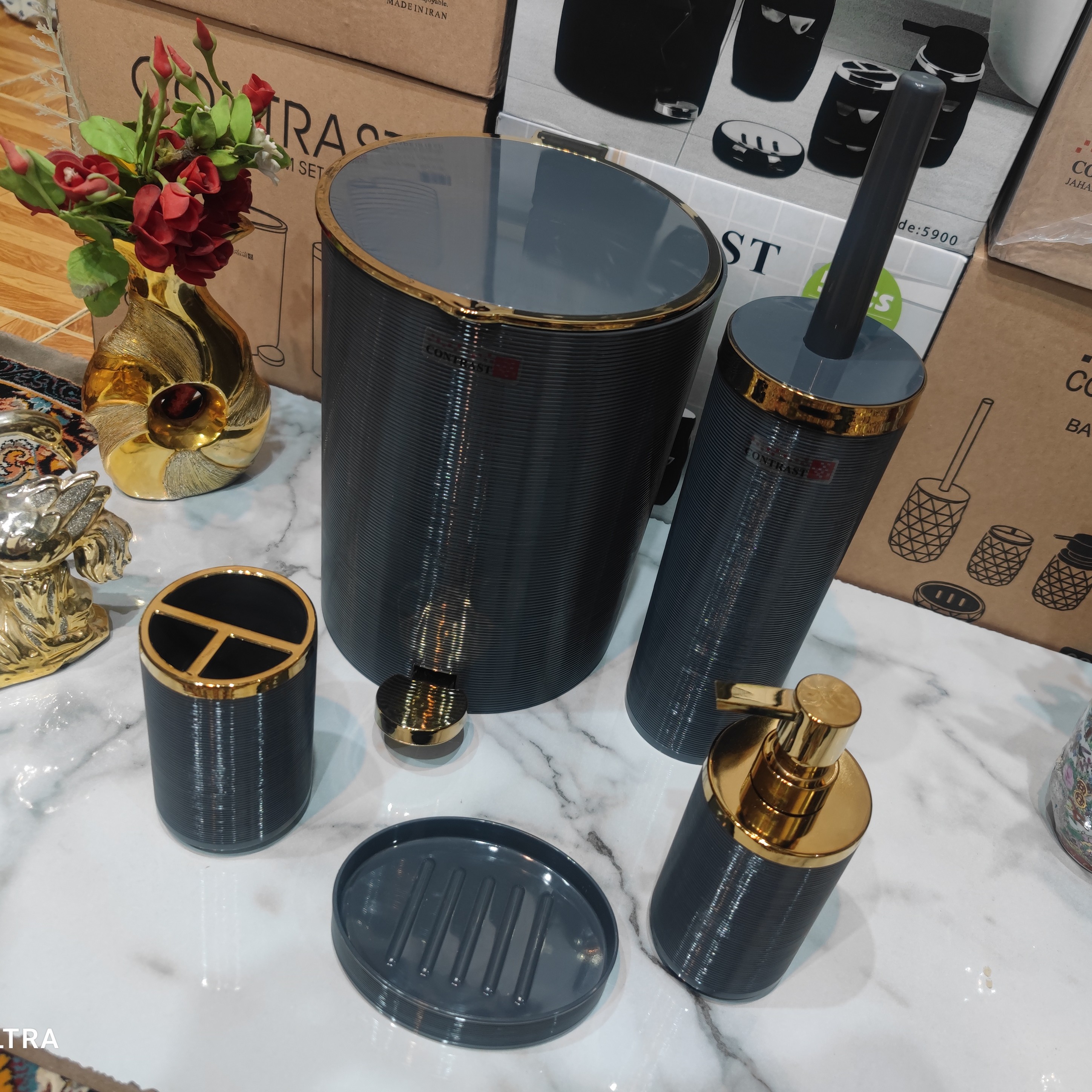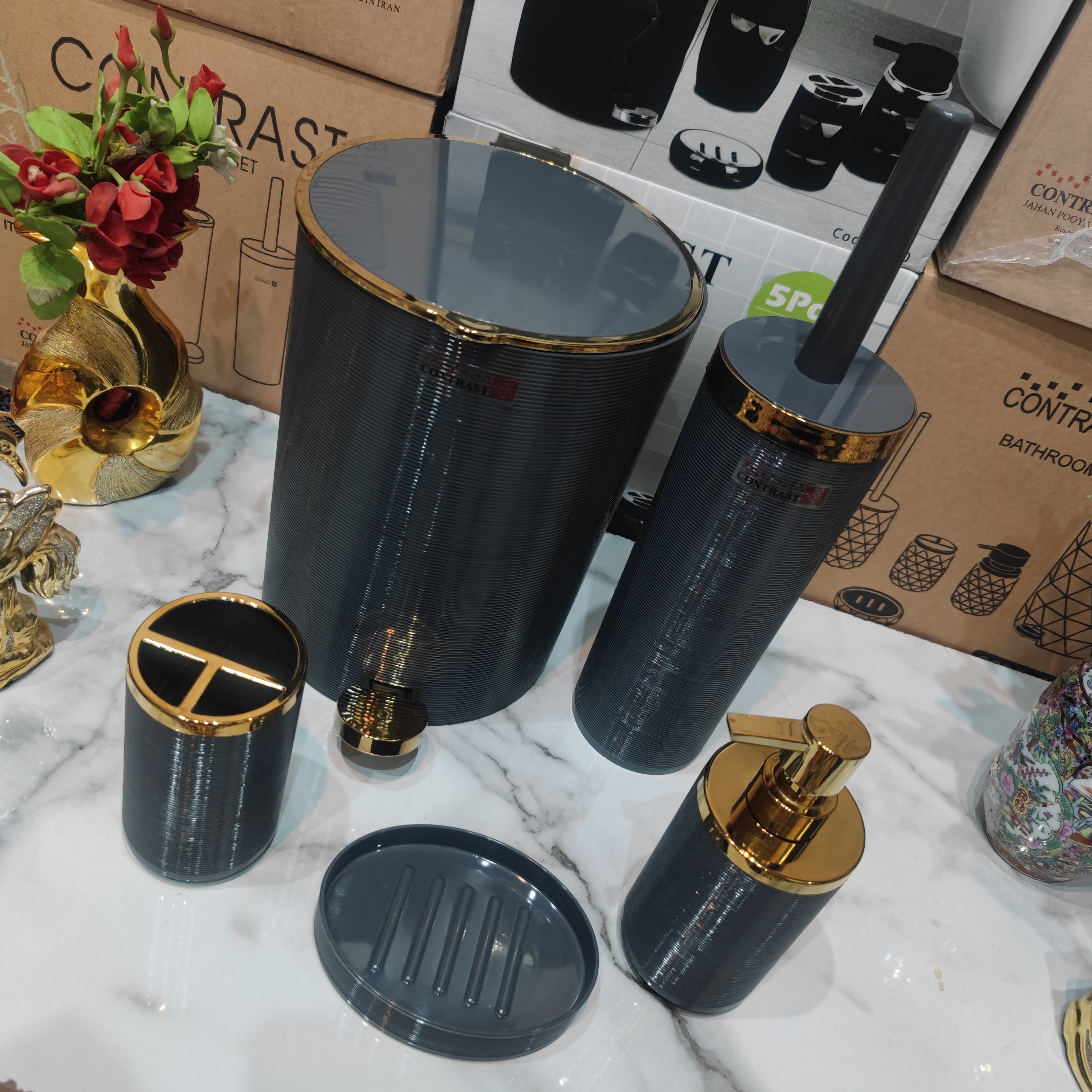 ست سرویس بهداشتی 5 پارچه طرح خط ریز برند کنتراست رنگ زیبا و شکیل طوسی تیرهطلایی نو آکبند بسیار زیبا وباکیفیت مبلمونسرا مدل 266225