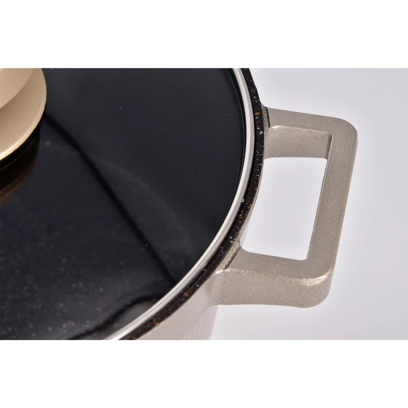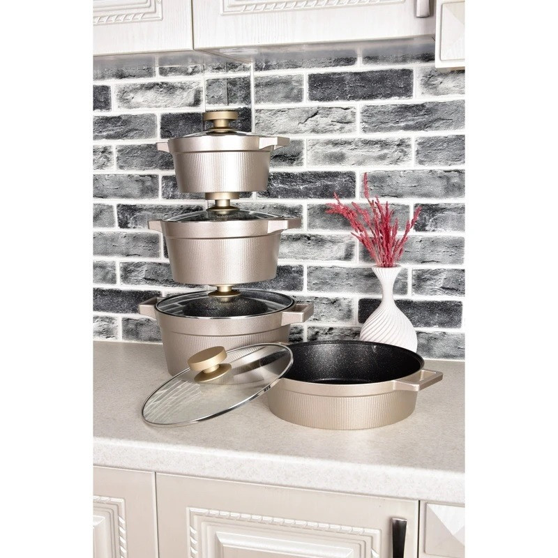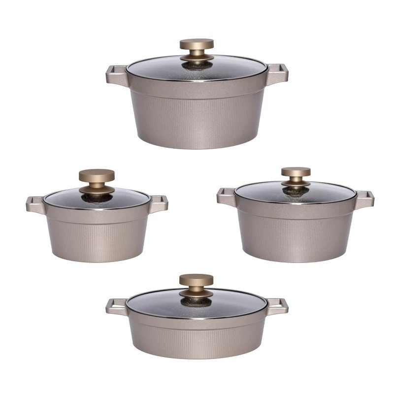 سرویس قابلمه بژ 8 پارچه یک سرویس شامل تابه، قابلمه است که نیاز های پخت و پز آشپزخانه شما را پوشش می دهد. دسته های قابلمه های این سرویس از جنس بدنه و با روکشی عایق حرارت و نسوز هستند. درب ها از شیشه با لبه لاستیکی هستندکه به خوبی روی ظرف کیپ میشوند. این سرویس دارای: قابلمه با سایزهای 20 ، 24 و 28 و تابه 28