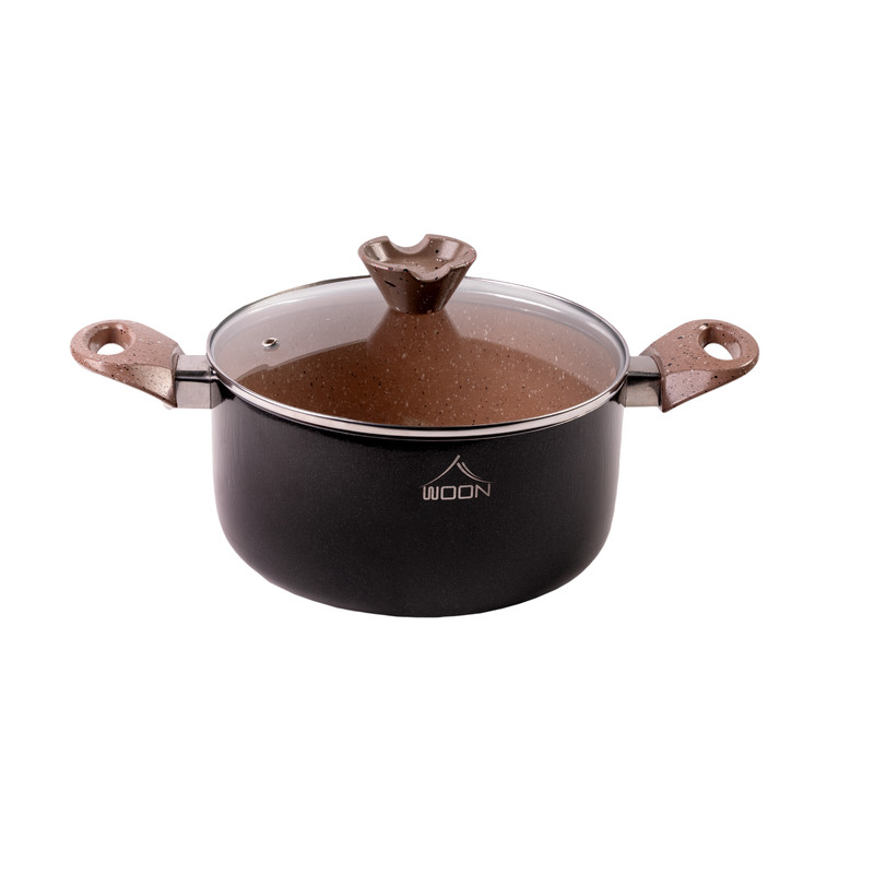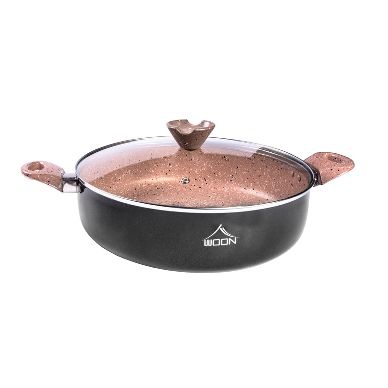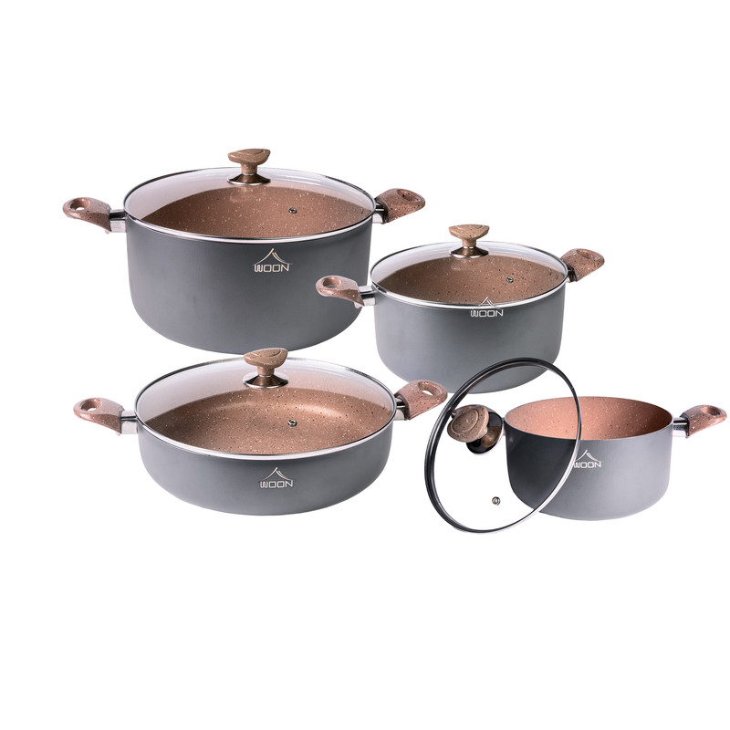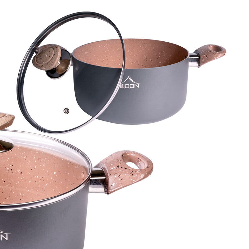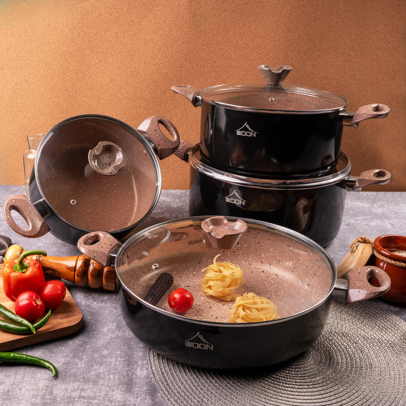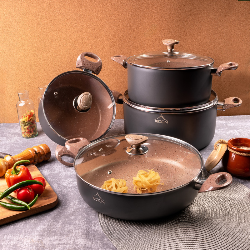 ظروف پخت و پز وون دارای پوشش گرانیت دکو ایتالیا که فاقد هرگونه مواد مضر از جمله سرب کادمیوم و pfoe است. سرویس شامل: قابلمه سایز30-26-22 تابه دودسته سایز30