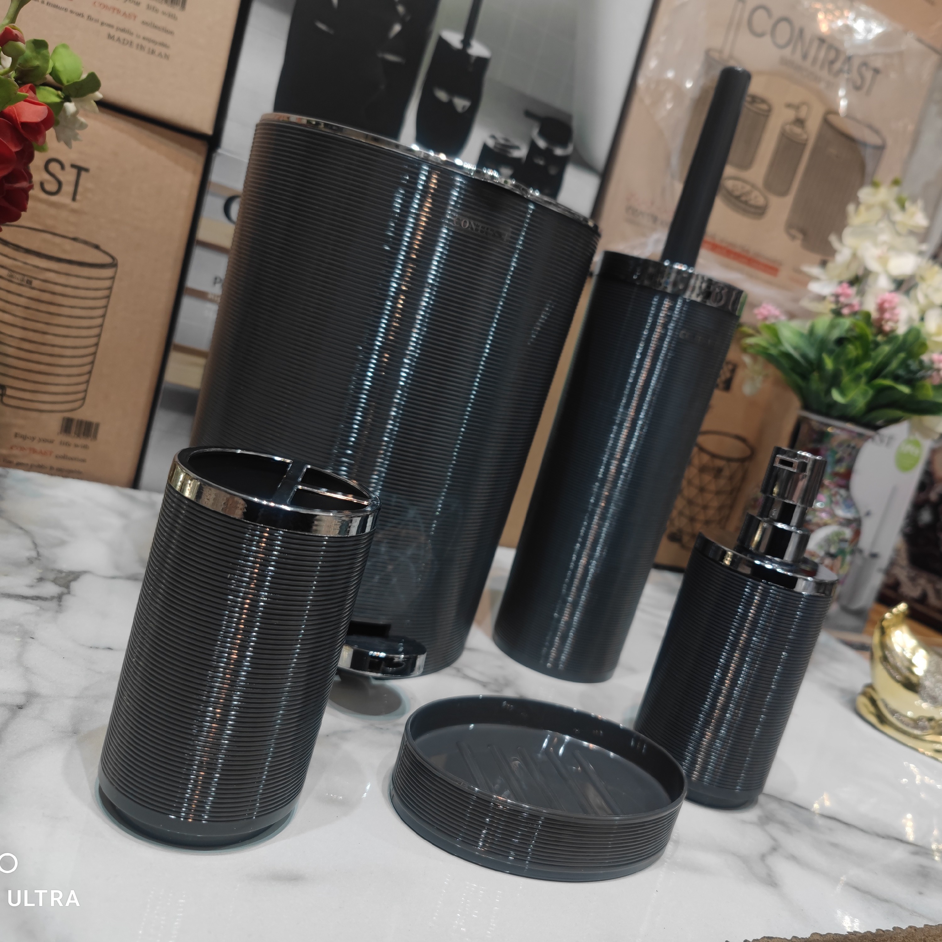 ست سرویس بهداشتی 5 پارچه طرح خط ریز برند کنتراست نو آکبند طرح بسیار زیبا و شکیل و باکیفیت رنگ پرفروش و خاص و جذاب طوسی تیره کروم ست سرویس بهداشتی شامل: 1. سطل زباله پدالی با درب آرامبند و تویی سطل اختصاصی 2. برس مخصوص شستشوی سرویس بهداشتی 3. جامایع دستشویی با سرپمپ باکیفیت آبکاری کروم 4. جای مسواک و خمیردندان 5. جاصابون جامد تضمین کیفیت ساخت عالی و مناسب ارسال سریع به تمام نقاط کشور برای خریداران عزیز