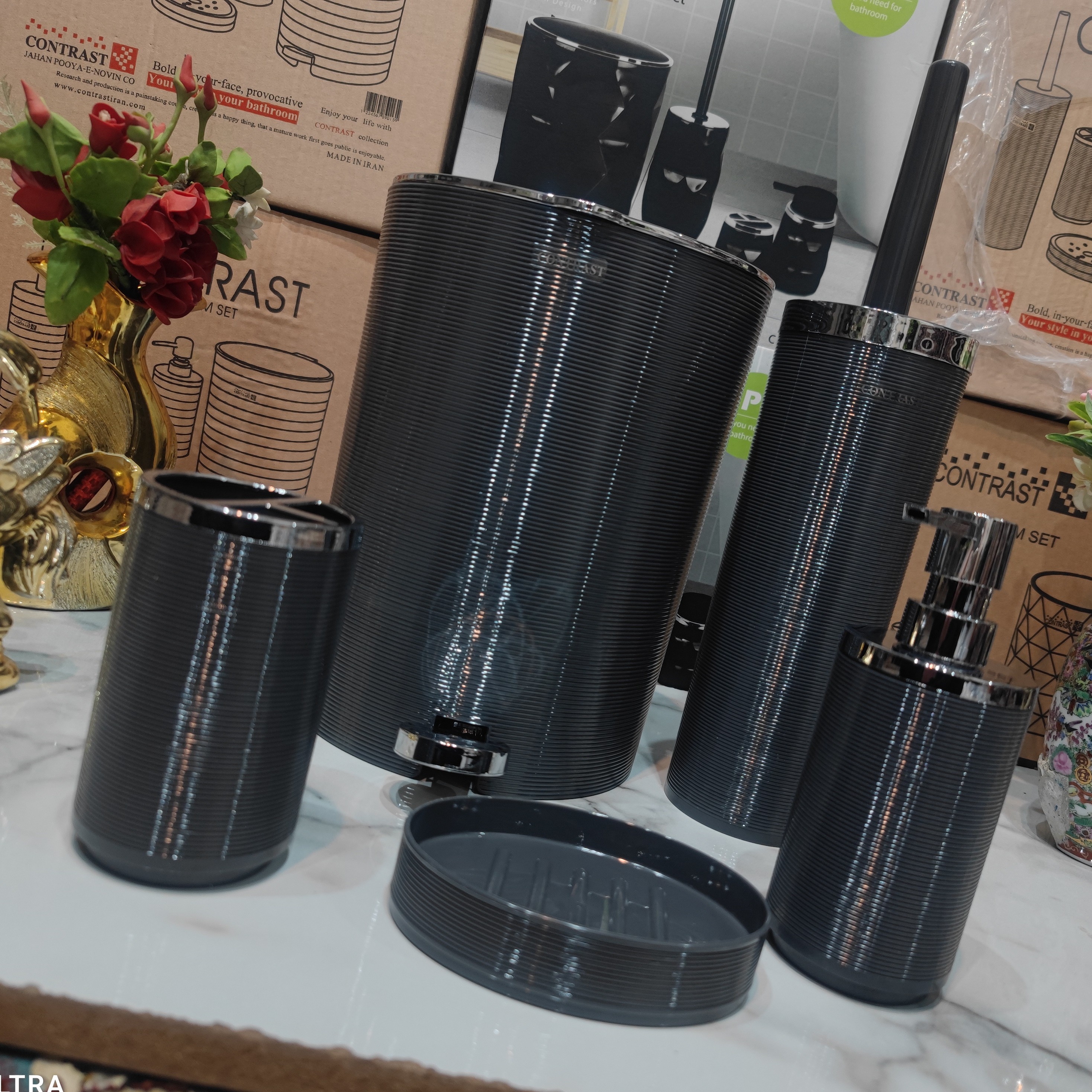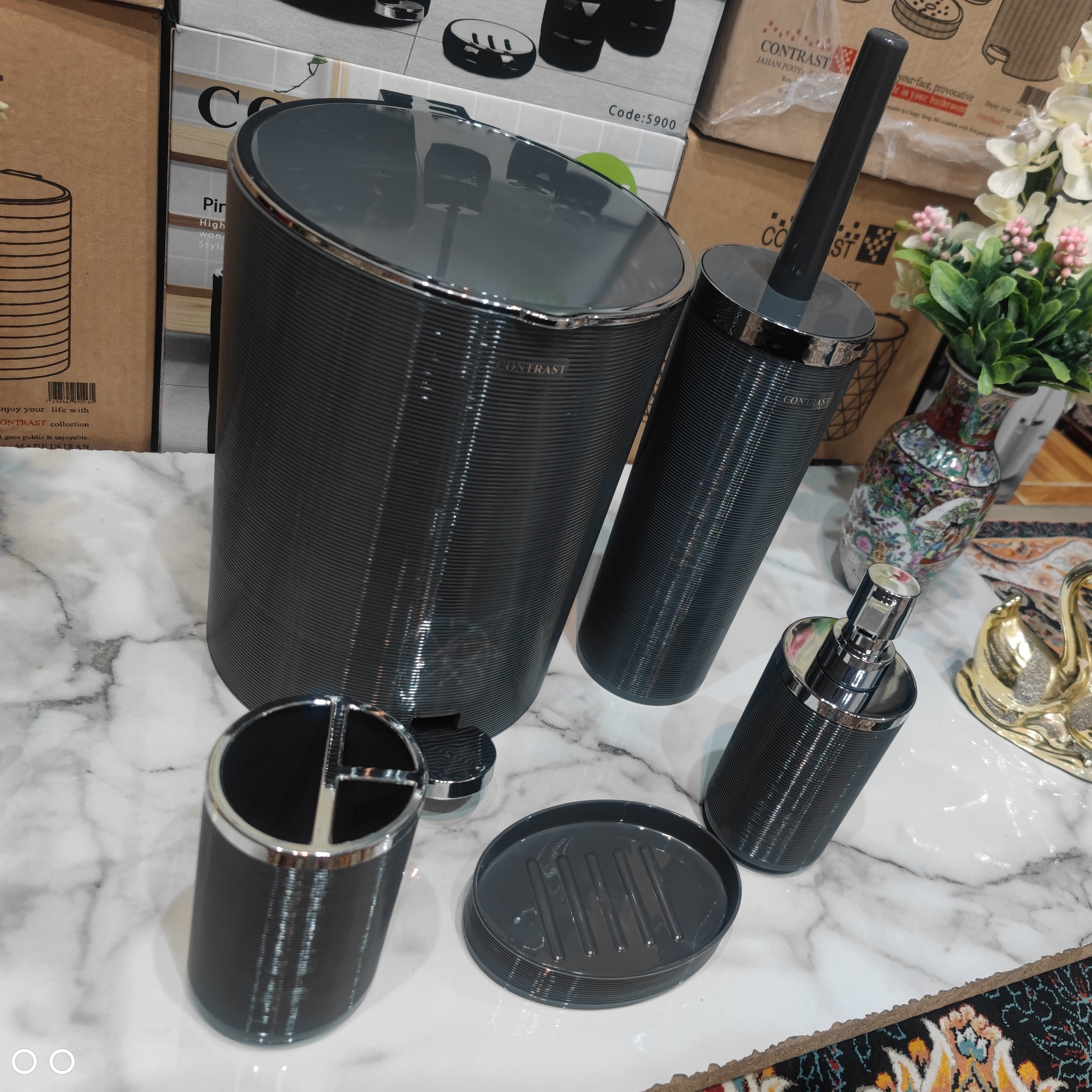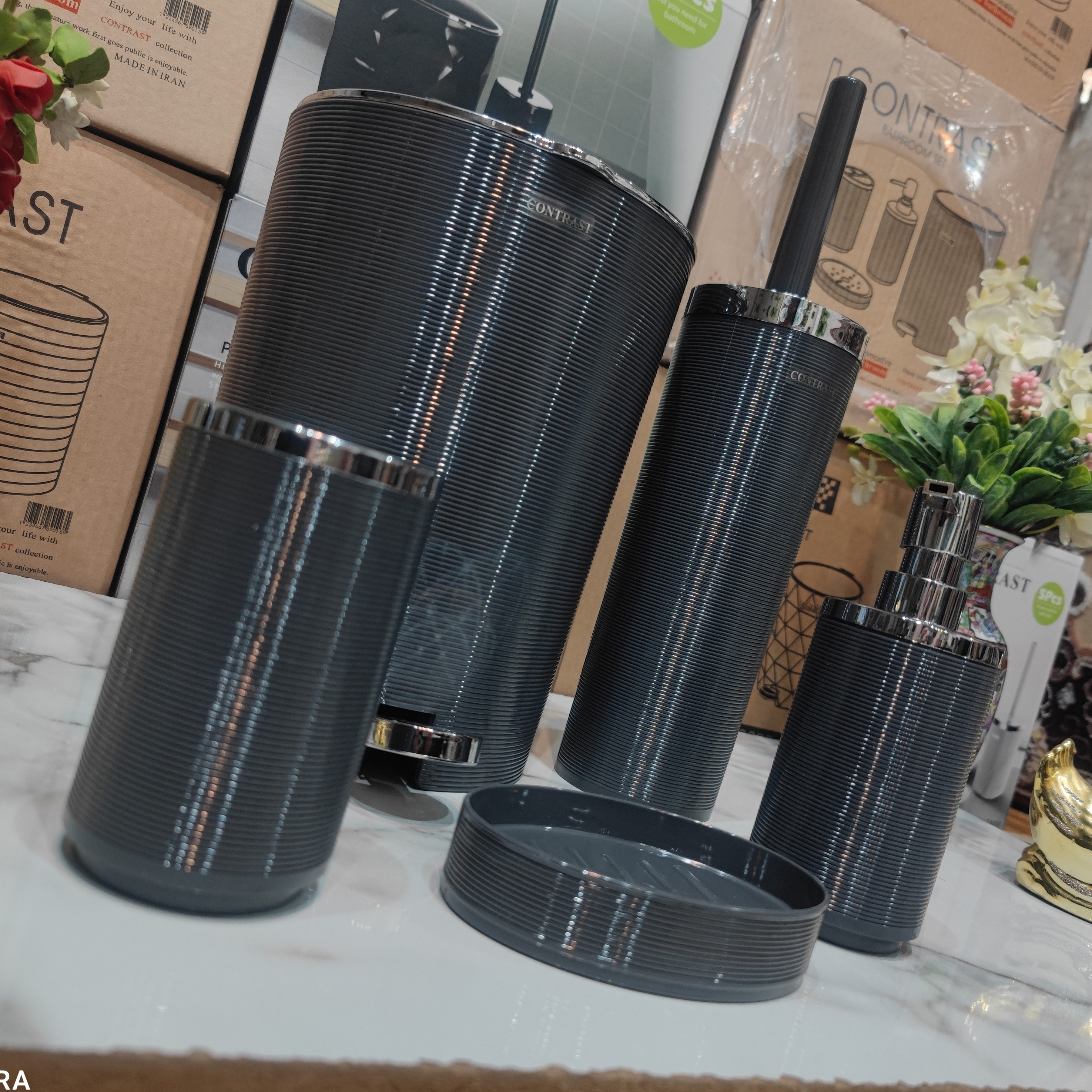 ست سرویس بهداشتی 5 پارچه طرح خط ریز برند کنتراست رنگ زیبا و شکیل طوسی تیرهکروم نو آکبند بسیار زیبا وباکیفیت مبلمونسرا مدل 266214