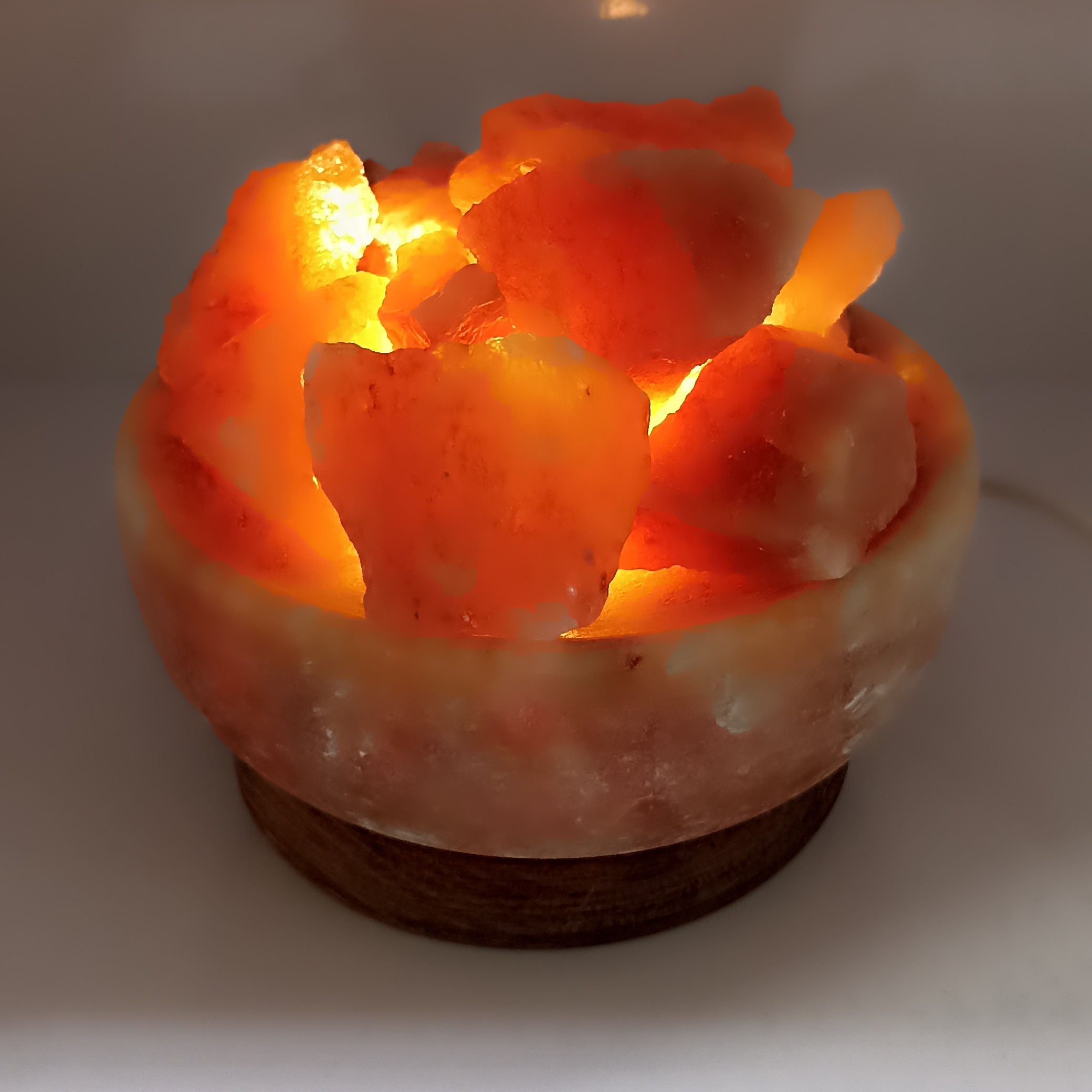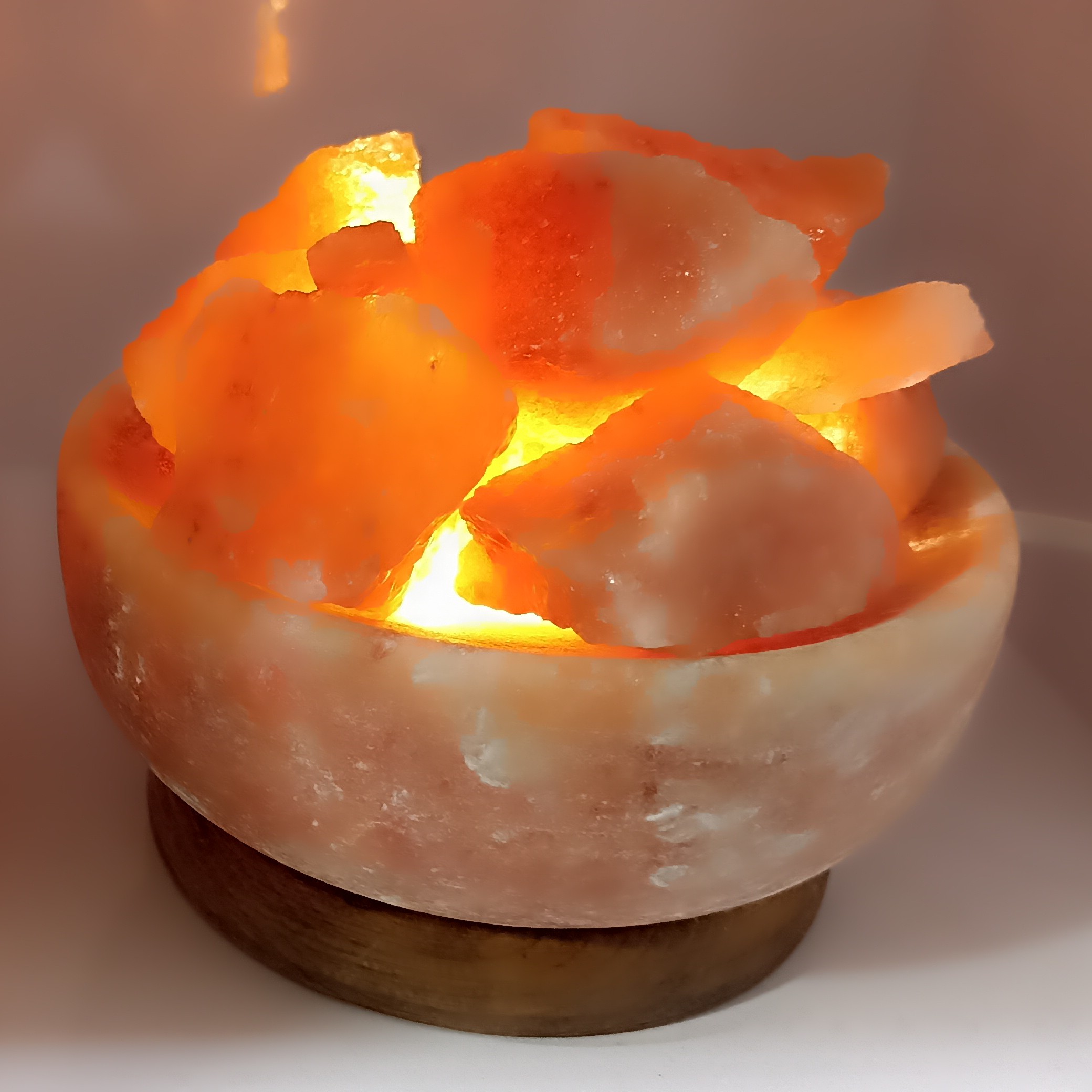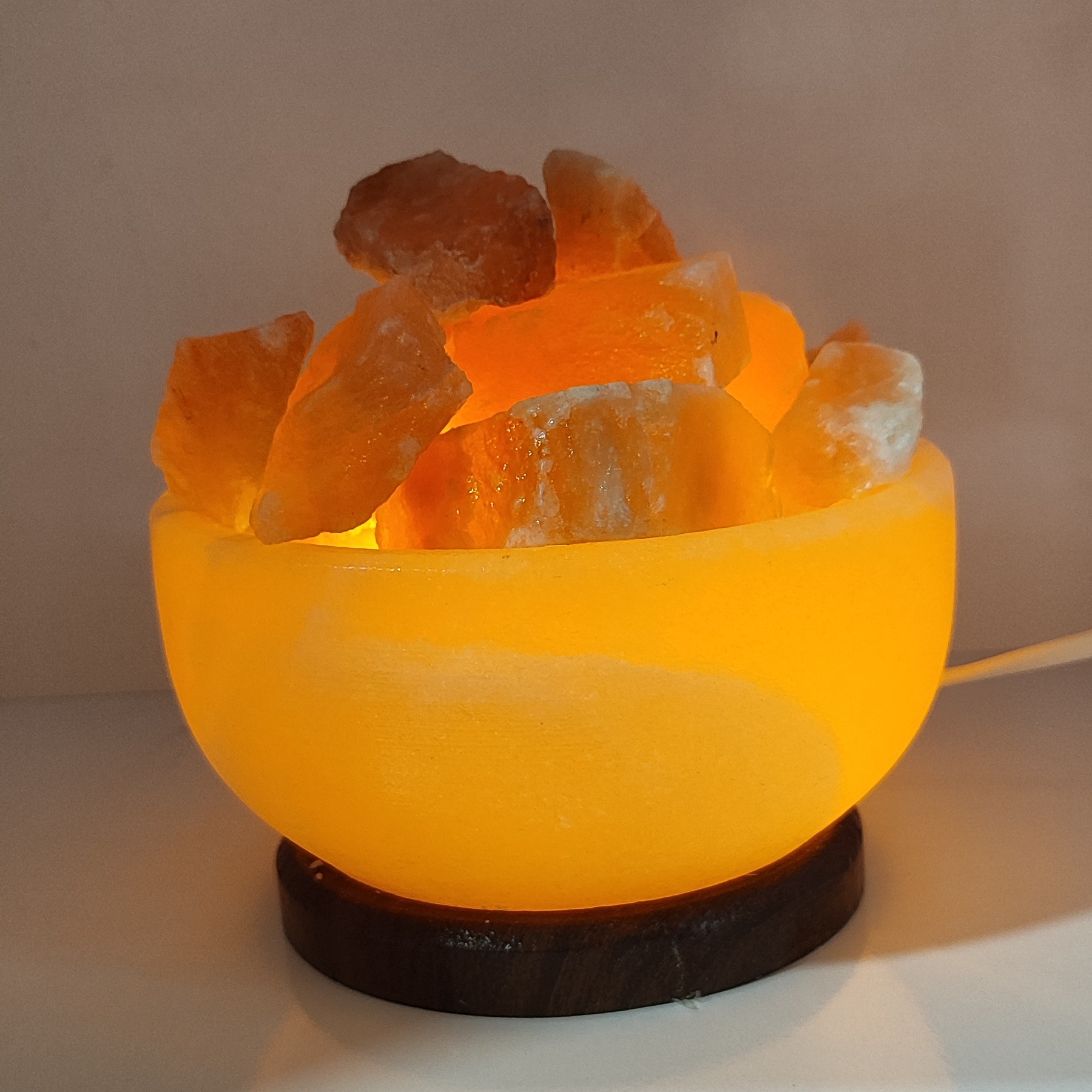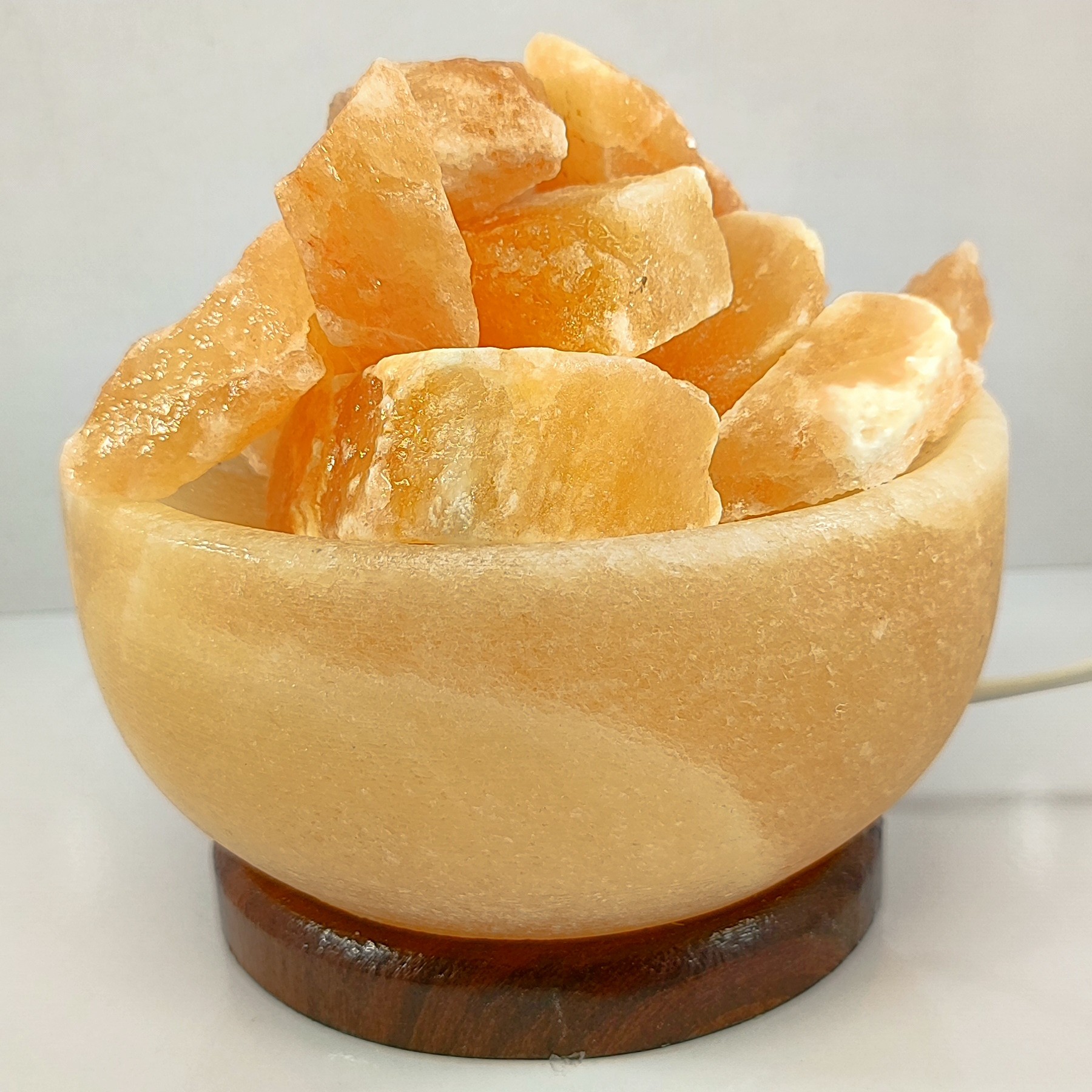 آباژور کاسه ای از جنس سنگ نمک به همراه قلوه سنگهای نمکی با پایه چوبی و سیم کلیددار و لامپ اس ام دی بسیار خاص