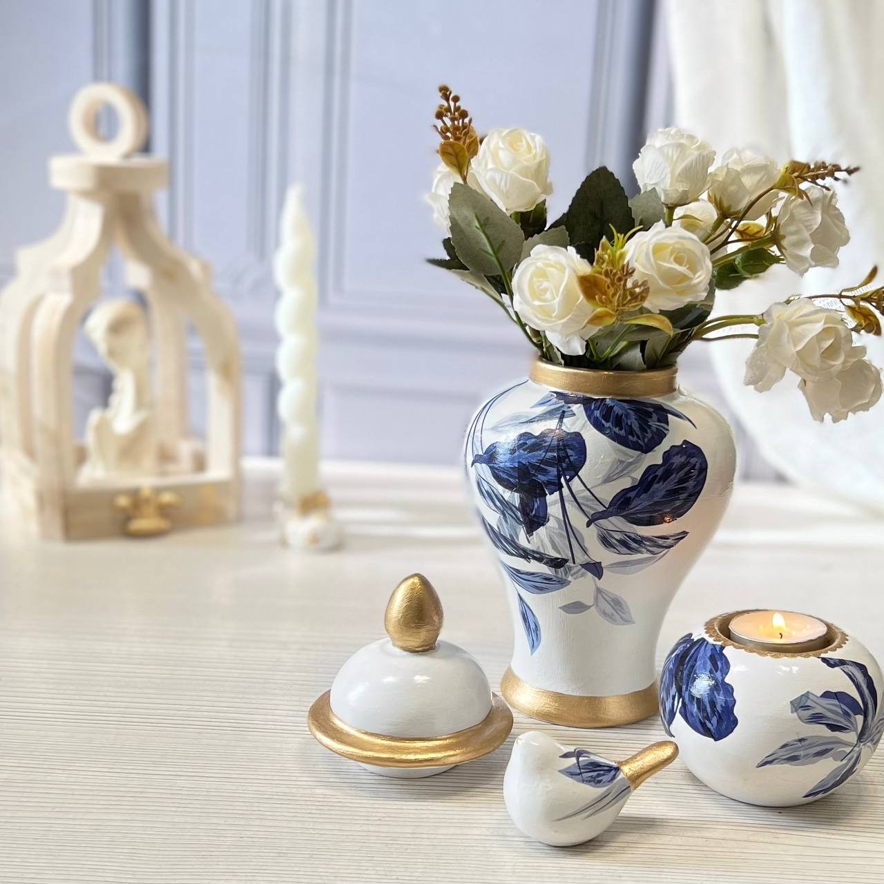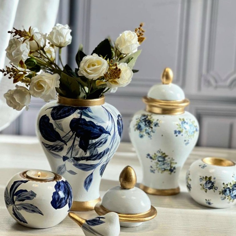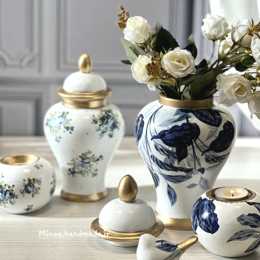 ست 4 ایتم جینجر ارتفاع 20 سانت با احتساب درب650 جاشمعی سفالی متوسط 170 پرنده کوچو 85 سینی 23 سانت سرامیکی 350 با طرح قلم ابی وارداتی ترک وبا کیفیت جینجر پلی استر قابلیت نگه داری آب دارد وبرای گل طبیعی مناسب