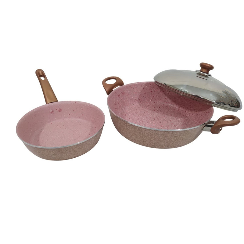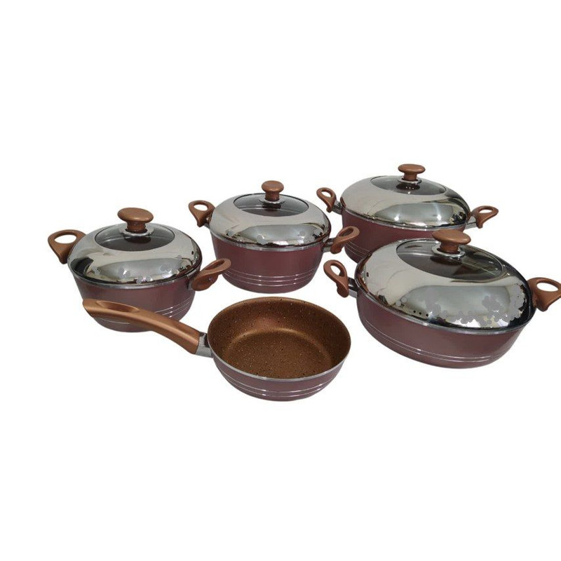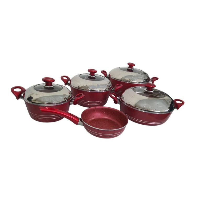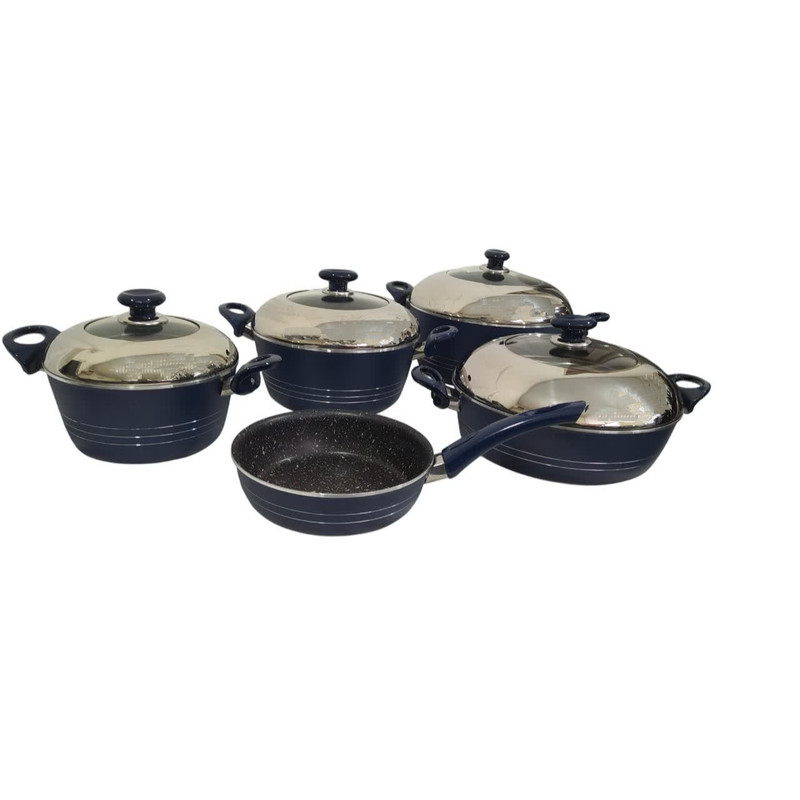 سرویس 9 پارچه مدل نیلوفر ، دارای 3 عدد قابلمه با درب در سایز های 28 و 24 و 20 سانتی متر و دو تابه در سایز های 28 به صورت دو دسته و یک تابه 20 به صورت تک دسته بلند میباشد. جنس داخل قابلمه و تابه ها گرانیت درجه یک میباشد و ورق به کار رفته ضخامت بالا میباشد. رنگ های کوره ای به کار رفته در این سرویس قابلیت تحمل گرمای بالای پخت و پز را دارد. دسته های به کار رفته در این سرویس قابلیت تحمل گرمای زیاد را دارند.