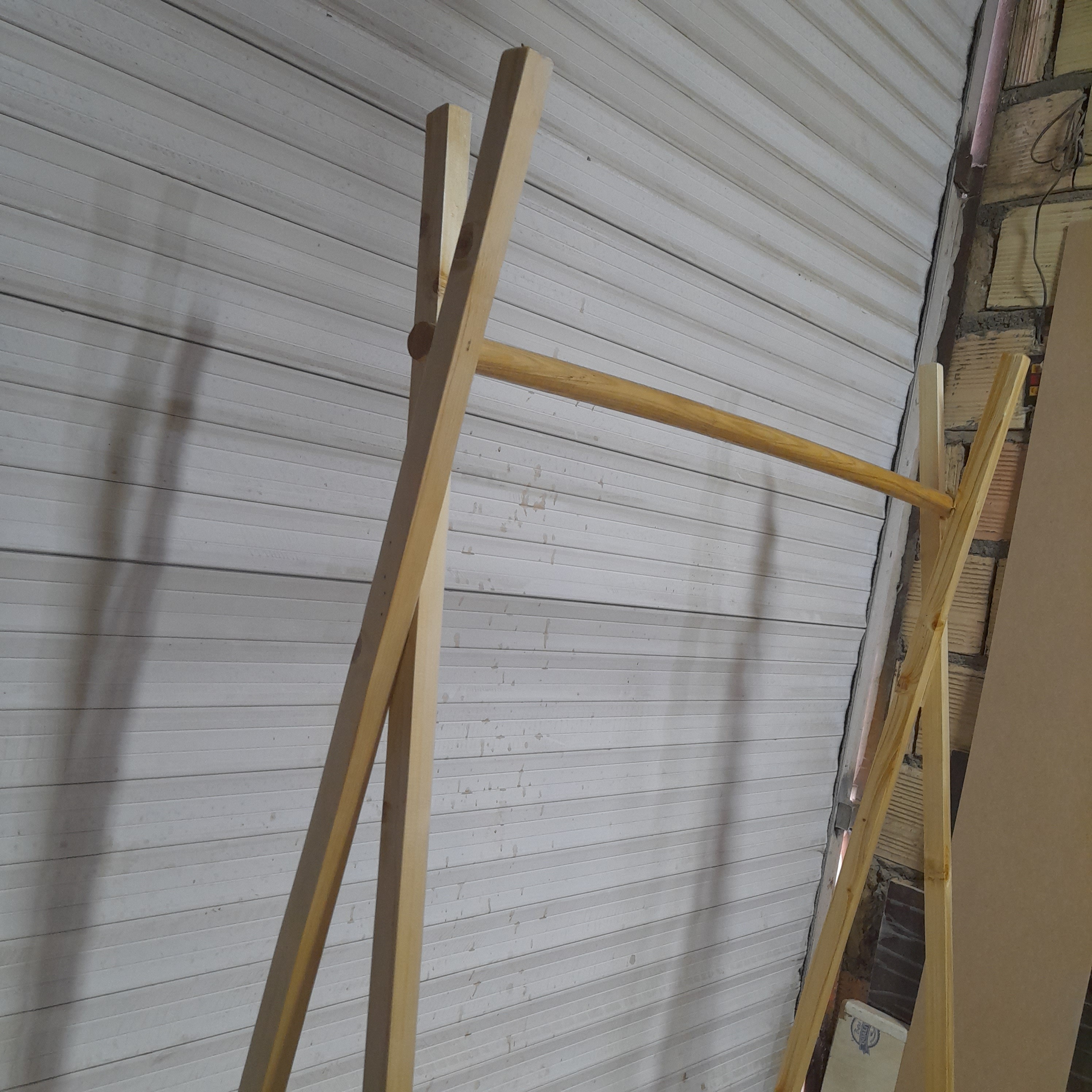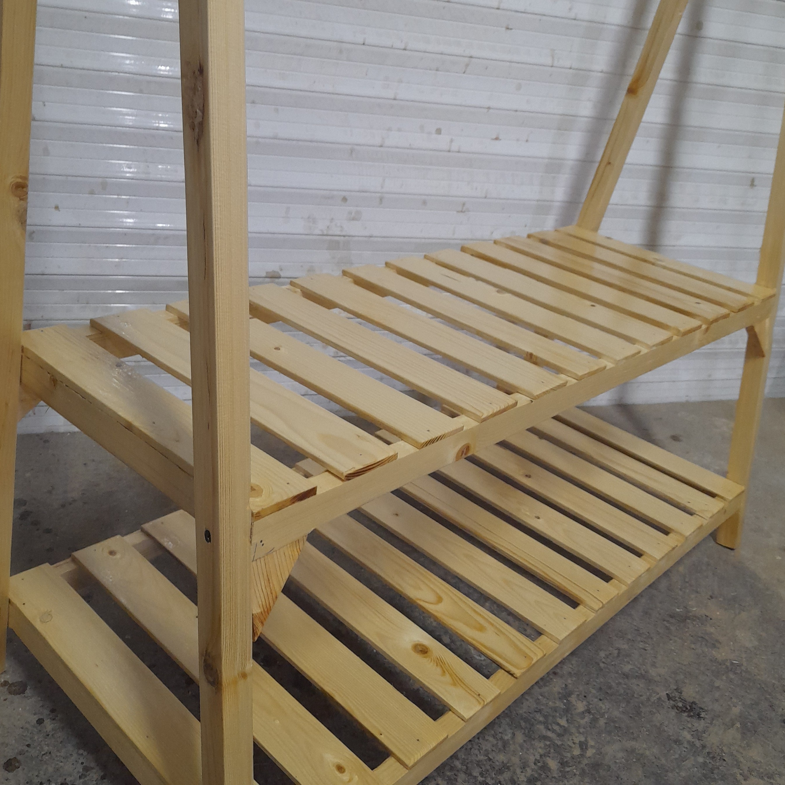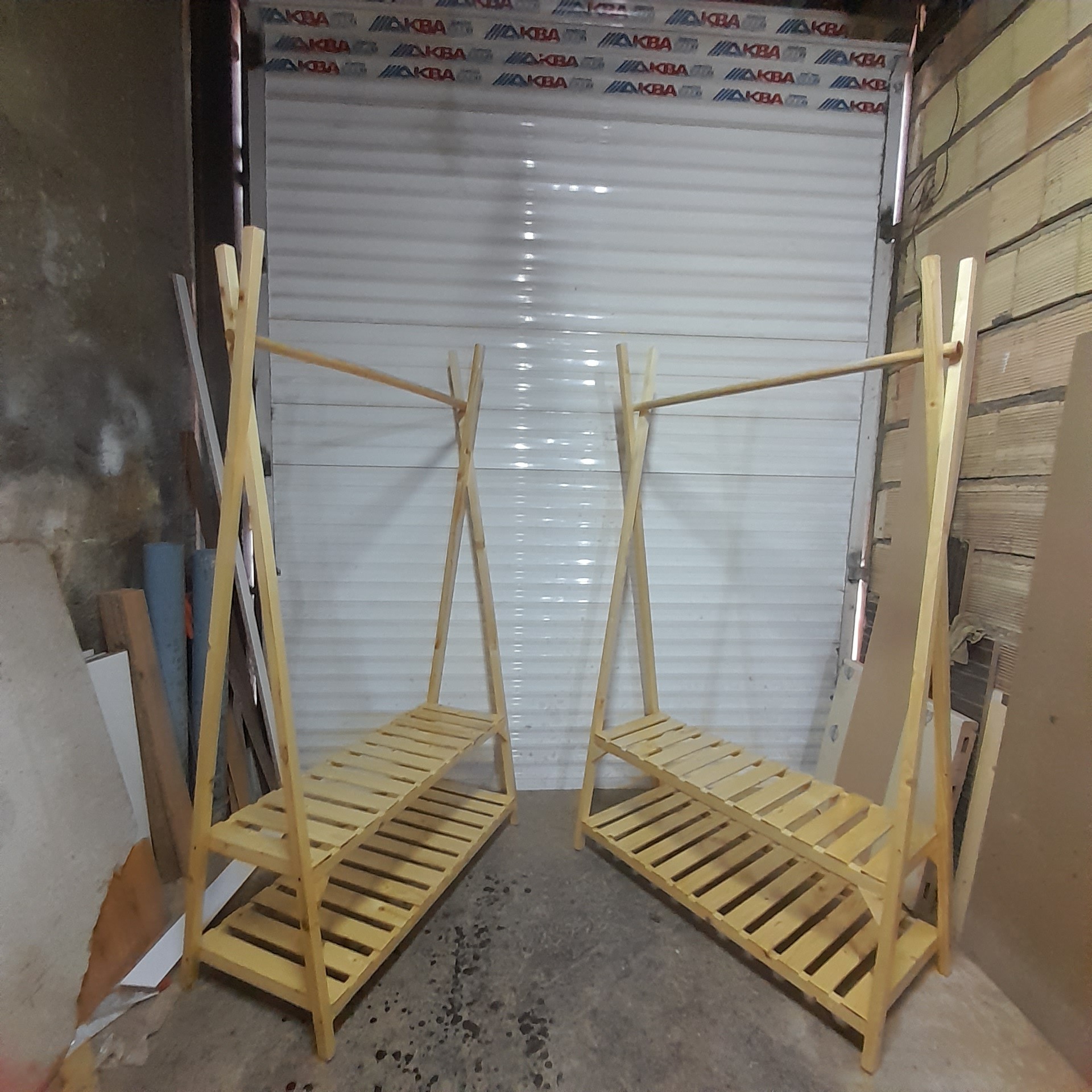رگال لباس چوبی مدل دو طبقه سرخپوستی ابعاد این نمونه رگال به طول ۱متر در ارتفاع ۱۷۵سانتی سانتی متر میباشد این کار کرم روشن یا همان خودرنگ چوب جلاخورده میباشد