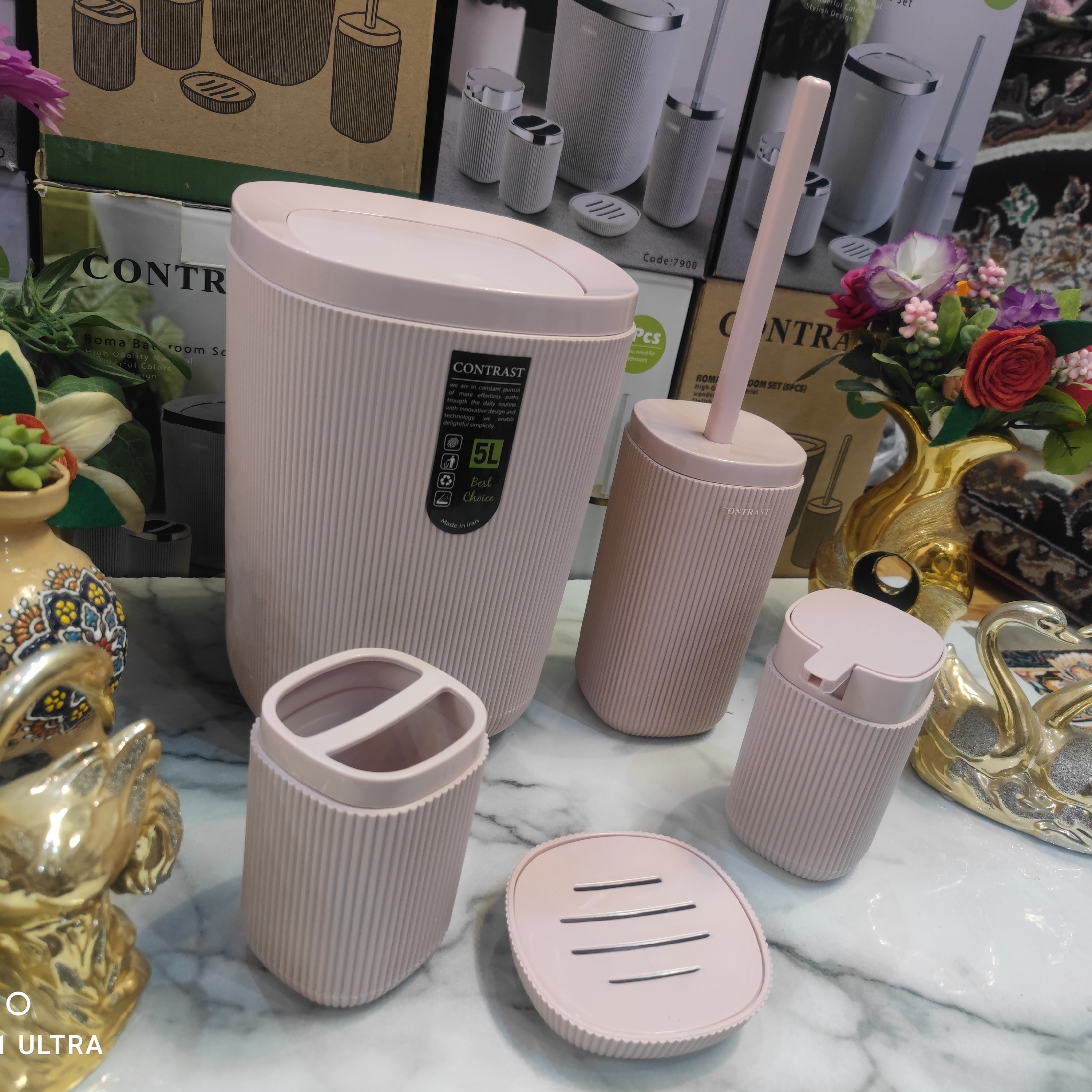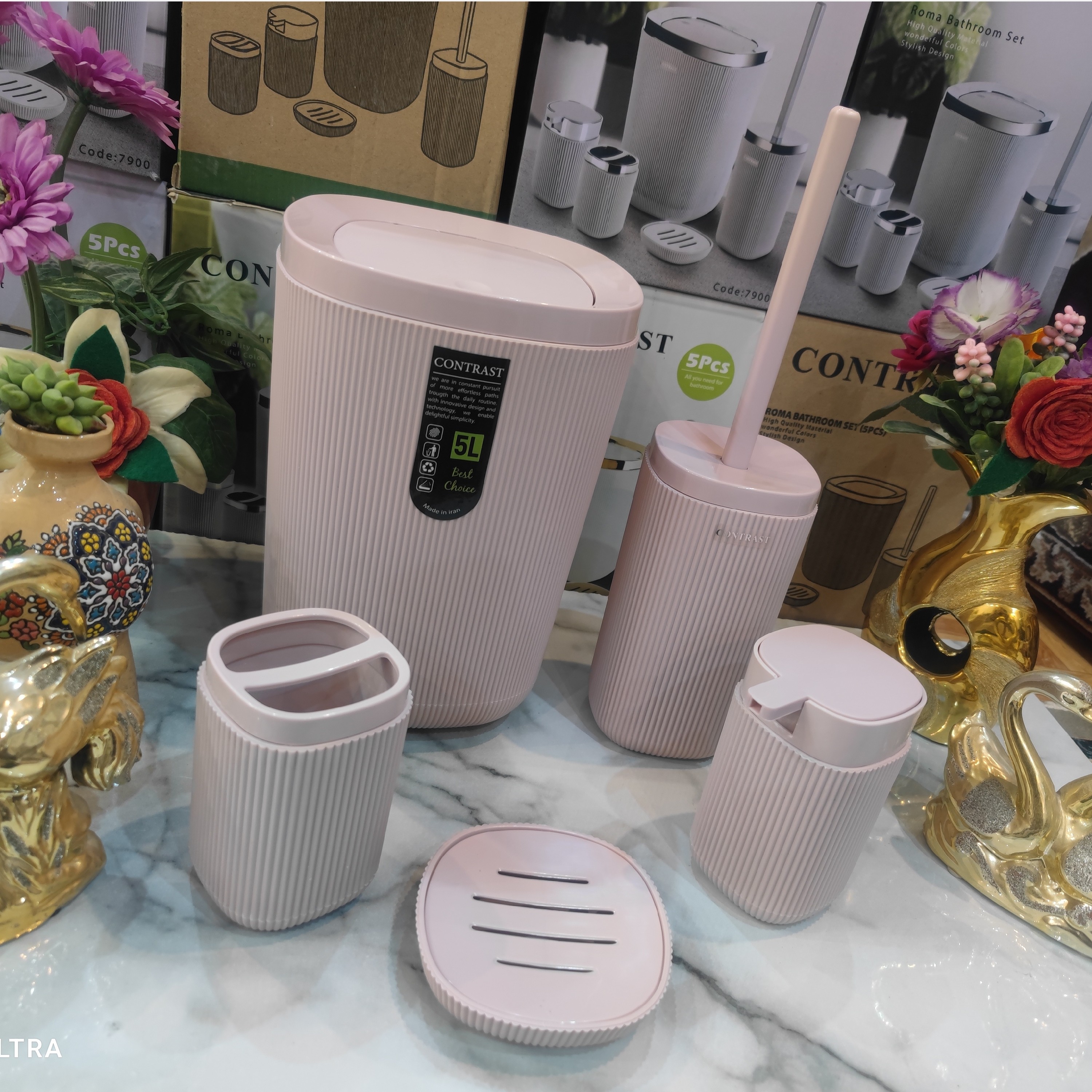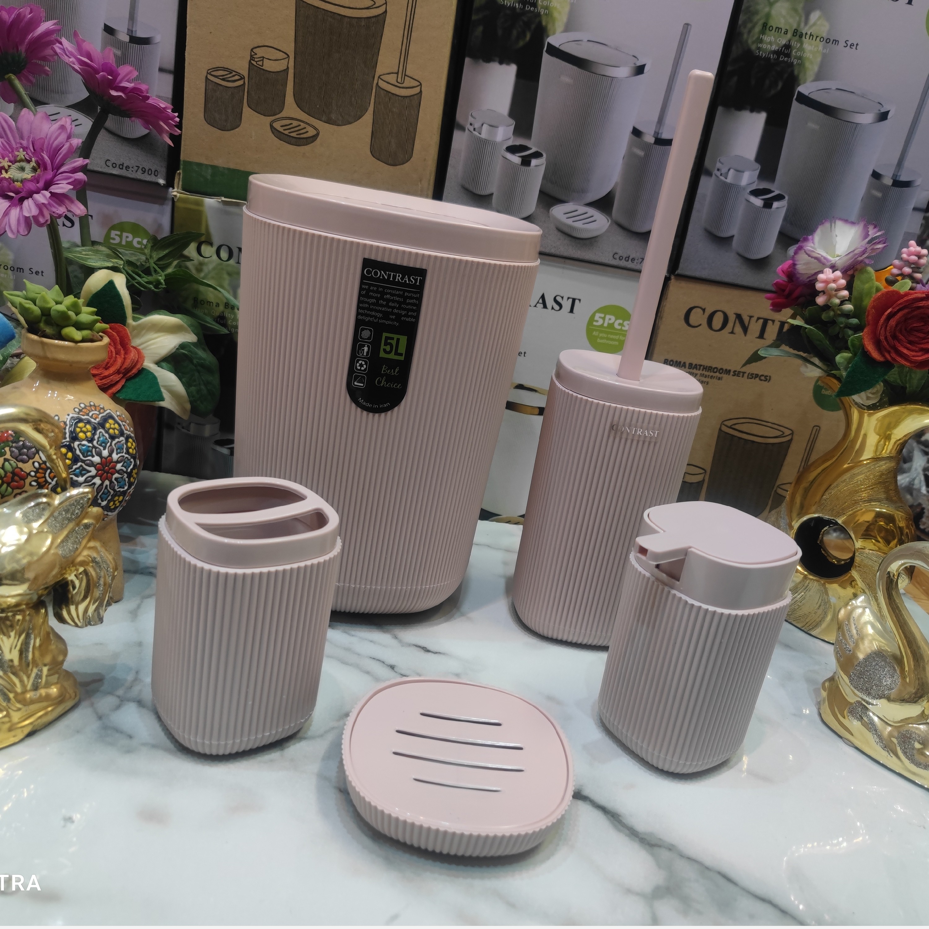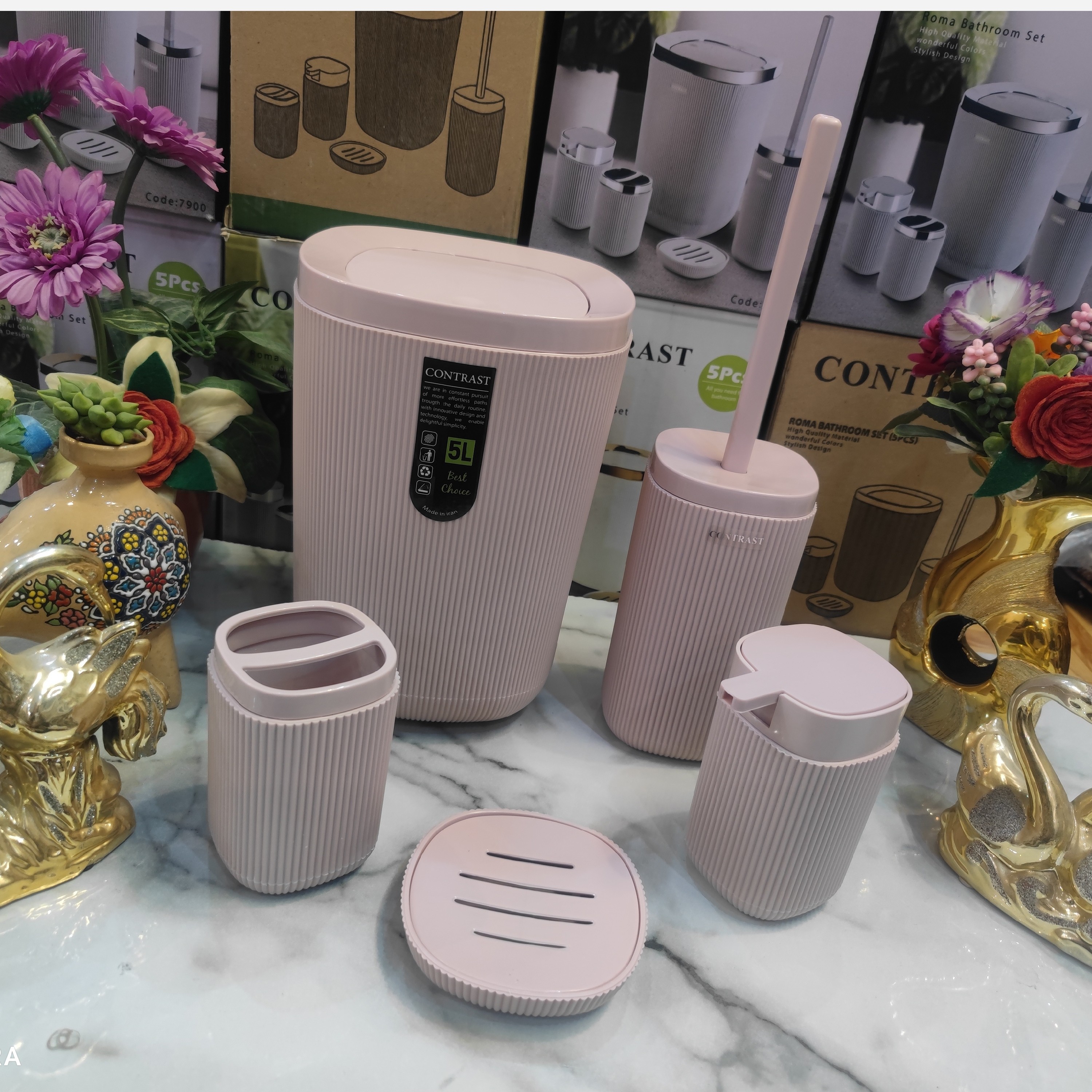 ست سرویس بهداشتی 5 پارچه طرح جدید روما خطی شیاردار برند کنتراست نو آکبند رنگ بسیار زیبا و شکیل و جذاب و خاص صورتی کرپ کیفیت ساخت بسیار مناسب و قیمت عالی و مناسب مناسب استفاده در سرویس بهداشتی یا جهیزیه ست سرویس بهداشتی شامل: 1.سطل زباله با درب بادبزنی باکیفیت بالا 2.برس مخصوص شستشوی سرویس بهداشتی 3.جامایع دستشویی با سرپمپ باکیفیت 4.جای مسواک و جای خمیر دندان 5.جای صابون جامد ساخته شده از پلاستیک فشرده اکرولیک درجه یک آنتی باکتریال طرح بسیار زیبا و جذاب روما خطی رنگ صورتی کرپ ارسال سریع به تمام نقاط کشور برای خریداران عزیز