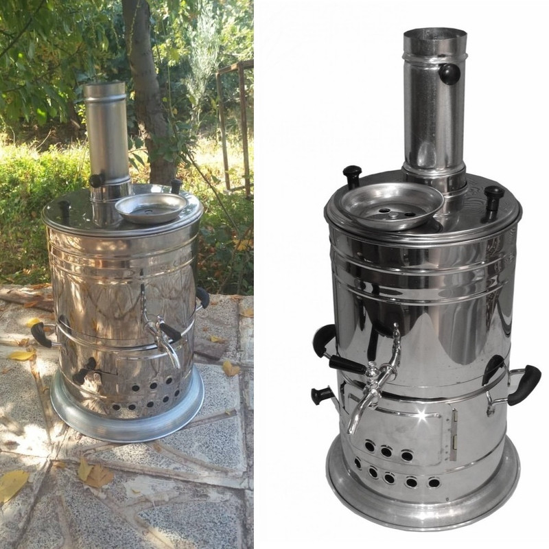 سماورتمام استیل بوده دوتکه( مخزن اب و مخزن زغال) و قابلیت استفاده با زغال و هیزم می باشد جوشاندن اب در 7-12 دقیقه و امکان استفاده از مخزن اتش برای گرم کردن غذا م باشد قابلیت حمل اسان دارد. عادت ما ایرانیها به نوشیدن چای در وعده¬های مختلف انتخاب مناسب سماور به عنوان وسیله-ای برای تهیه این نوشیدنی مورد پسند حائز اهمیت است. از آنجا که طعم چای آتشی بیشتر از مورد پسند ذائقه ما ایرانی ها بوده معرفی سماور استیل هیزمی به¬عنوان وسیله¬ای برای تهیه این چای خالی از لطف نیست. سماور استیل هیزمی با طراحی شیک و زیبا علاوه بر استفاده برای تهیه چای می توان به عنوان یک وسیله دکوری زیبا در خانه و حتی سفره خانه¬های سنتی از آن استفاده کرد. سماورهای تمام استیل زغالی نسبت به نیاز شما در اندازه های 5 لیتری و 8 لیتری موجود می باشد. سماورهای هیزمی تمام استیل دارای دو تکه مخزن آب و آتش دان می باشند که از همدیگر جدا می¬شوند مخزن آب را می توان جداگانه به عنوان کتری روی شعله گاز استفاده کرد و از قسمت آتش دان برای پختن و دم کردن غذا استفاده کرد. این سماور های هیزمی با توجه به وزن و حجم مناسب به راحتی قابل جابه جایی هستند و می توان از آن به عنوان سماور یی در سفرهای تفریحی آنرا را به همراه خود داشته باشید و برای تهیه یک چای آتیشی از آن بهره ببرید.