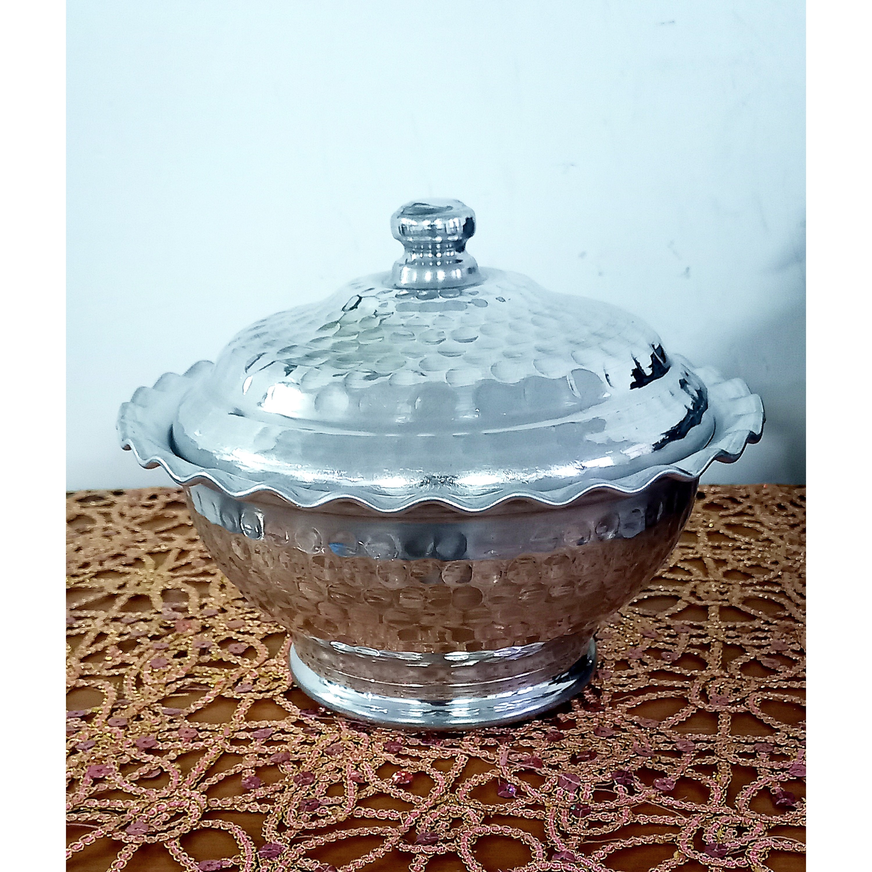 یک محصول بسیار زیبا و بسیار کاربردی این محصول زیبا دقیقا شبیه مس می باشد و با هزینه کمتری یک دکوری زیبا دارید این محصول زیبا بعنوان شکلات خوری و آجیل خوری و ظرف برای دسر و حتی سایز بزرگش برای سوپ و آش هم استفاده میشه زیبایی منحصر به فرد که طرح چکشی داره و لبه های آن که کنگره ای می باشد و کیفیت بالا و قیمت مناسب آن را یک محصول فوق العاده کرده است