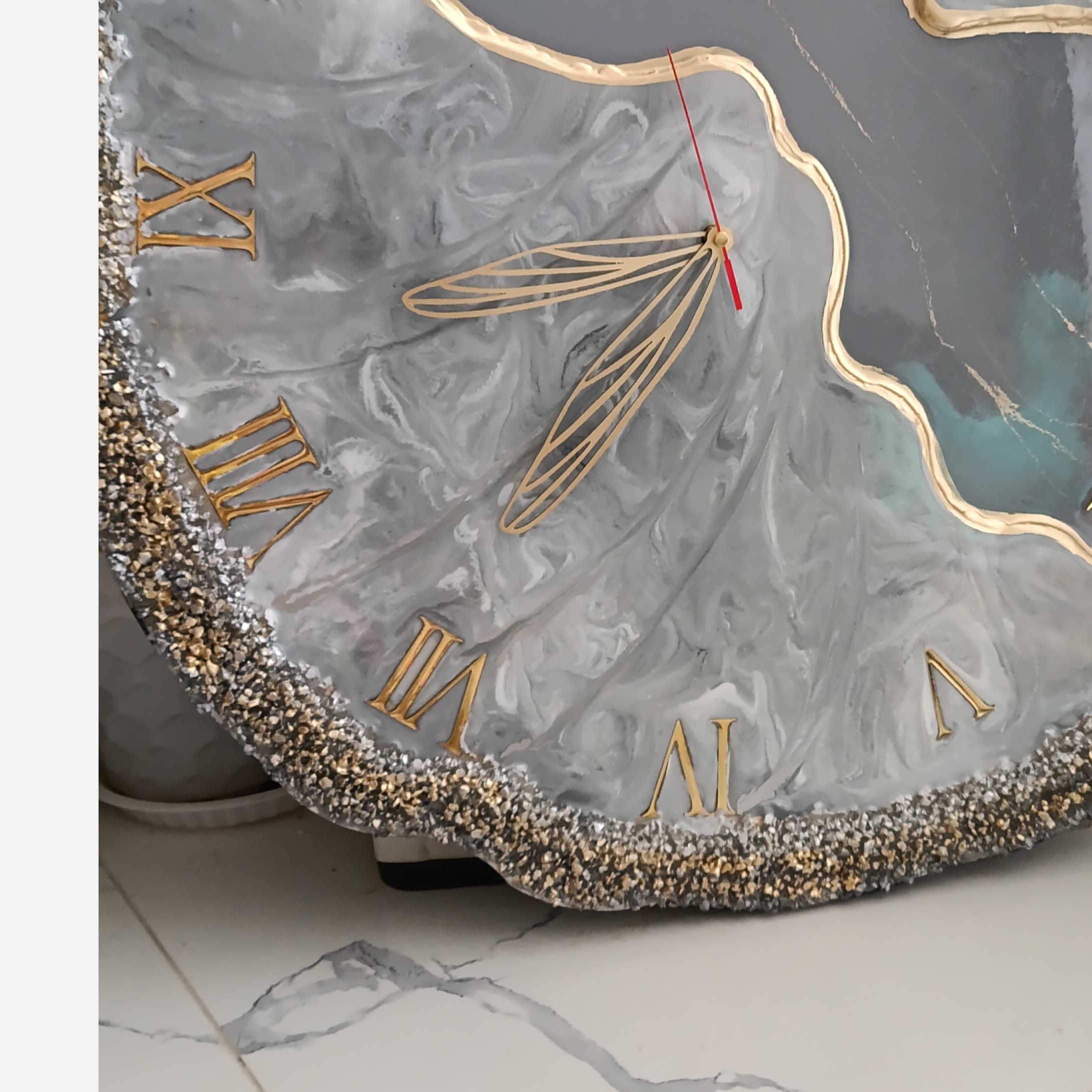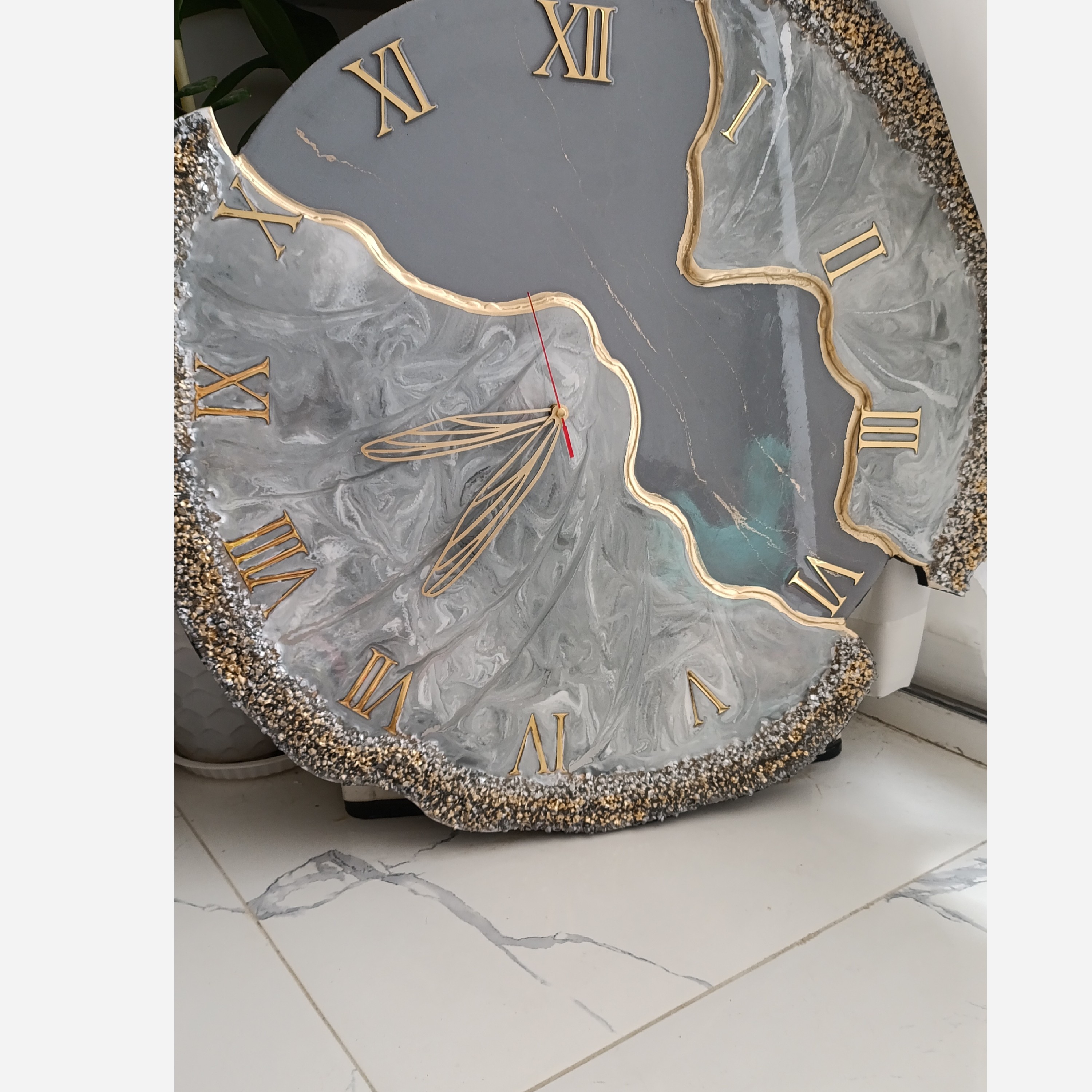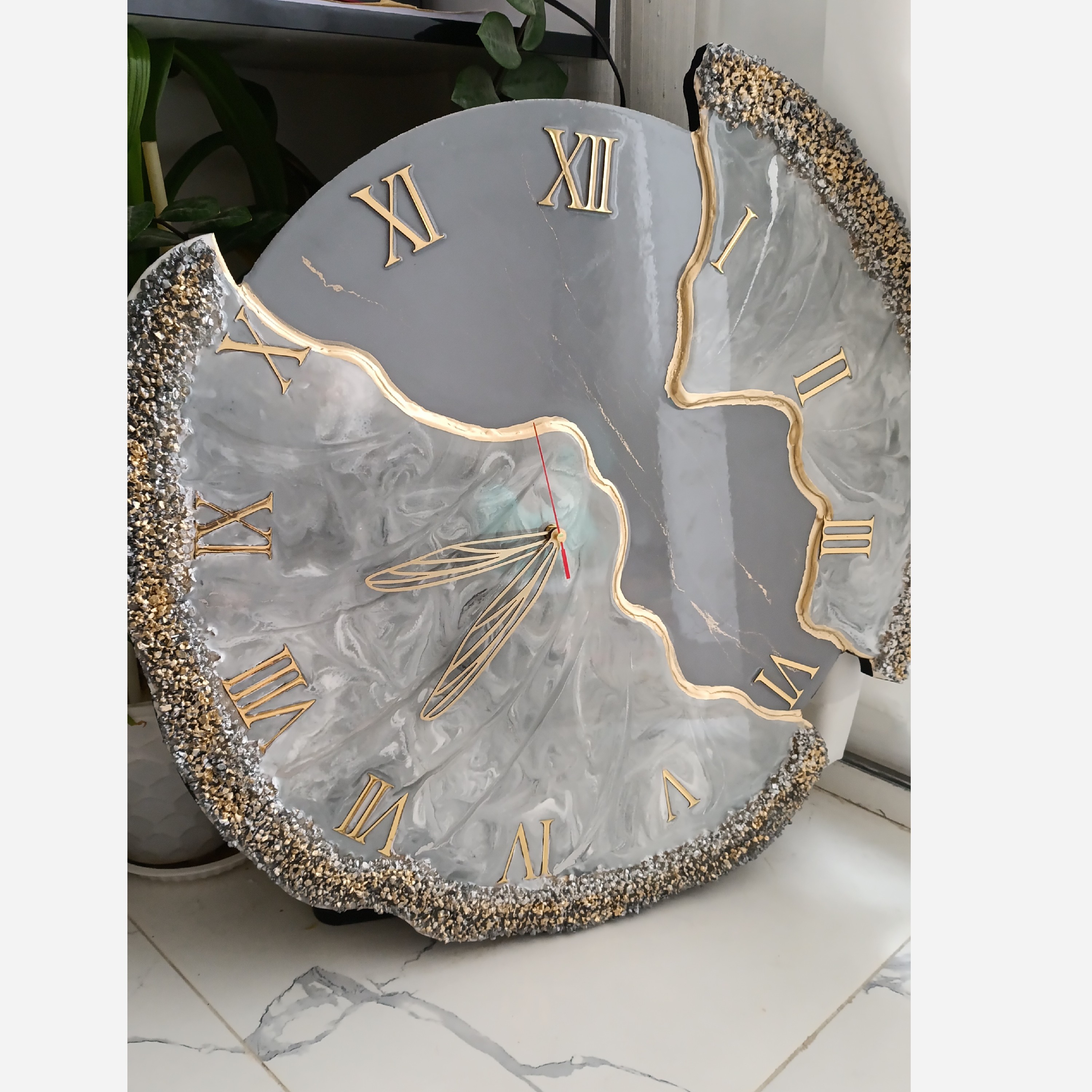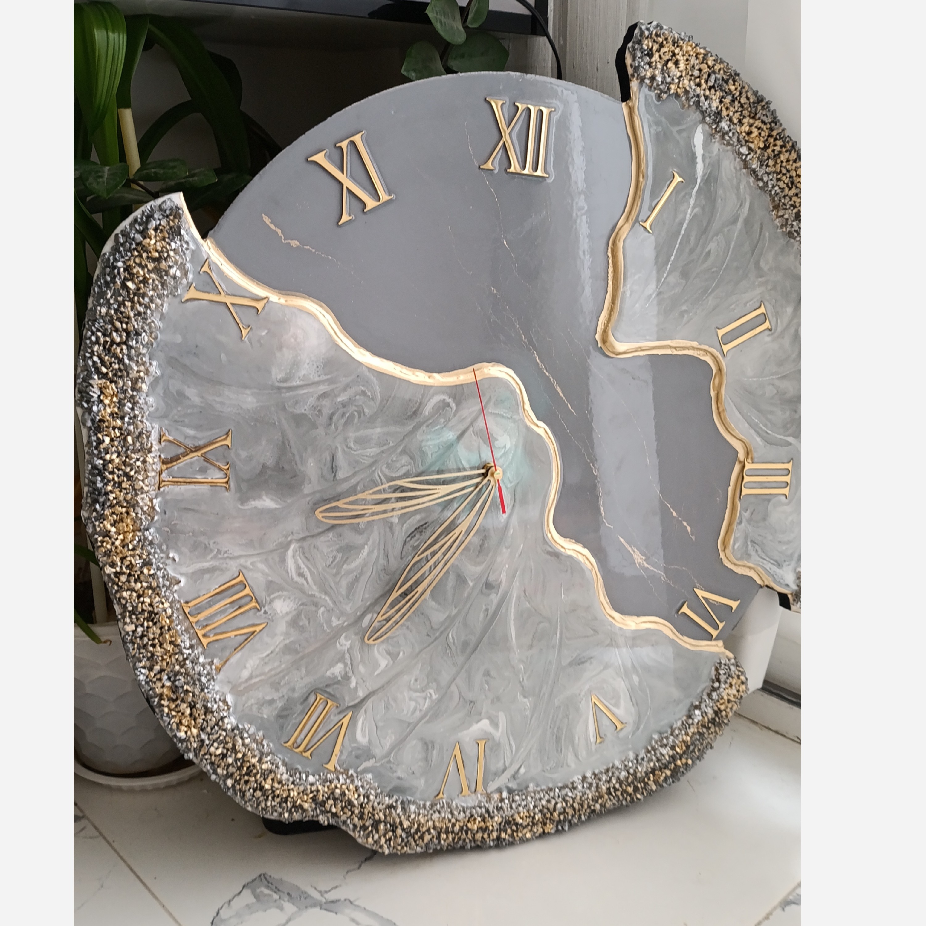 ساعت دیواری رزینی سایز 60 رنگ طوسی کار شده با پودرفلز نقره قابل اجرادر هرسایز ورنگی با موتور تایوانی آرامگرد