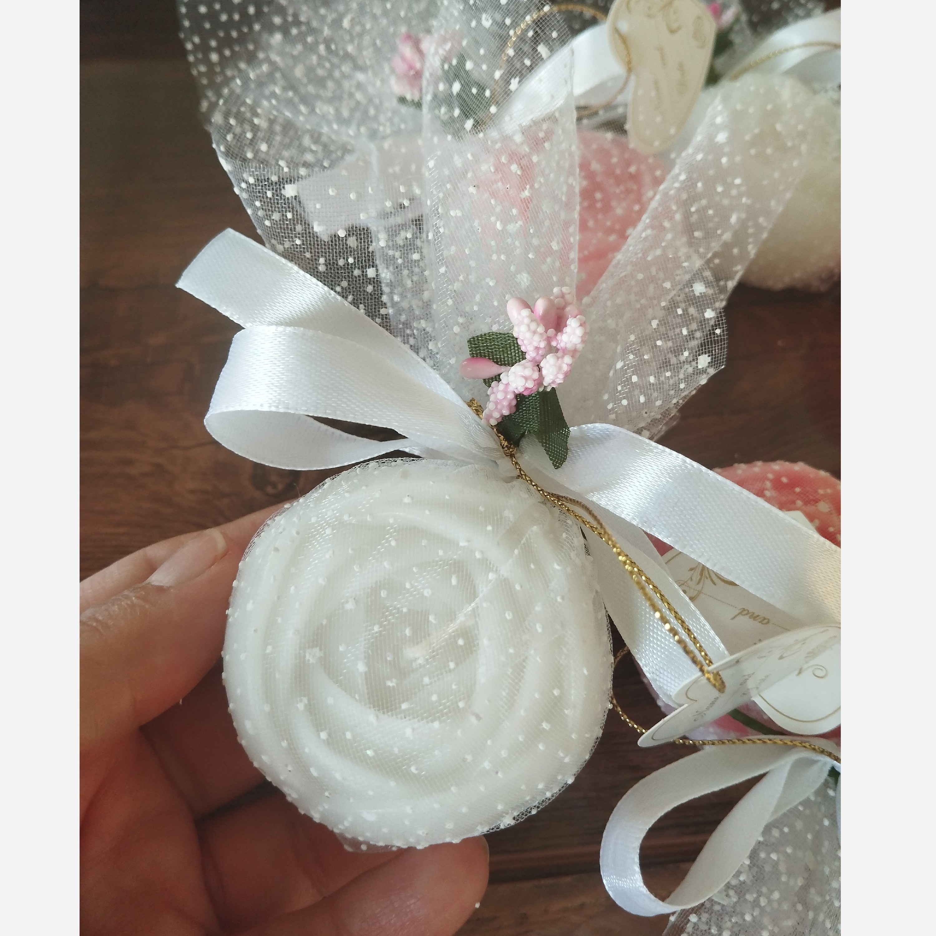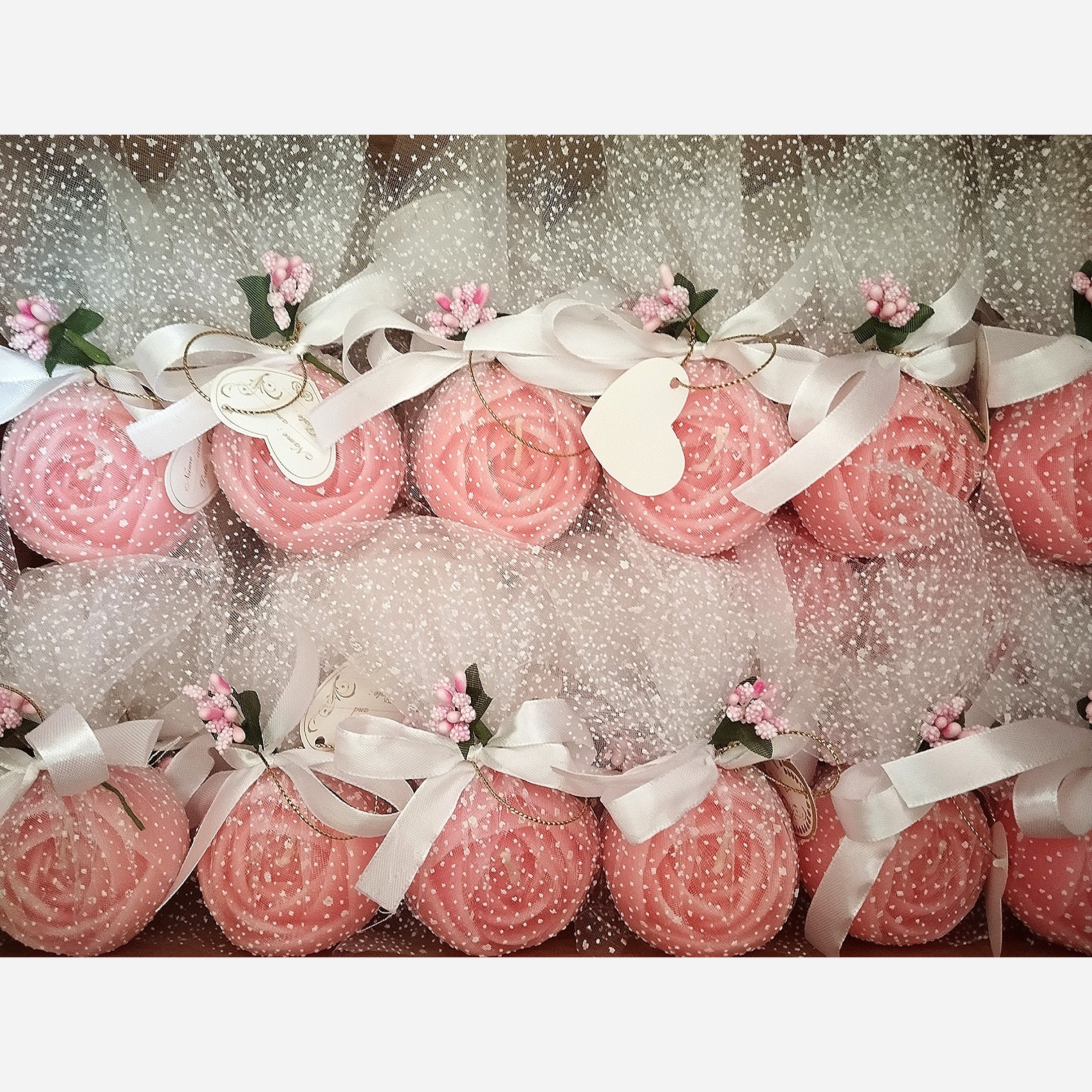 شمع پیونی:پارافین یک درصد،تور،روبان،گل تزئینی، تگ اسم(اختیاری)