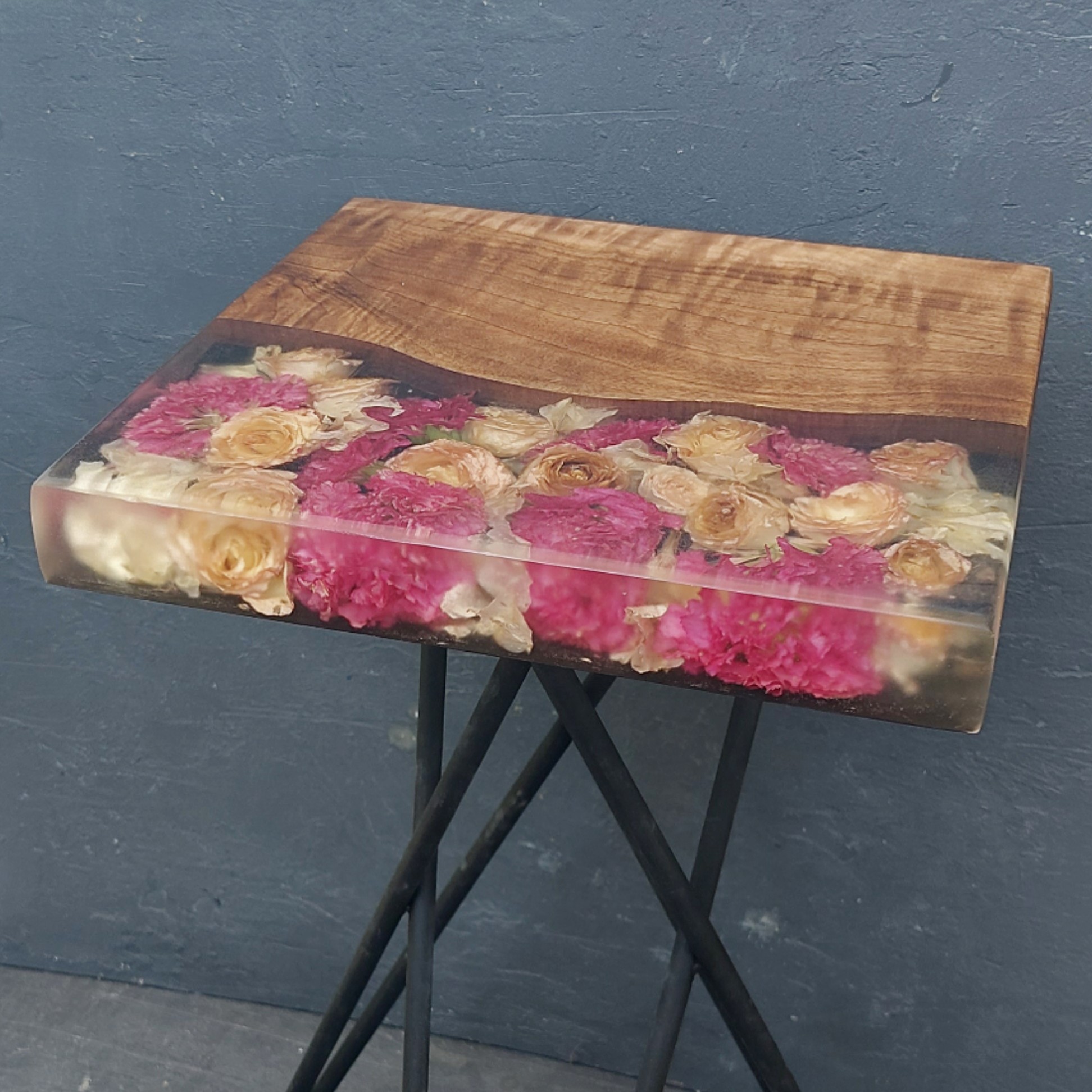 میز عسلی چوب و گردو همراه با گلهای طبیعی رز مینیاتوری و میخک مینیاتوری. چوب استفاده شده :گردو. ارتفاع پایه 45 سانتی متر