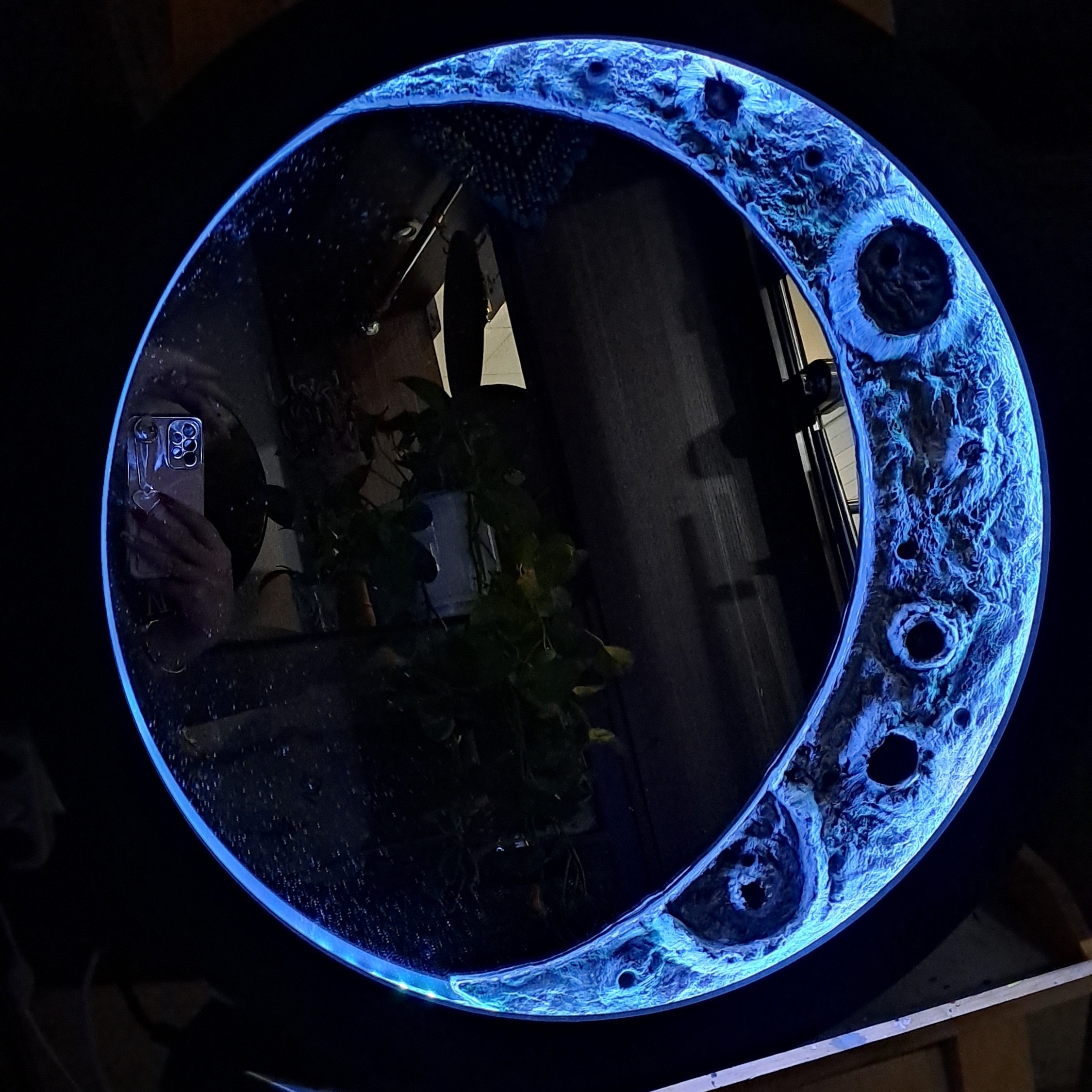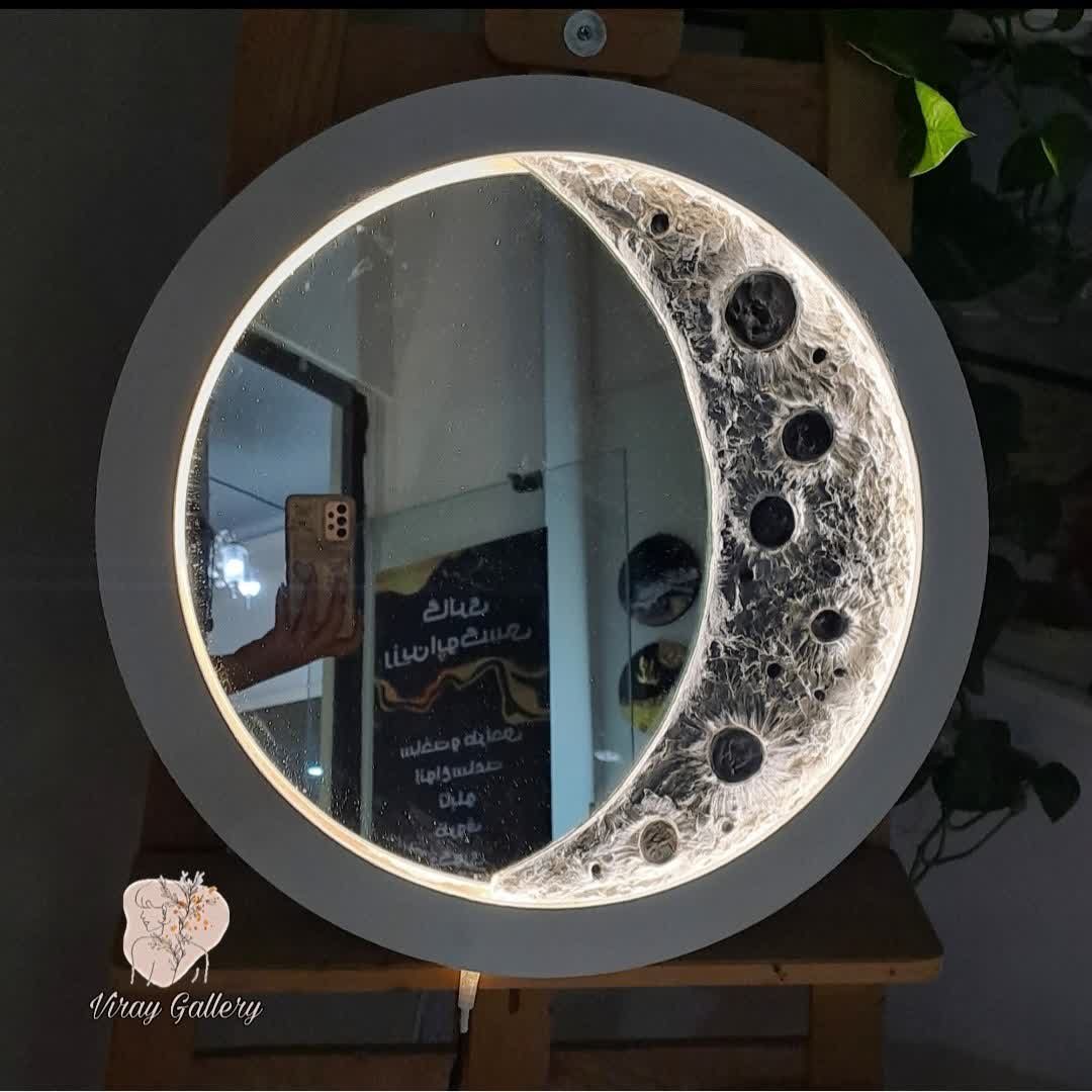تابلو ماه و آینه نورانی هلال ماه و آینه ۶۰ Cm ماه برجسته قاب ۴ سانت مشکی برقی رنگ نور به سلیقه شما قابل سفارش به صورت ریموت دار با ریموت ۱۳ رنگ، قابلیت کم و زیاد کردن شدت نور، قابلیت خاموش روشن کردن با ریموت، ۴ حالت رقص نور جای نصب به دیوار دارد بیس چوب ام دی اف کار شده با متریال دستساز بسیار مقاوم قابل سفارش در ابعاد ۴۰ الی ۱۲۰