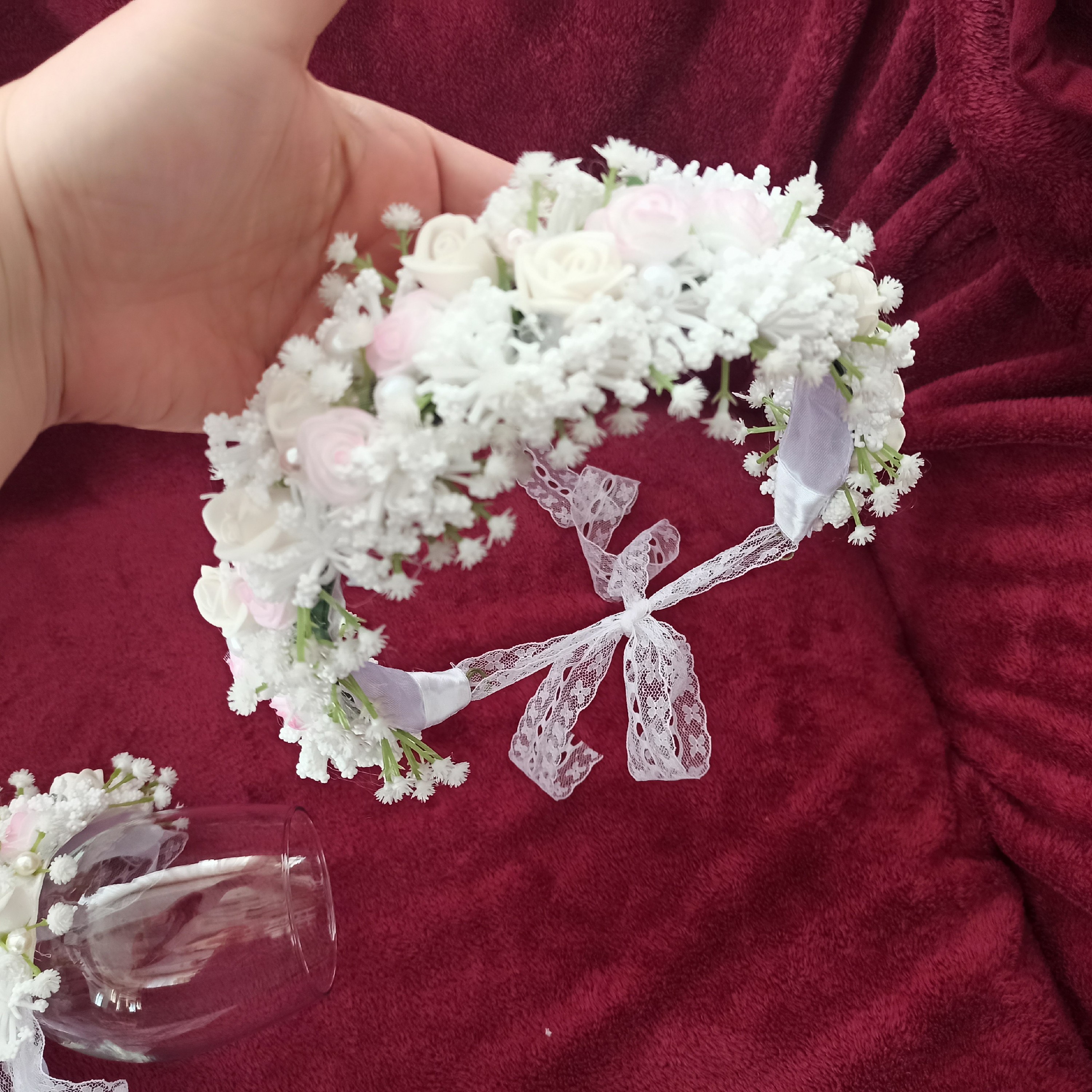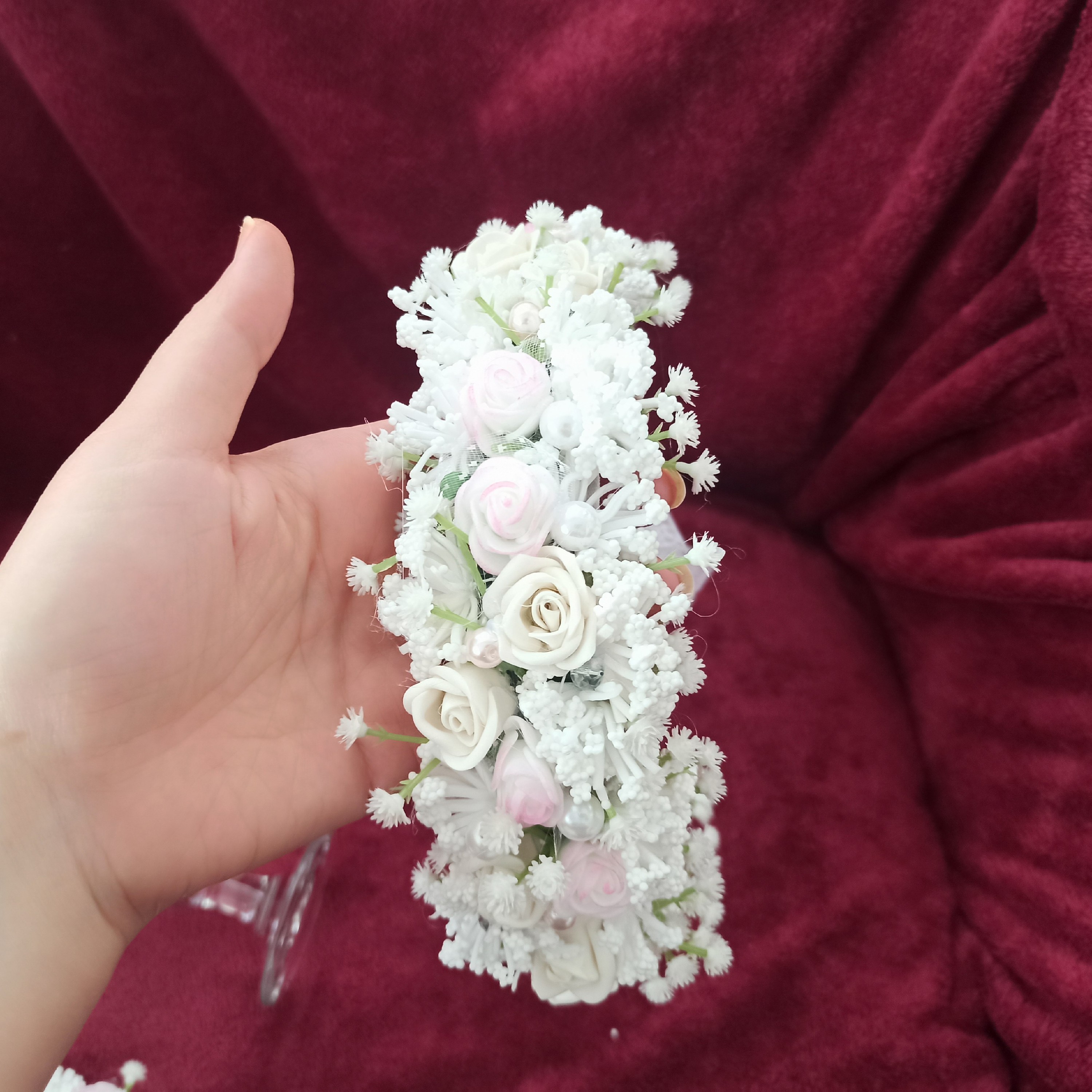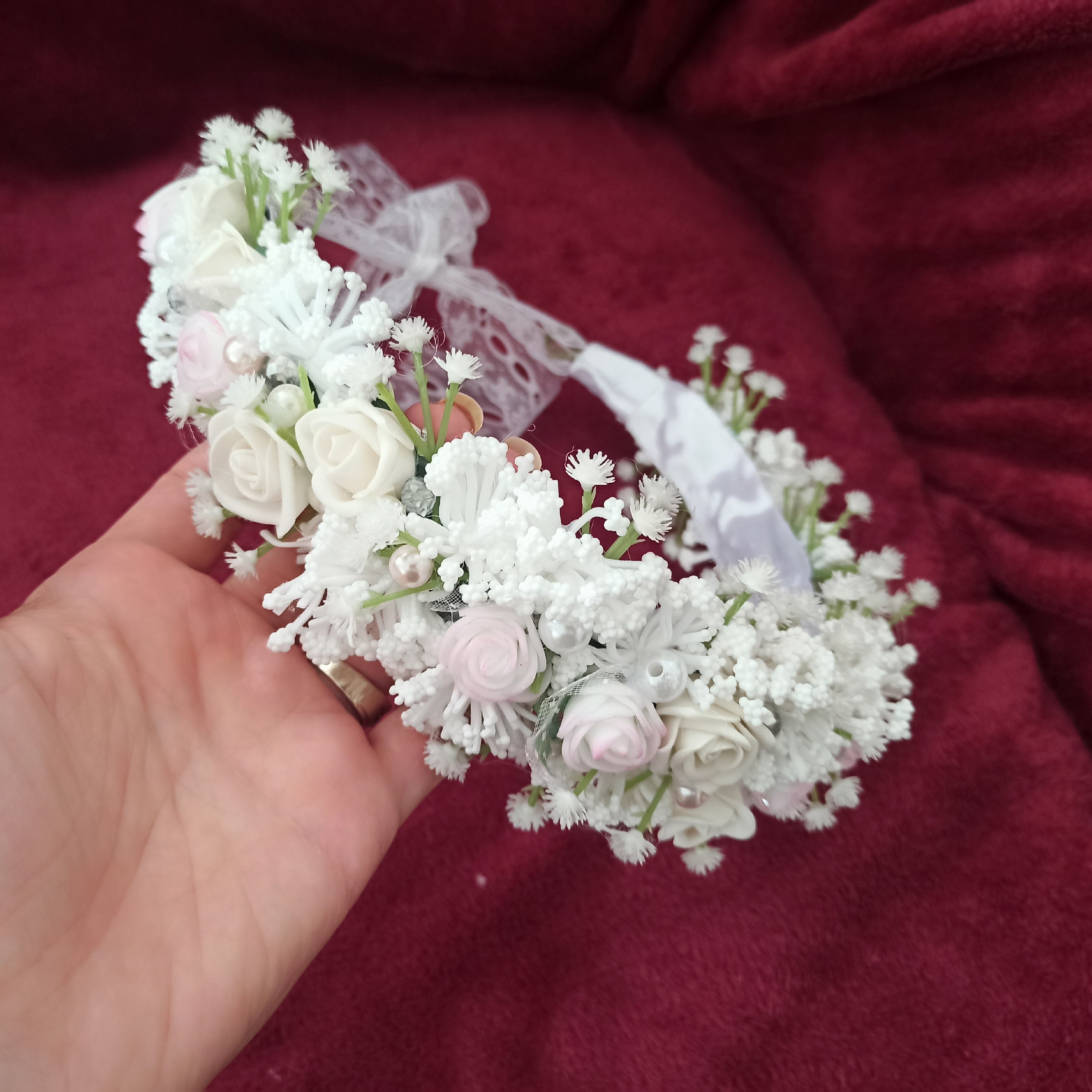 تاج گل ودستبند گل عروس مناسب عقد نامزدی فرمالیته عروسی حنابندان آتلیه 🌼🌺 تزیین شده با گل فومی ، گل ژیپسوفیلا ومروارید و کریستال وتور وروبان 🎀