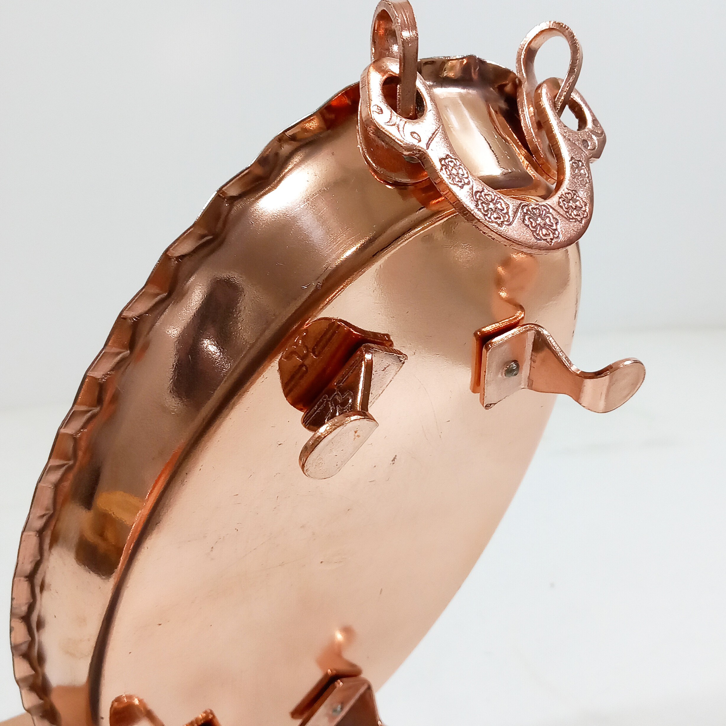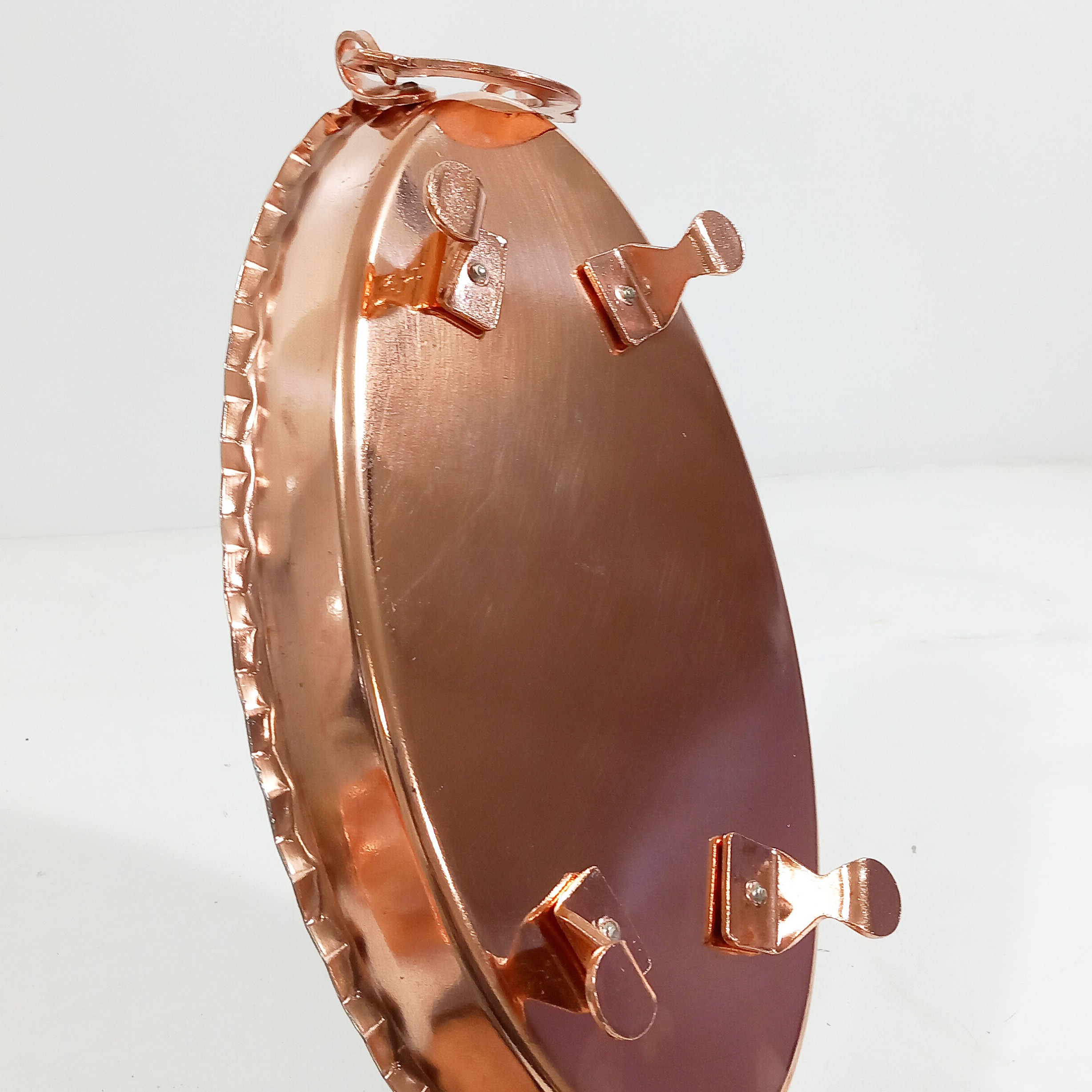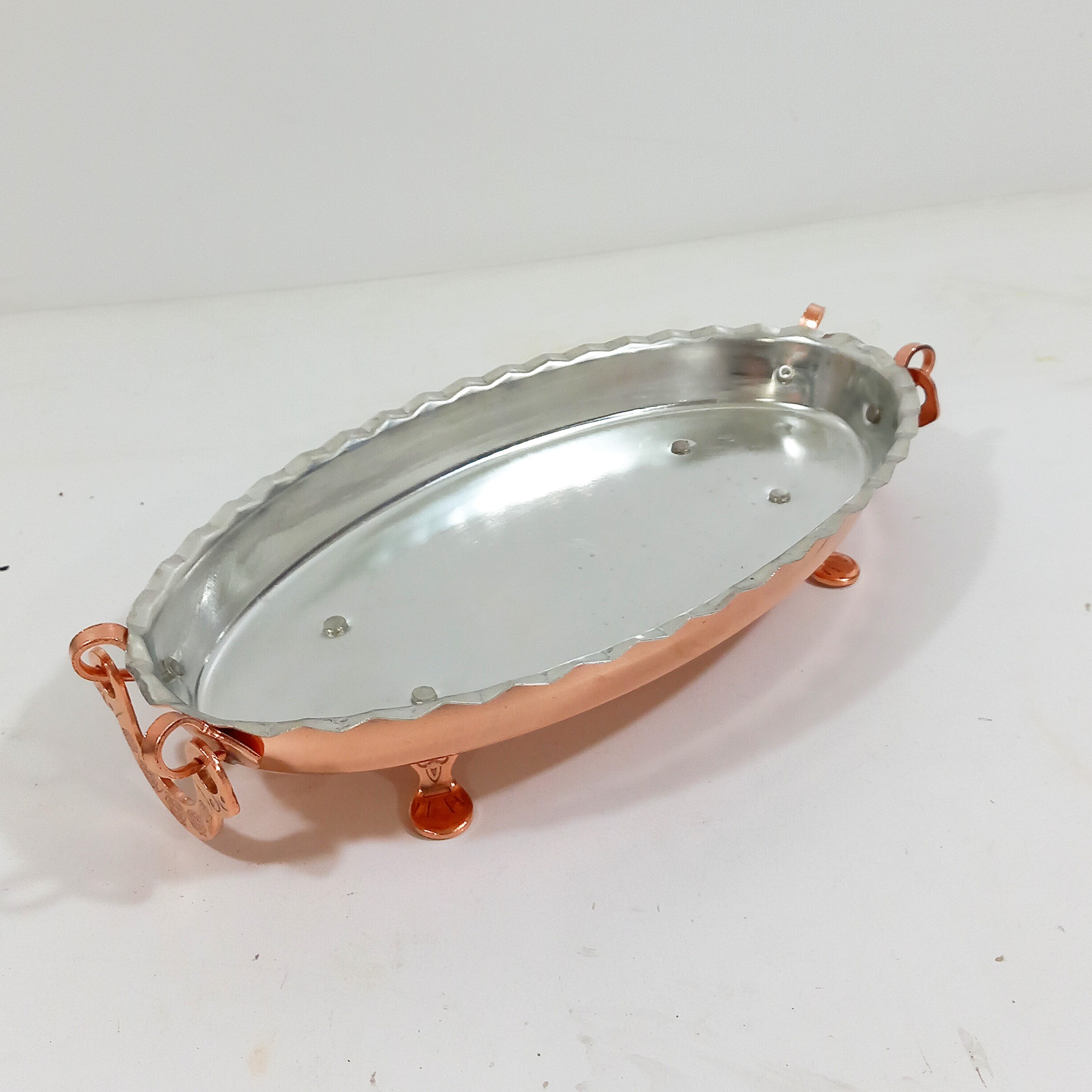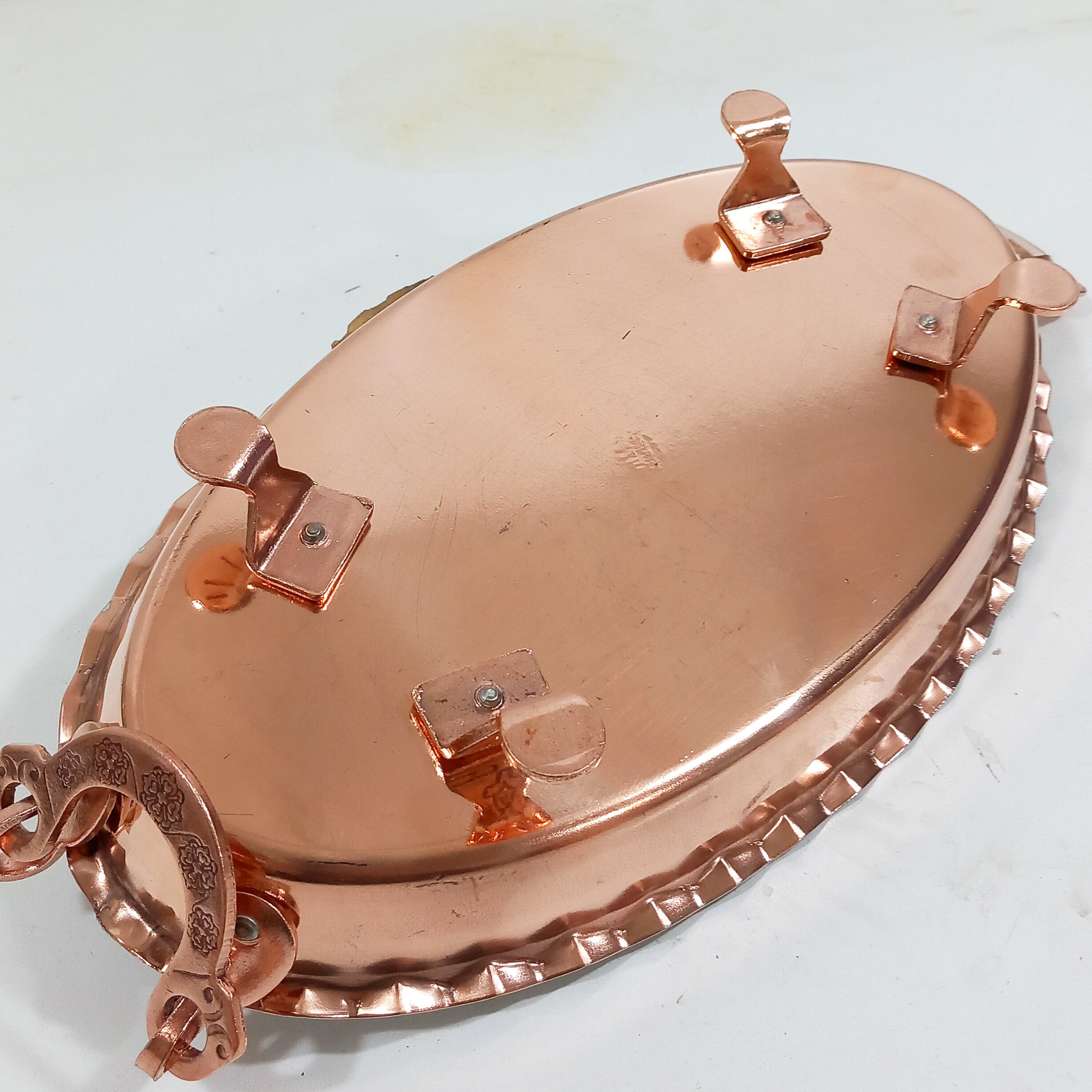 مرغ خوری دو عددی جفتی یا ظرف پلو بیضی دسته و پایه دار طول 35 سانتی متر در عرض 20 داخل قلع کاری شده بیرون محصول نانو شده و رنگ ثابت ساخته شده از ورق مسی ضخیم و درچه یک زنجان جنس دسته و پایه ها مس
