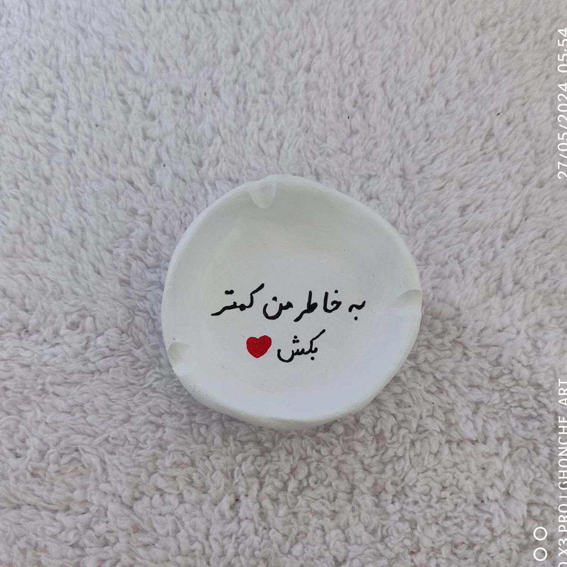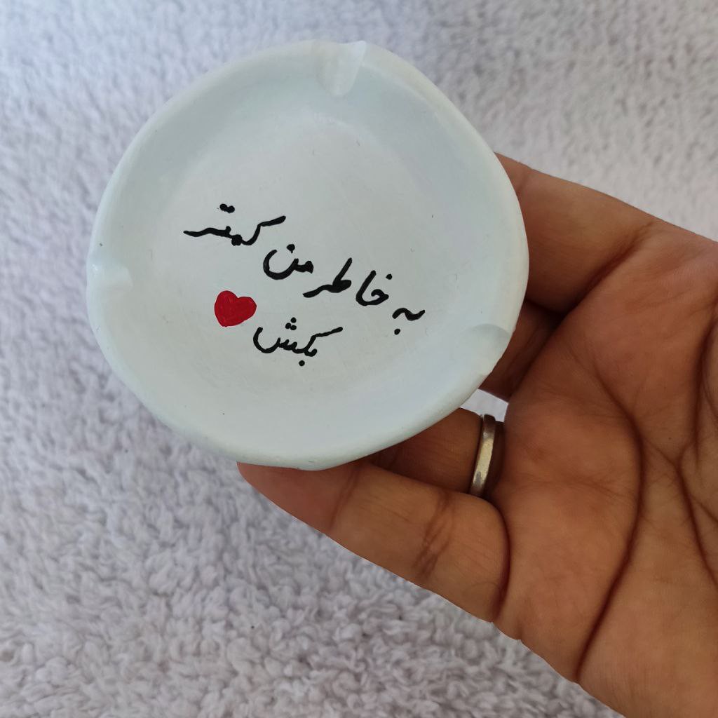 زیر سیگاری دفرمه کوچک رنگ شده با متن «به خاطر من کمتر بکش❤️» جنس سنگ مصنوعی اندازه : ضخامت خارجی 2 سانت گودی داخلی 1.5 سانت قطر 7.3 سانت قابل شستشو و قابل سفارش در رنگ و متن دلخواه