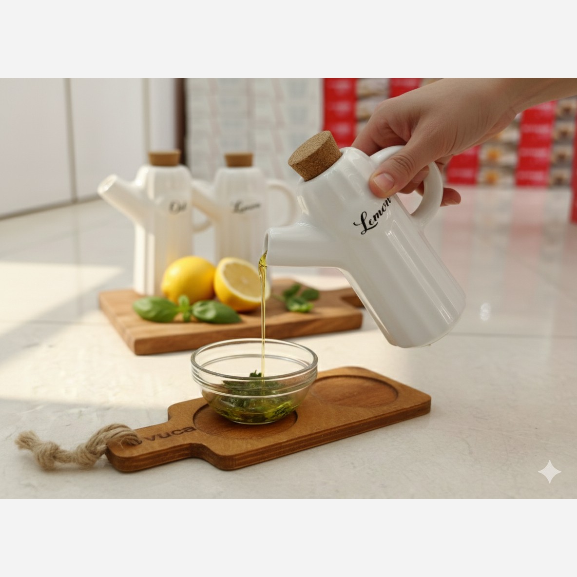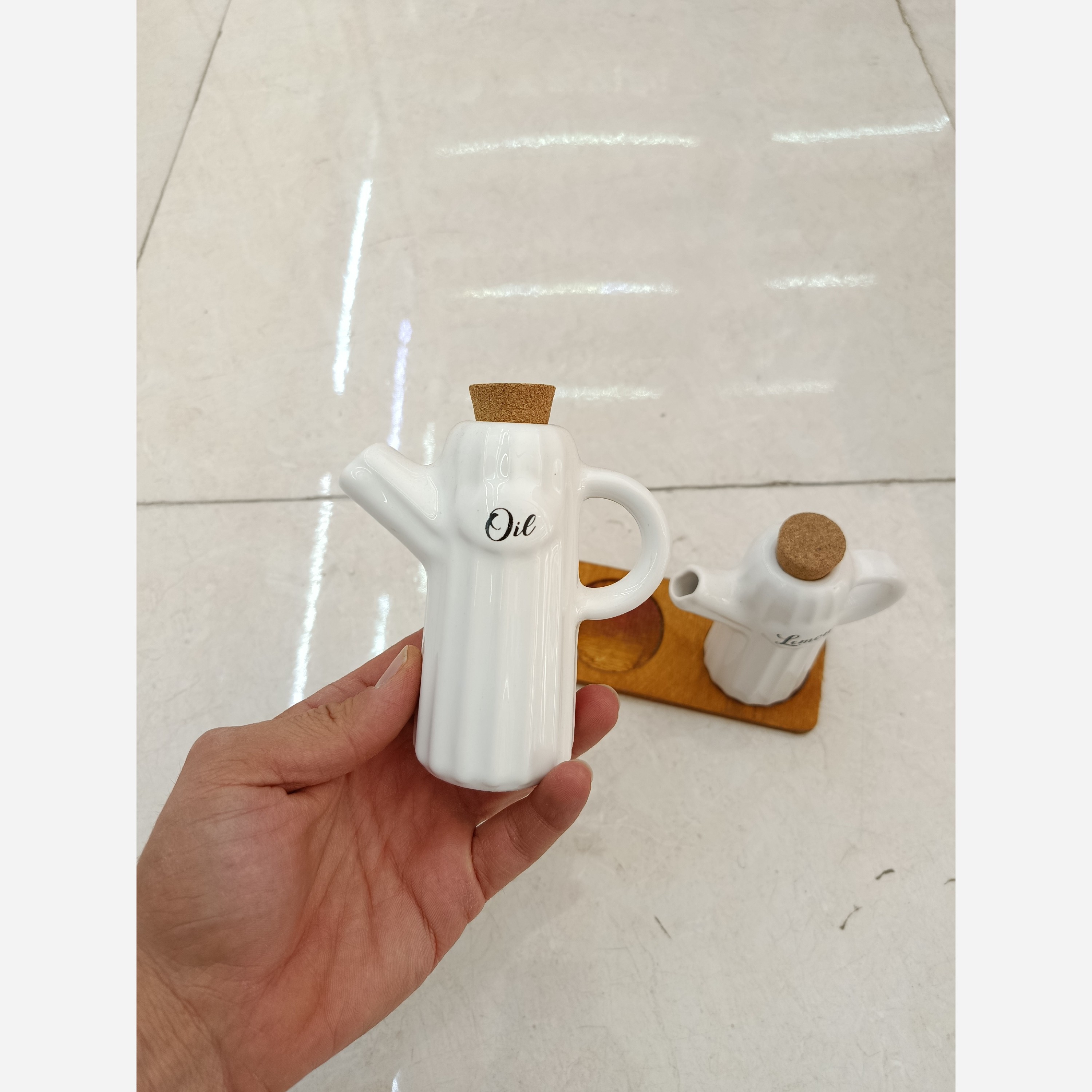 ست آبلیمو خوری و روغن به همراه زیره چوبی درب چوبی وجود رگه یا نقطه روی محصول در بعضی موارد طبیعی میباشد اختلاف رنگ زیره محصول به دلیل جنس چوبی طبیعی میباشد