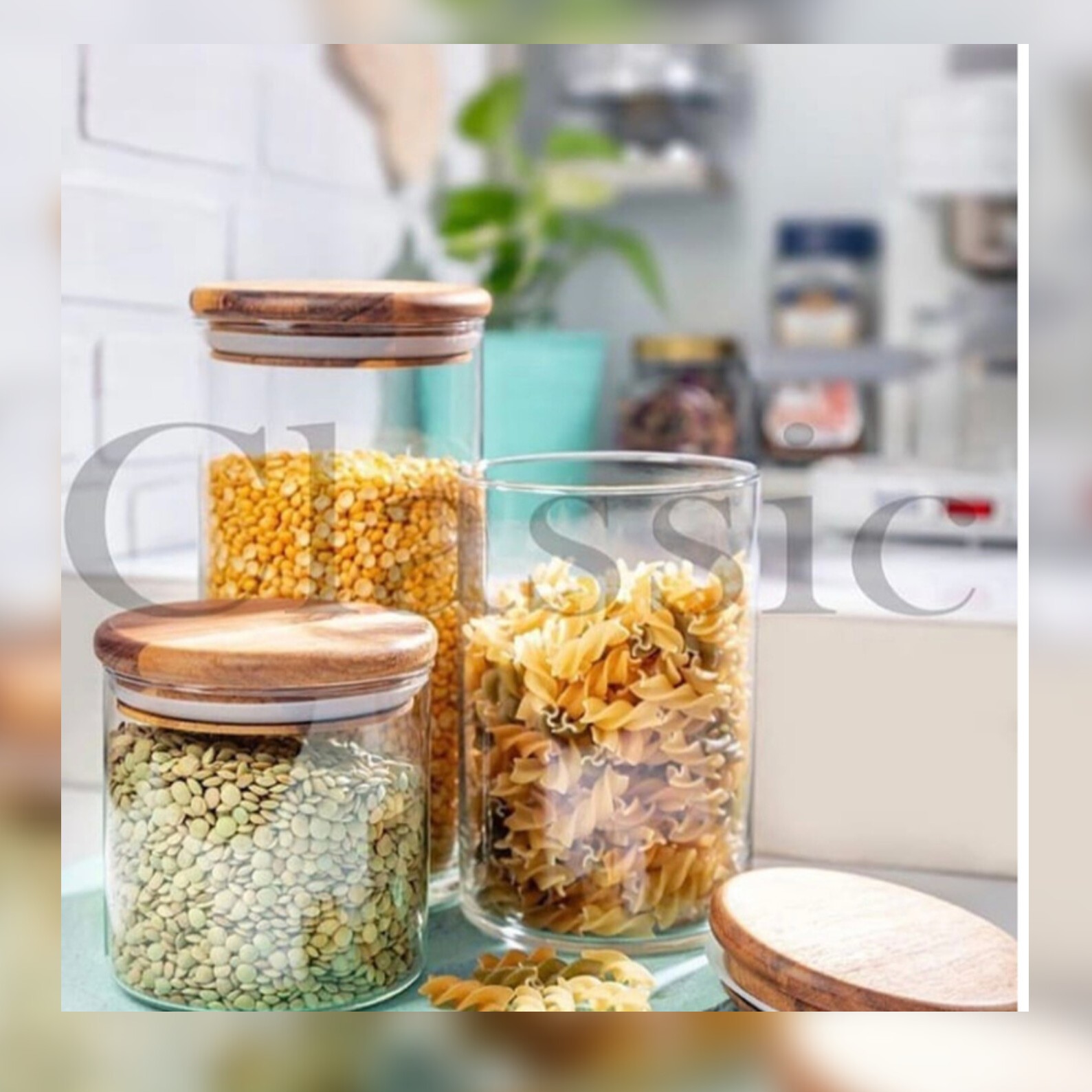 اندازه های مختلف و طرح های زیبا با درب های محکم و نما و دکوری لوکس به فضای آشپزخانه. می توان میوه خشک، انواع پاستیل یا شکلات را درون بانکه های شیشه ای ریخت و روی اپن گذاشت که زیبایی خاصی نیز به فضا می بخشد. علاوه بر این میتوان از آنها به منظور نظم بخشیدن به کابینتها و دیزاین فضای آشپزخانه استفاده کرد. یک جذابیت خاص ظروف شیشه ای این است که داخل آنها دیده میشود ترکیبات بکار رفته در ساخت این مدل با مواد غذایی داخلش واکنشی نداده و باعث تغییر عطر و طعم آن نمیشود.بنابراین به لحاظ بهداشت و سلامت،استاندارد است. این ست دوستداشتنی بدنهای شفاف از جنس شیشه دارد با درب های چوبی.