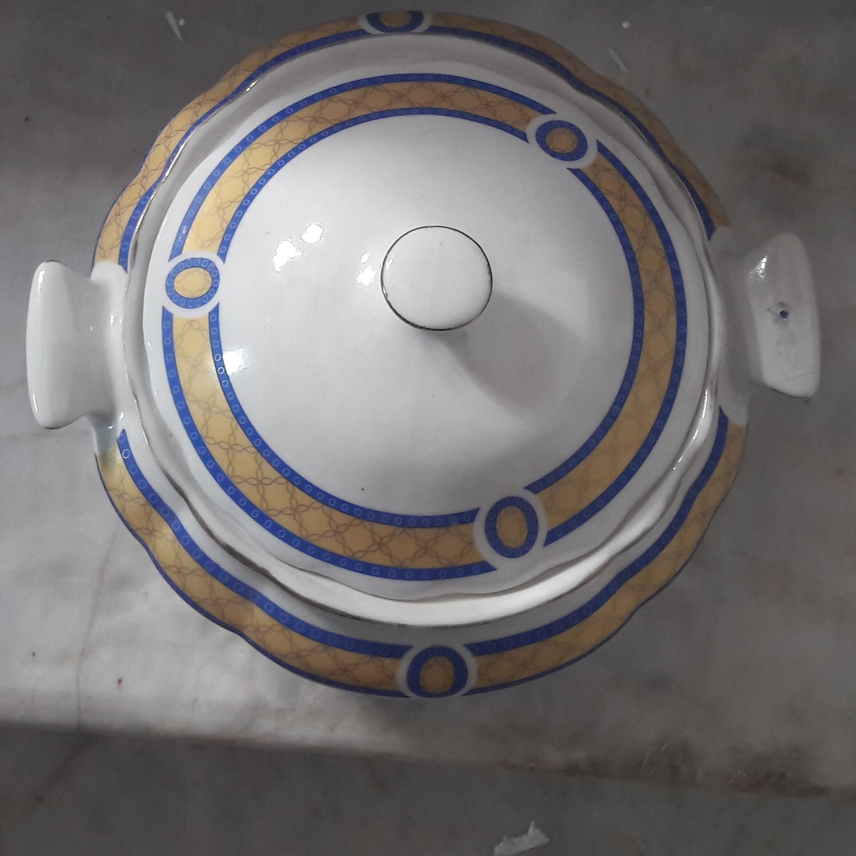 سوپخوری چینی آبی و طلایی بسیار زیبا و قیمت مناسب ترک لعابی تو قسمت کف زیرین از بیرون داره کاملا سالم هست با قیمت بسیار مناسب و ارسال رایگان