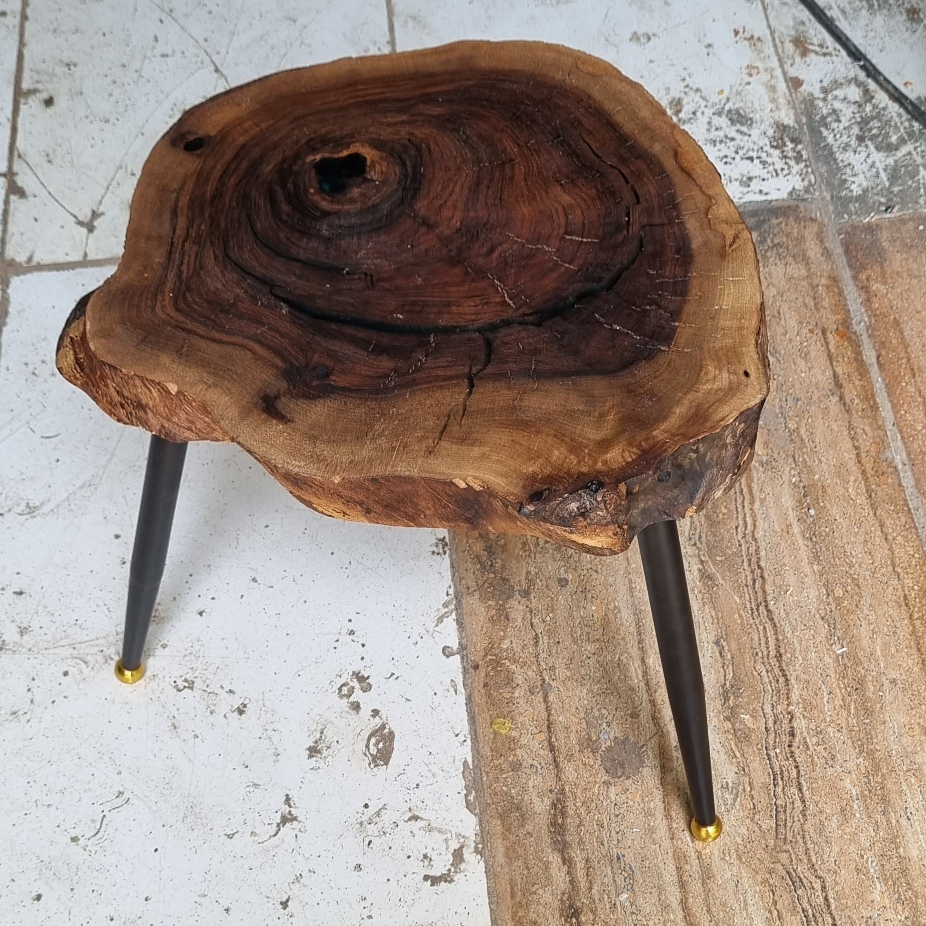 میز عسلی روستیک چوب گردو ارتفاع 45 چوب و رزین شفاف پایه فلزی مشکی طلایی