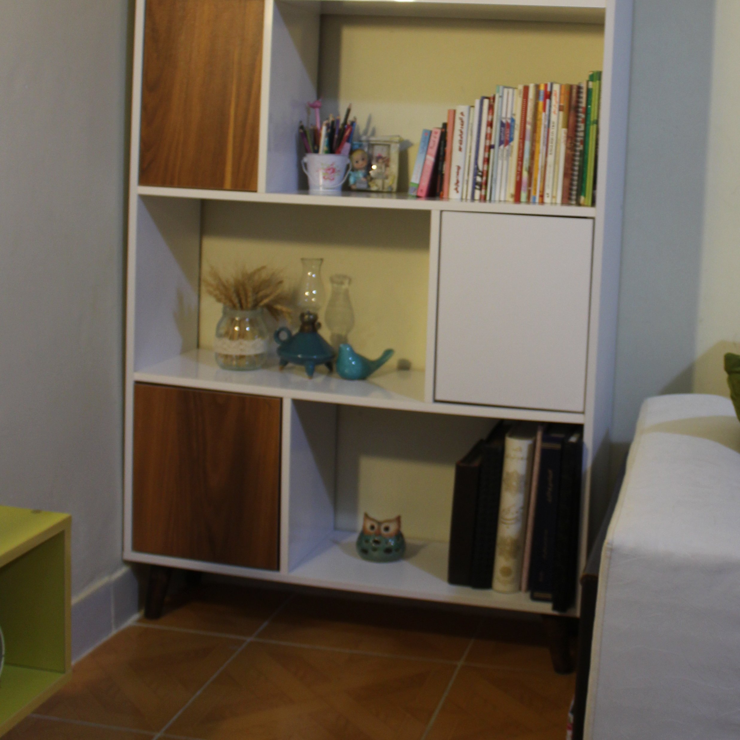 کتابخانه سیمین در دو رنگ سفید و گردویی با پایه های کوتاه مبلمونسرا مدل 236750