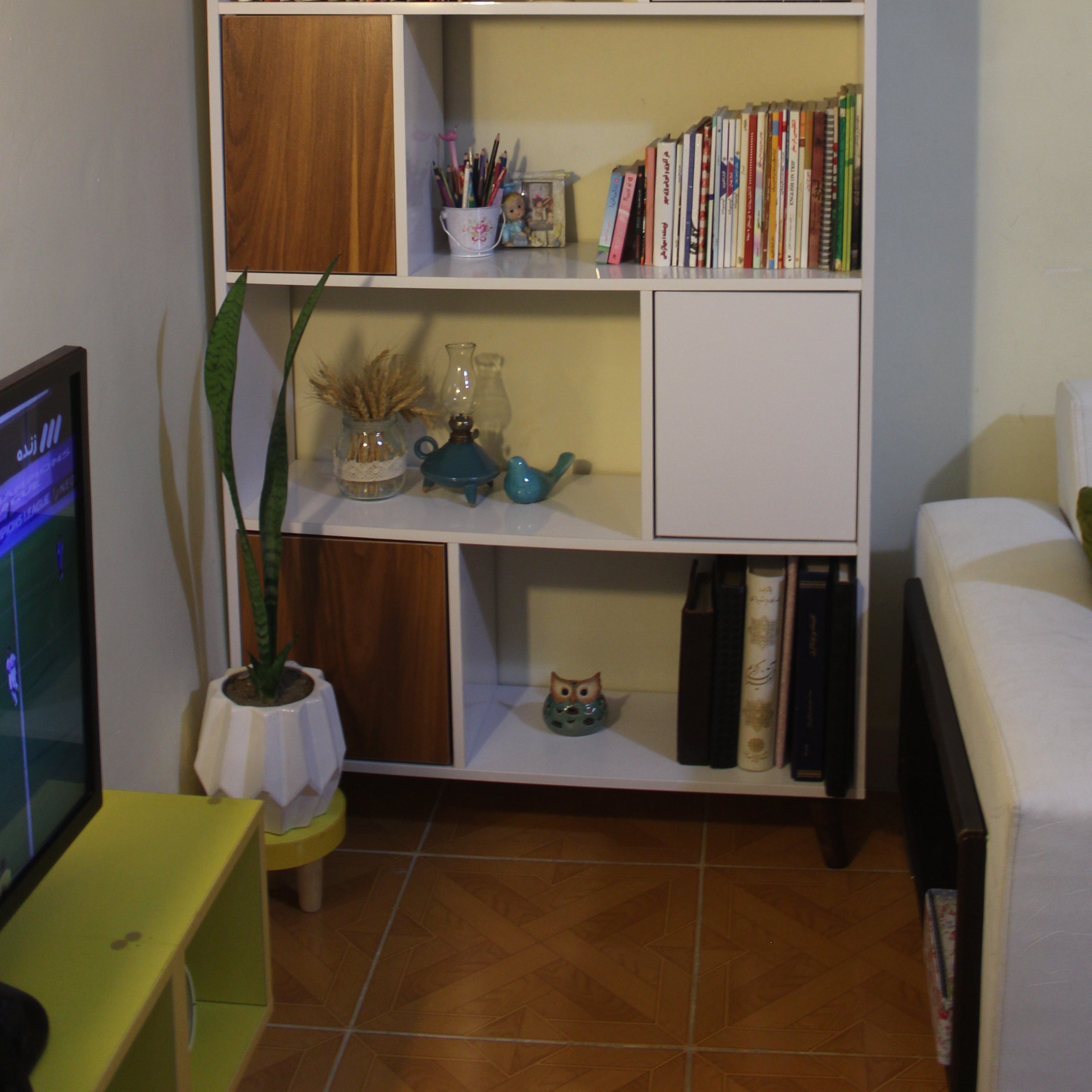 کتابخانه سیمین در دو رنگ سفید و گردویی با پایه های کوتاه ده سانتی زیا وجادار