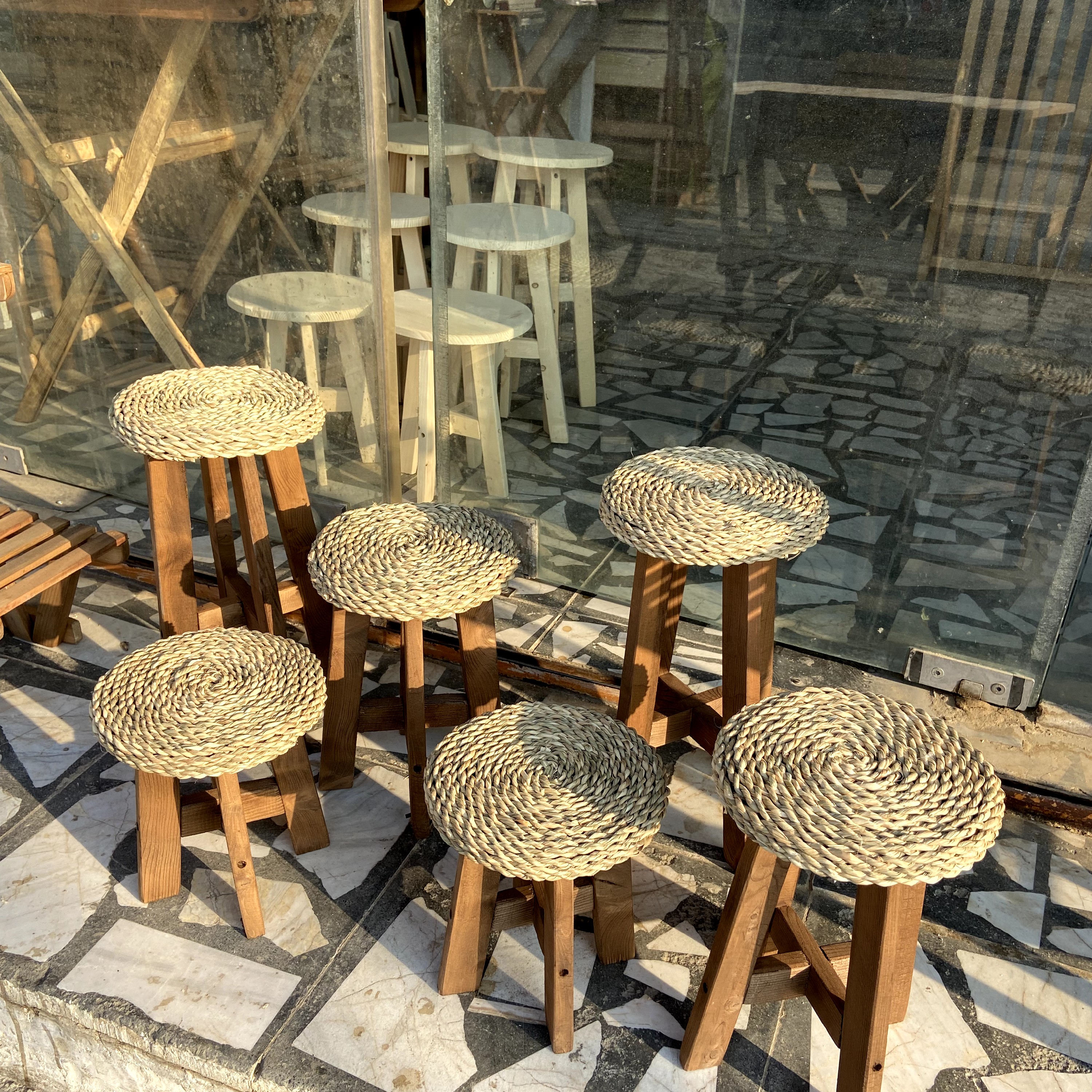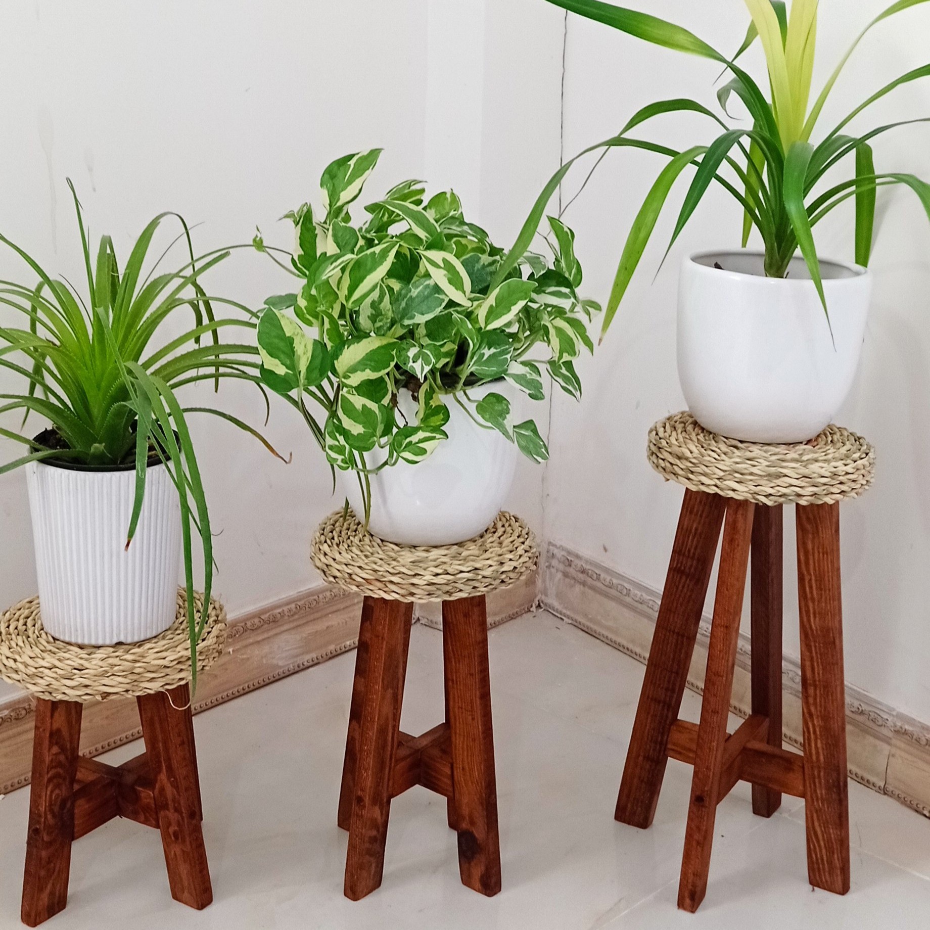 پایه گرد ست سه تایی ترکیب حصیر و چوب ارتفاع ۲۵ ۳۳ ۴۰ قطر ۲۰سانت در دو رنگ قهوه ای تیره و روشن