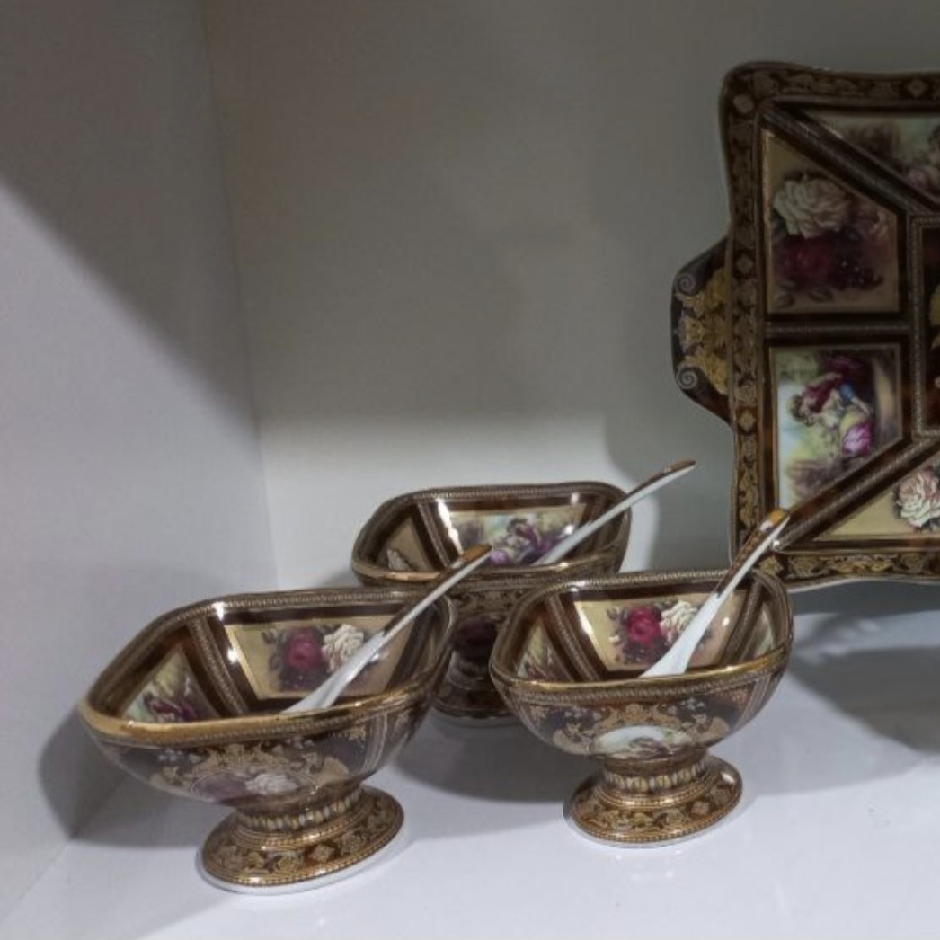 ست خاص و زیبا برای خوش سلیقه ها سرویس بستنی خوری شش نفره دارای جعبه کیفت باکس 6 عدد پیاله پایه دار چینی 6 عدد قاشق یک سینی مناسب خانم ها و نو عروس های با سلیقه