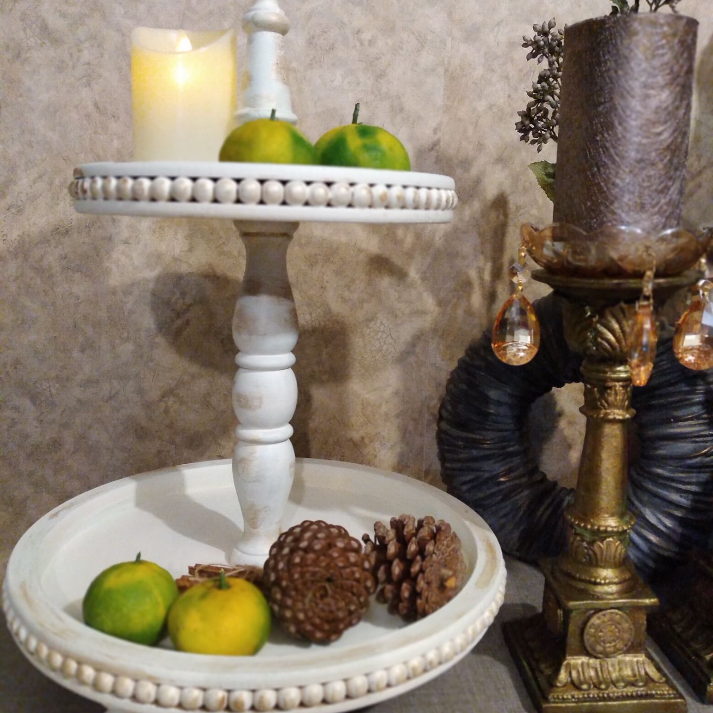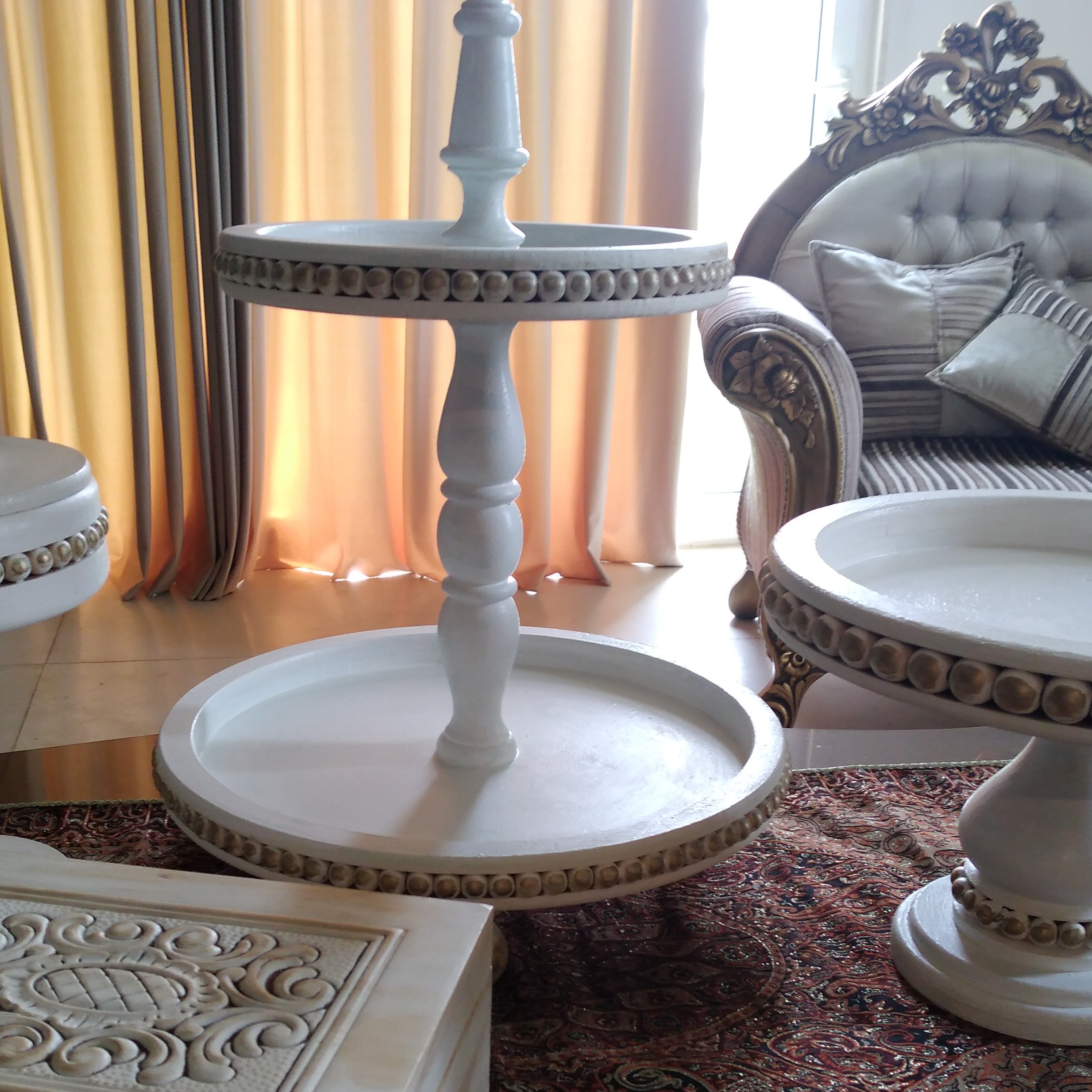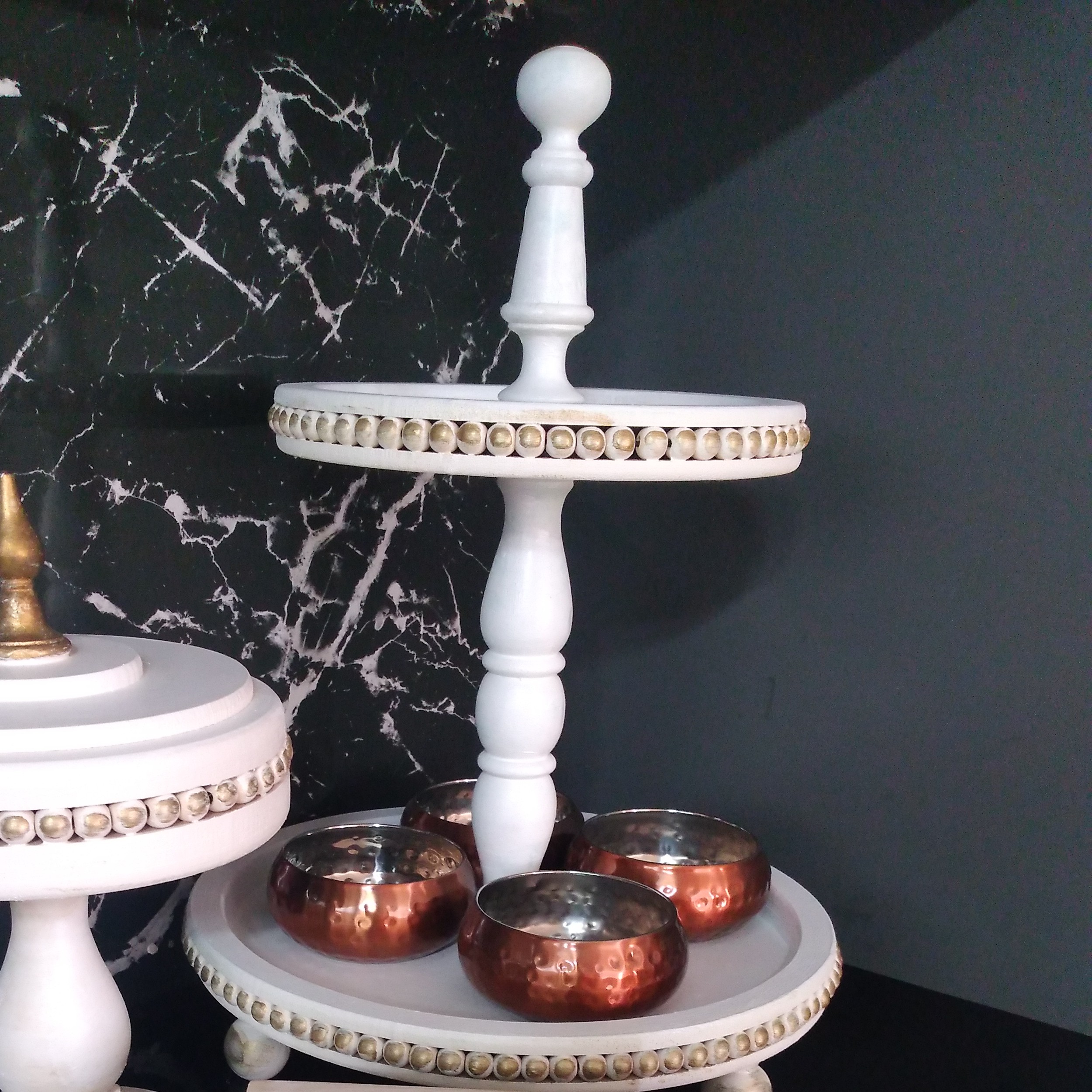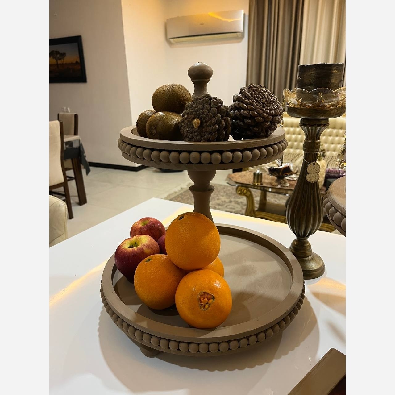 استند چوبی دو طبقه مهره دار قطر صفحه پایین سی و شش و قطر صفحه بالا بیست و شش سانت و ارتفاع کل پنجاه و چهار سانت قابل اجرا در رنگ دلخواه لطفا و حتماا اسلایدها را ورق بزنید و تنوع رنگ محصول را مشاهده بفرمایید ست کامل محصولات چوبی پذیرایی قابل سفارش است تک تک اقلام در اسلایدها قابل سفارشند