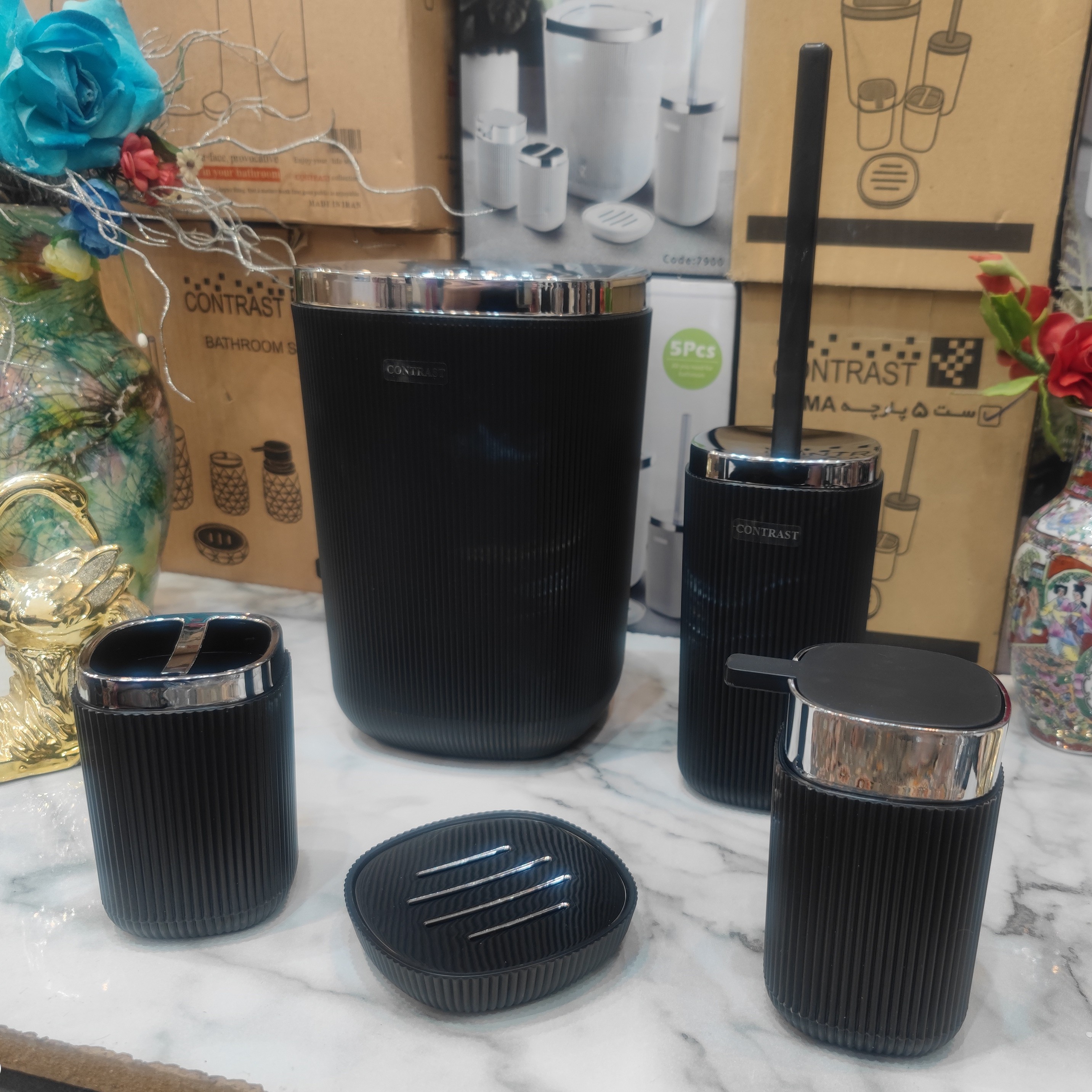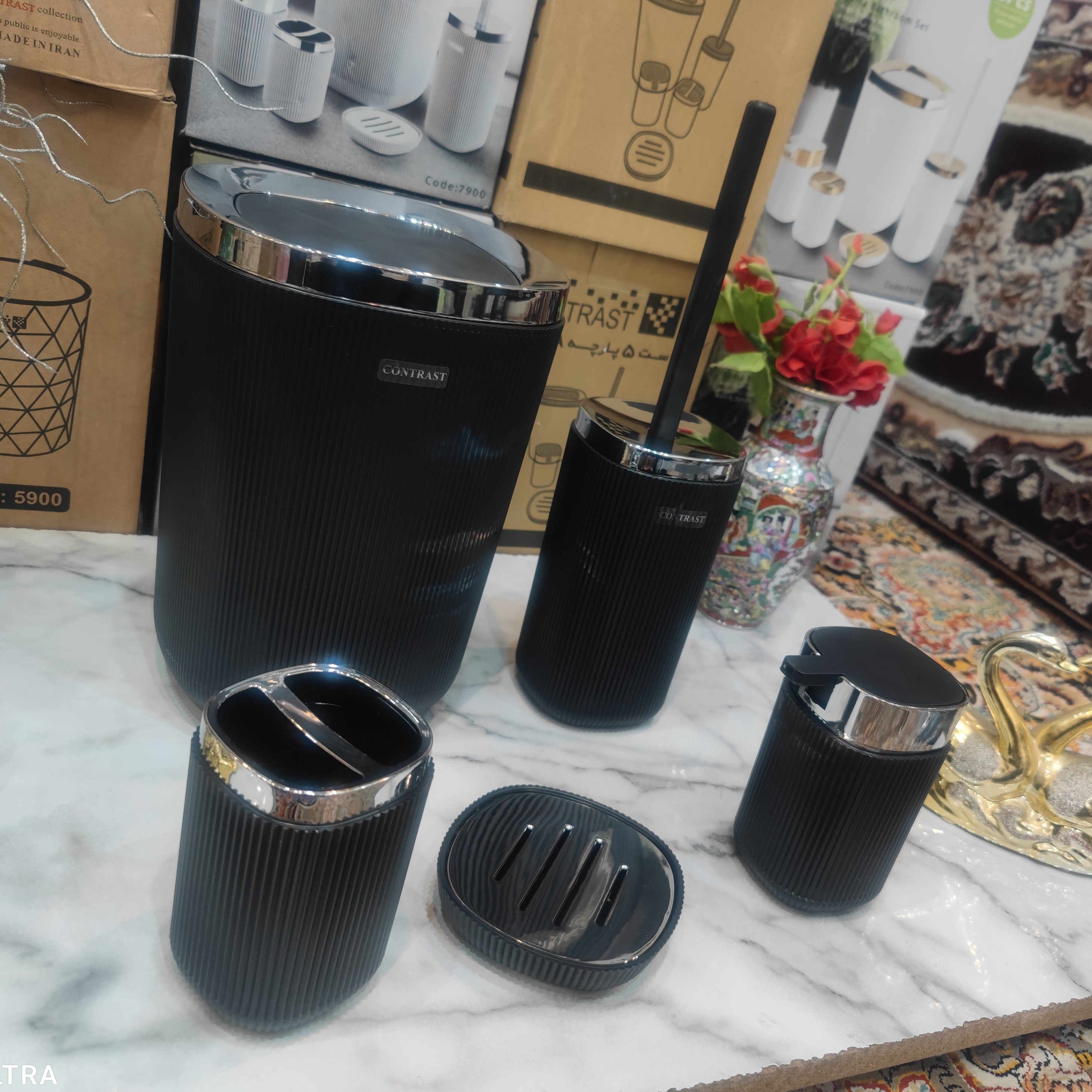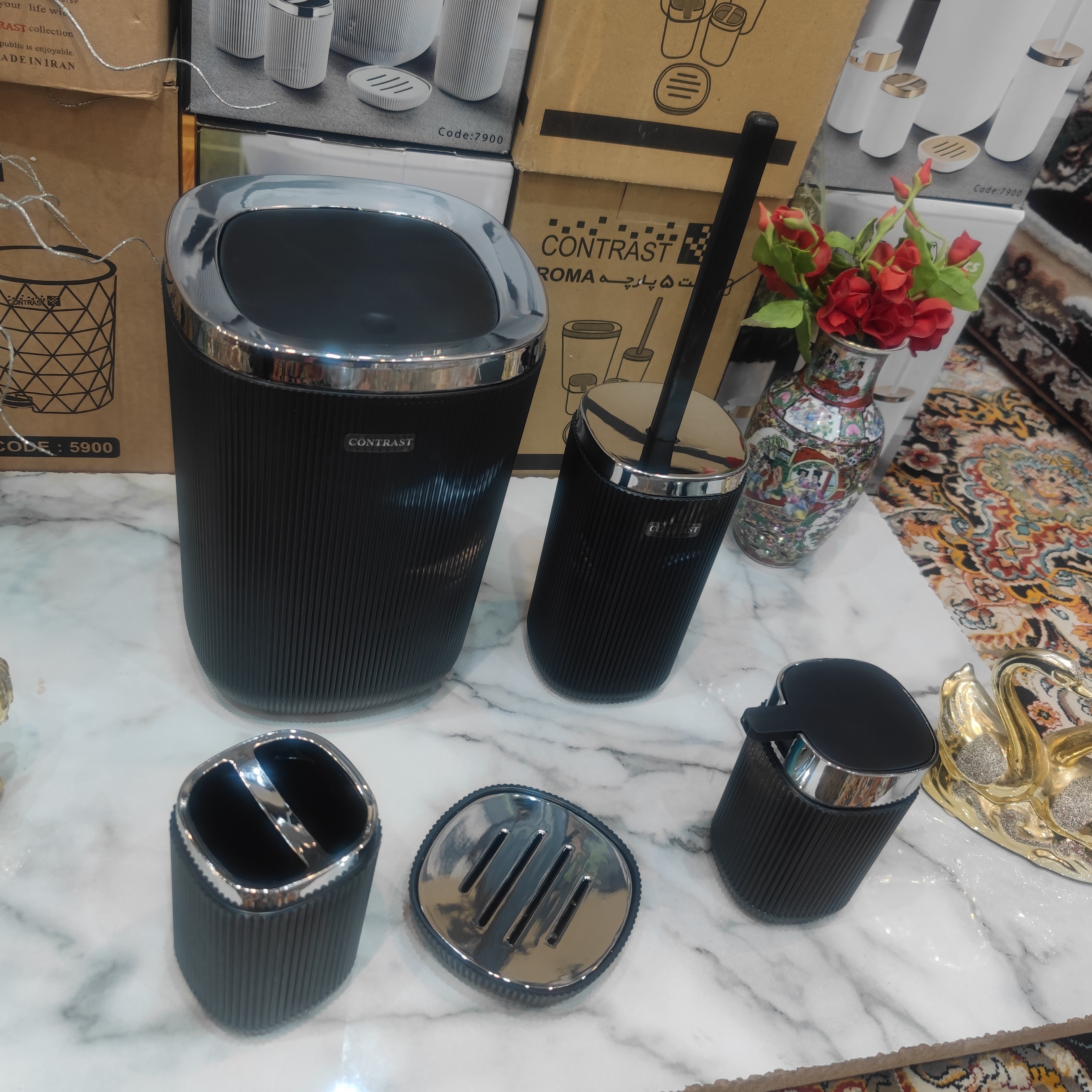 ست سرویس بهداشتی 5 پارچه طرح روما خطی رنگ زیبا و شکیل مشکی کروم برند کنتراست نو آکبند طرح جدید قیمت عالی واقتصادی مبلمونسرا مدل 265499