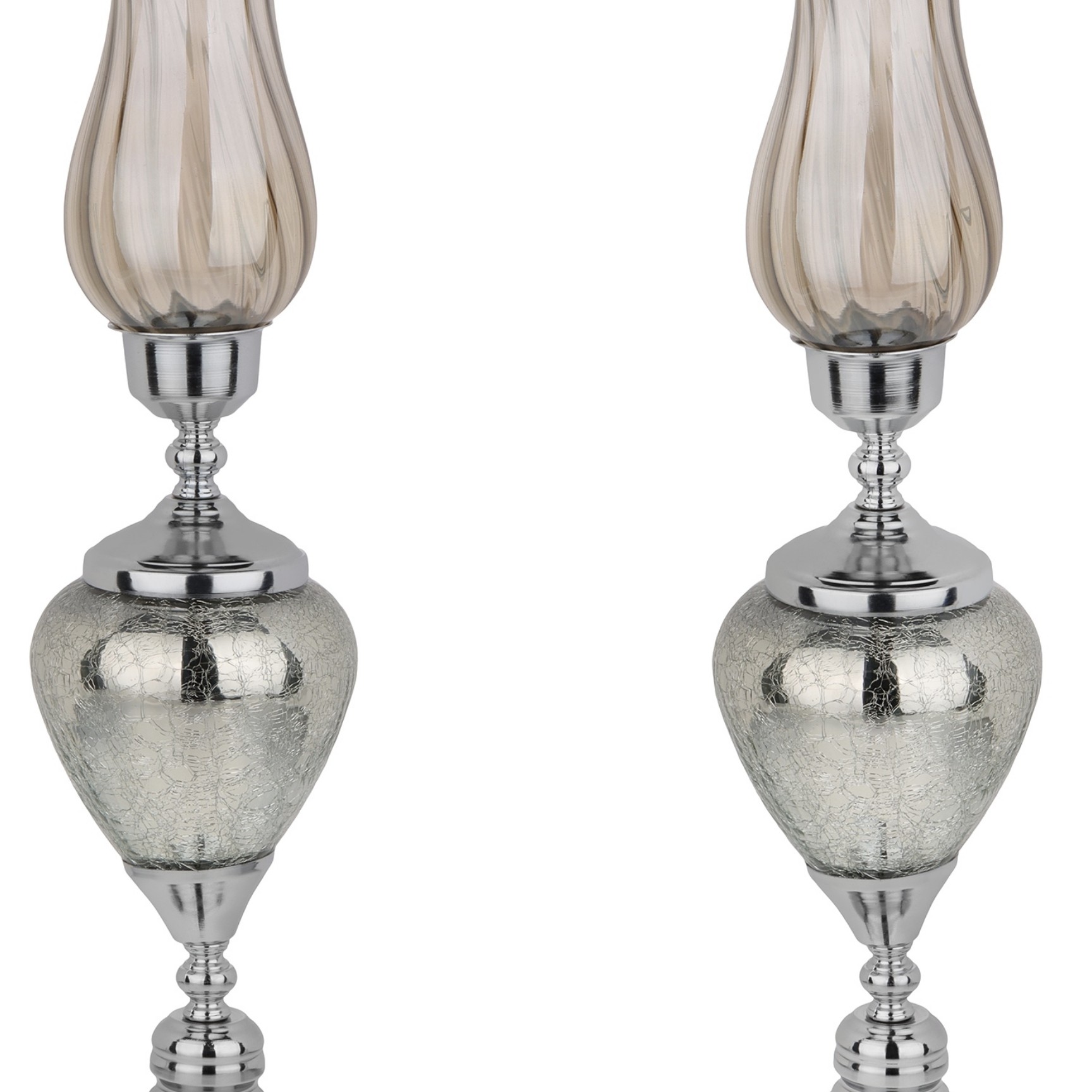 شمعدان جفتی در رنگهای طلایی. نقرهای و کرم میباشد. جنس پایه از. آهن آبکاری شده میباشد و جنس بدنه از شیشه ترک خورده ابگز میباشد . هزینه ارسال با مشتری میباشد. میباشد